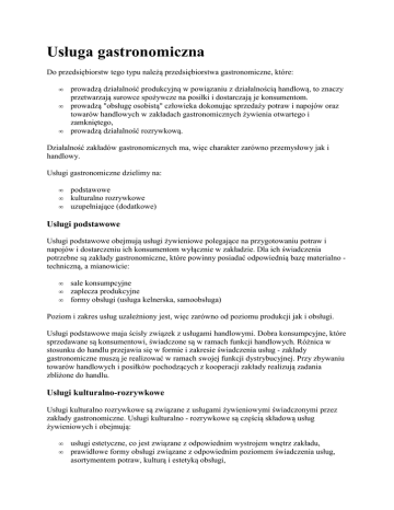 Usługa gastronomiczna Do przedsiębiorstw tego typu należą przedsiębiorstwa gastronomiczne, które: • • • prowadzą działalność produkcyjną w powiązaniu z działalnością handlową, to znaczy przetwarzają surowce spożywcze na posiłki i dostarczają je konsumentom. prowadzą "obsługę osobistą" człowieka dokonując sprzedaży potraw i napojów oraz towarów handlowych w zakładach gastronomicznych żywienia otwartego i zamkniętego, prowadzą działalność rozrywkową. Działalność zakładów gastronomicznych ma, więc charakter zarówno przemysłowy jak i handlowy. Usługi gastronomiczne dzielimy na: • • • podstawowe kulturalno rozrywkowe uzupełniające (dodatkowe) Usługi podstawowe Usługi podstawowe obejmują usługi żywieniowe polegające na przygotowaniu potraw i napojów i dostarczeniu ich konsumentom wyłącznie w zakładzie. Dla ich świadczenia potrzebne są zakłady gastronomiczne, które powinny posiadać odpowiednią bazę materialno techniczną, a mianowicie: • • • sale konsumpcyjne zaplecza produkcyjne formy obsługi (usługa kelnerska, samoobsługa) Poziom i zakres usług uzależniony jest, więc zarówno od poziomu produkcji jak i obsługi. Usługi podstawowe maja ścisły związek z usługami handlowymi. Dobra konsumpcyjne, które sprzedawane są konsumentowi, świadczone są w ramach funkcji handlowych. Różnica w stosunku do handlu przejawia się w formie i zakresie świadczenia usług - zakłady gastronomiczne muszą je realizować w ramach swojej funkcji dystrybucyjnej. Przy zbywaniu towarów handlowych i posiłków pochodzących z kooperacji zakłady realizują zadania zbliżone do handlu. Usługi kulturalno-rozrywkowe Usługi kulturalno rozrywkowe są związane z usługami żywieniowymi świadczonymi przez zakłady gastronomiczne. Usługi kulturalno - rozrywkowe są częścią składową usług żywieniowych i obejmują: • • usługi estetyczne, co jest związane z odpowiednim wystrojem wnętrz zakładu, prawidłowe formy obsługi związane z odpowiednim poziomem świadczenia usług, asortymentem potraw, kulturą i estetyką obsługi, • • usługi rozrywkowe świadczone na rzecz konsumenta, właściwą informację i reklamację w zakresie asortymentu potraw i napojów, form obsługi działalności rozrywkowej, kultury fizycznej, publicystyki. Działalność ta powinna być prowadzona kompleksowo, ponieważ stanowi podstawowy element zabezpieczający odpowiedni poziom usług w zakładach gastronomicznych. Usługi kulturalno - rozrywkowe powinny dostarczać konsumentom trwałych przeżyć pozwalających na regeneracje sił. Dlatego usługi te powinny być świadczone na wysokim poziomie. Usługi żywieniowe niewsparte usługami kulturalno - rozrywkowymi bez względu, na jakość potraw nie osiągają swojego celu. Usługi kulturalno - rozrywkowe maja charakter dóbr duchowych i oddziaływują w sposób zasadniczy na popyt i podaż usług żywieniowych. Usługi uzupełniające Usługi uzupełniające są związane z czynnościami wykonywanymi przez zakład gastronomiczny w celu pośredniego lub bezpośredniego obsłużenia konsumentów na zewnątrz zakładu. Do usług tych zalicza się: • • • • • • zaopatrzenie innych zakładów w produkcję gastronomiczną, sprzedaż potraw na wynos, organizowanie przyjęć dziennych, weselnych i innych u zleceniodawcy, dostarczenie posiłków do zakładów pracy, usługi związane z przechowywaniem garderoby, usługi higieniczne. Usługi te należy rozwijać w zakładach gastronomicznych kompleksowo. Pojęcie i zakres usług rozszerza się w miarę rozwoju postępu technicznego i organizacyjnego w gospodarce narodowej. Zakłady gastronomiczne powinny świadczyć usługi na rzecz ludności w miejscach zamieszkania, centrach handlowych, w ośrodkach turystyczno - wczasowych, w zakładach pracy itd. Kategorie zakładów gastronomicznych Zakłady i punkty gastronomiczne podlegają zaszeregowaniu do określonych kategorii handlowych: Zakłady typu żywieniowego • • • • • restauracje bistra i jadłodajnie bary wagony restauracyjne i restauracje żeglugowe bary wagonowe Zakłady typu uzupełniającego • • bary rozrywkowe kawiarnie • • bary aperitif cukiernie i piwiarnie Punkty gastronomiczne W celu świadczenia usług gastronomicznych organizuje się także punkty gastronomiczne. Punkty te dzielą się również na określone kategorie: • • • • punkty gastronomiczne bufety turystyczne bufety żeglugowe bufety wagonowe Zaszeregowanie zakładu gastronomicznego do odpowiedniej kategorii handlowej jest uzależnione od: • • • • • lokalizacji i rozwiązań projektowych, zwłaszcza pomieszczeń części handlowej, standardu wystroju i wyposażenia, a w szczególności sal konsumpcyjnych, asortymentu i jakości wyrobów kulinarnych i ciastkarskich oraz towarów handlowych, organizacji, techniki i poziomu obsługi, kwalifikacji personelu, -* stanu sanitarnego. Do zakładów i punktów gastronomicznych nie zalicza się ruchomej sprzedaży wyrobów kulinarnych i ciastkarskich oraz towarów handlowych, prowadzonej w formie przenośnej, obwoźnej i odnośnej. Bibliografia • Ryszard Jargoń - "Organizacja i technika usług gastronomicznych", Wydawnictwo Szkolne i pedagogiczne Warszawa 1977