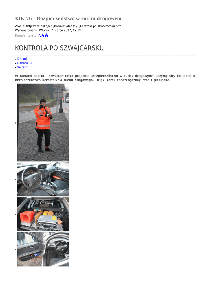 KIK 76 - Bezpieczeństwo w ruchu drogowym Źródło: http://brd.policja.pl/brd/aktualnosci/1,Kontrola-po-szwajcarsku.html Wygenerowano: Wtorek, 7 marca 2017, 02:19 Rozmiar tekstu: A A A KONTROLA PO SZWAJCARSKU ■ ■ ■ Drukuj Generuj PDF Wstecz W ramach polsko - szwajcarskiego projektu „Bezpieczeństwo w ruchu drogowym” uczymy się, jak dbać o bezpieczeństwo uczestników ruchu drogowego. Dzięki temu zaoszczędzimy czas i pieniądze. ■ ■ ■ ■ ■ ■ Ważnym elementem przeciwdziałania wypadkom w każdym kraju są kontrole drogowe, technika ich przeprowadzania oraz wykorzystywany sprzęt. Podczas wizyty studyjnej w Szwajcarii widzieliśmy, jak to wygląda w praktyce. SPRAWDZENIE ON LINE Na wyjeździe z Zurychu takie kontrole są ustawiane wieczorami lub gdy odbywają się imprezy masowe. Wtedy wyjeżdża sporo ludzi mogących być pod wpływem alkoholu, środków odurzających lub będących na bakier z prawem. Jeszcze zanim kierowca zobaczy policjantów, na poboczu mija nieoznakowany radiowóz z policjantem i skanerem tablic rejestracyjnych. Zadaniem policjanta jest zwracanie uwagi na niewłaściwe zachowania kierowców, jak np. rozmowa przez telefon, czytanie gazety czy jedzenie. Gdy policjant zauważy takie przewinienie, informuje kolegów stojących dalej. Skaner skanuje numery takiego auta i przekazuje je do bazy danych. Odbywa się to automatycznie, bez udziału człowieka, więc też bardzo szybko. W bazie danych komputer sprawdza, czy właściciel auta ma konflikt z prawem. Czy obciążają go jakieś niezapłacone mandaty, czy ubezpieczenie OC jest zapłacone, czy zostało zabrane mu prawo jazdy. Co ciekawe, komputer sprawdza także dane o osobach zameldowanych pod tym samym adresem co właściciel. Z założenia każda z nich może prowadzić pojazd. Jeśli sprawdzenie wykaże jakąś wątpliwość, informacja natychmiast jest przekazywana do policjantów, którzy zatrzymują pojazd do kontroli szczegółowej. W pewnej odległości od nieoznakowanego auta, za zakrętem lub wiaduktem, zorganizowany jest kolejny etap kontroli. Na jezdni ustawione są pachołki zwężające drogę do jednego pasa ruchu. Kierowca napotyka tam dwóch umundurowanych policjantów i radiowóz z włączonymi światłami błyskowymi. Policjanci wstępnie weryfikują pojazdy do kontroli szczegółowej. Zwracają uwagę na zachowanie kierowców oraz na ogólny stan techniczny aut. Wychwycone auta są kierowane do miejsca, gdzie czeka kilka załóg gotowych do szczegółowego sprawdzenia kierujących. Podczas kontroli policjanci stoją po obu stronach kontrolowanego samochodu. Policjant będący po lewej stronie stoi lekko z tyłu, aby nie zostać uderzony drzwiami przez wysiadającego kontrolowanego. Podczas sprawdzania dokumentów policjant korzysta ze służbowego smartfona z odpowiednią aplikacją, która, po połączeniu się z bazą danych, wyświetla dane i wizerunek kontrolowanej osoby. Radiowozy cały czas mają włączone silniki, by – w razie potrzeby – czas reakcji był jak najkrótszy. Takie kontrole są męczące dla policjantów. Trwają więc najczęściej do dwóch godzin. RADIOWOZY Przy kontroli drogowej, której byliśmy świadkami, dwa oznakowane radiowozy stały na początku blokady. Światła błyskowe i silniki były uruchomione. Dalej zaparkowane były dwa auta nieoznakowane i na końcu stał wóz pomocniczy. Pojazdy oznakowane, bmw typu kombi, to typowe radiowozy. Od polskich (poza marką) różnią się skrzynią biegów. Jak twierdzi szef policji drogowej kantonu Zurych, od lat 60. używają tam automatów. Policjant np. w czasie pościgu ma do wykonania wiele czynności, a przełączanie biegów mogłoby go rozpraszać. Nieoznakowane wozy tej samej marki i typu też mają automatyczną skrzynię biegów. Mają także wideorejestrator z kamerą z przodu i z tyłu. Ale najważniejsze znajdziemy w bagażniku. Jest tam pełne wyposażenie do obsługi wszelkich zdarzeń na drodze, jak pachołki, lampy ostrzegawcze, zestaw do oględzin szczegółowych itp. Zwraca też uwagę zamontowanie wyposażenia dodatkowego. Wygląda, jakby było w samochodzie, gdy ten zjeżdżał z taśmy produkcyjnej. Do dyspozycji policjantów jest też pojazd z w pełni wyposażonym stanowiskiem biurowym (komputer, drukarka, urządzenie wielofunkcyjne), w wyposażeniu jest też agregat prądotwórczy do zasilania odbiorników na prąd przemienny. PROJEKT Polsko szwajcarski projekt „Bezpieczeństwo w ruchu drogowym”, którego beneficjentem i liderem jest Komenda Główna Policji, czerpie z rozwiązań stosowanych w Szwajcarii, co pozwoli polskim policjantom pracować jeszcze skuteczniej. Planowany jest zakup 12 nieoznakowanych pojazdów policyjnych, które być może będą wyposażone podobnie do wozów szwajcarskiej policji. W dniach 11–14 lutego br. ekspert do spraw projektu Roland Wiederkehr przyleciał do Polski. Spotkał się z przedstawicielami m.in. Ministerstwa Transportu, KGP, Instytutu Transportu Samochodowego i organizacji pozarządowych. Omawiano finansowanie pomocy ofiarom wypadków w Polsce, przygotowanie kampanii społecznych, a także wspieranie działań medialnych dotyczących poprawy bezpieczeństwa w ruchu drogowym. KRZYSZTOF CHRZANOWSKI zdj. autor Ocena tekstu: Tagi: Ocena: 0/5 (0) Poleć artykuł: Kategorie: