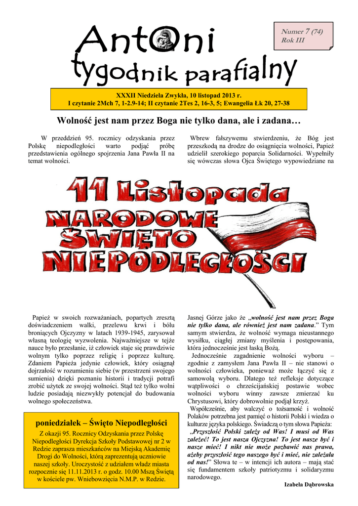 AntOni Numer 7 (74) Rok III XXXII Niedziela Zwykła, 10 listopad 2013 r. I czytanie 2Mch 7, 1-2.9-14; II czytanie 2Tes 2, 16-3, 5; Ewangelia Łk 20, 27-38 Wolność jest nam przez Boga nie tylko dana, ale i zadana… W przeddzień 95. rocznicy odzyskania przez Polskę niepodległości warto podjąć próbę przedstawienia ogólnego spojrzenia Jana Pawła II na temat wolności. Wbrew fałszywemu stwierdzeniu, że Bóg jest przeszkodą na drodze do osiągnięcia wolności, Papież udzielił szerokiego poparcia Solidarności. Wypełniły się wówczas słowa Ojca Świętego wypowiedziane na Papież w swoich rozważaniach, popartych zresztą doświadczeniem walki, przelewu krwi i bólu broniących Ojczyzny w latach 1939-1945, zarysował własną teologię wyzwolenia. Najważniejsze w tejże nauce było przesłanie, iż człowiek staje się prawdziwie wolnym tylko poprzez religię i poprzez kulturę. Zdaniem Papieża jedynie człowiek, który osiągnął dojrzałość w rozumieniu siebie (w przestrzeni swojego sumienia) dzięki poznaniu historii i tradycji potrafi zrobić użytek ze swojej wolności. Stąd też tylko wolni ludzie posiadają niezwykły potencjał do budowania wolnego społeczeństwa. Jasnej Górze jako że „wolność jest nam przez Boga nie tylko dana, ale również jest nam zadana.” Tym samym stwierdza, że wolność wymaga nieustannego wysiłku, ciągłej zmiany myślenia i postępowania, która jednocześnie jest łaską Bożą. Jednocześnie zagadnienie wolności wyboru – zgodnie z zamysłem Jana Pawła II – nie stanowi o wolności człowieka, ponieważ może łączyć się z samowolą wyboru. Dlatego też refleksje dotyczące wątpliwości o chrześcijańskiej postawie wobec wolności wyboru winny zawsze zmierzać ku Chrystusowi, który dobrowolnie podjął krzyż. Współcześnie, aby walczyć o tożsamość i wolność Polaków potrzebna jest pamięć o historii Polski i wiedza o kulturze języka polskiego. Świadczą o tym słowa Papieża: „Przyszłość Polski zależy od Was! I musi od Was zależeć! To jest nasza Ojczyzna! To jest nasze być i nasze mieć! I nikt nie może pozbawić nas prawa, ażeby przyszłość tego naszego być i mieć, nie zależała od nas!” Słowa te – w intencji ich autora – mają stać się fundamentem szkoły patriotyzmu i solidaryzmu narodowego. poniedziałek – Święto Niepodległości Z okazji 95. Rocznicy Odzyskania przez Polskę Niepodległości Dyrekcja Szkoły Podstawowej nr 2 w Redzie zaprasza mieszkańców na Miejską Akademię Drogi do Wolności, którą zaprezentują uczniowie naszej szkoły. Uroczystość z udziałem władz miasta rozpocznie się 11.11.2013 r. o godz. 10.00 Mszą Świętą w kościele pw. Wniebowzięcia N.M.P. w Redzie. Izabela Dąbrowska Wiara szuka zrozumienia Ks. Krystian Wilczyński ([email protected]) Jak przeżyć słowa przed Komunią: „Panie nie jestem godzien...”? Pięknie jest odkrywać w powtarzających się i znanych gestach nowe myśli, inspirujące do głębszego przeżywania życia duchowego. Moment obrzędów Komunii podczas Mszy świętej jest szczególny. Po dokonanej Ofierze Jezusa, zostaje nam ukazany Ten, który ma moc włączyć nas w swoje dzieło zbawienia. To znaczy, że w podniesionych postaciach chleba i wina jest obecny Zmartwychwstały żywy Jezus. Przełamana hostia jest znakiem dokonanej ofiary – śmierć Jezusa nastąpiła. Krew w kielichu, zmieszana z cząstką Ciała, jest TĄ Krwią, która została wylana za nas na krzyżu. Musimy mieć wiarę, że klękamy przed Wszechmogącym Bogiem – zwycięzcą naszych grzechów i ich diabelskiego inicjatora. Mamy patrzeć na połamany Chleb i przelaną Krew, a widzieć oczami duszy „Zmartwychwstanie i życie” (por. J 11,25). Słowa kapłana: „Oto Baranek Boży, który gładzi grzechy świata. Błogosławieni, którzy zostali wezwani na Jego ucztę”, to połączenie słów św. Jana Chrzciciela i obrazu uczty niebieskiej, którą jest już Eucharystia. Mówią one o żywym Jezusie, który swoją Ofiarą zgładził wszystkie nasze grzechy. Ci, którzy zostali wezwani do udziału w tym zwycięstwie, są prawdziwie (nie) błogosławieni, czyli szczęśliwi. Czy to znaczy, że Jezus wezwał nie-wszystkich? - Dzieło Jezusa i jego owoce (wyzwolenie z grzechów) jest dostępne dla każdego. Szczególnie wezwani do niego są chrześcijanie, którzy mają żyć w komunii z Bogiem. Kto trwa w grzechu, ma się nawrócić i zmienić styl życia, bo inaczej nie jest szczęśliwy i nie ma życia w sobie (por. J 6,53). To jest możliwe w każdym czasie. Odpowiedź: „Panie, nie jestem godzien, abyś przyszedł do mnie, ale powiedz tylko słowo, a będzie uzdrowiona dusza moja” ('nie jestem godzien' mówią zarówno mężczyźni jak i kobiety, gdyż każdy wypowiada się jako człowiek; rodzaje nie mają tu znaczenia, por. Ga 3,28), to słowa rzymskiego setnika, wyrażające wiarę w Boską władzę Jezusa, mającą moc przywracać zdrowie duszy i ciała, czyli zbawiać (por. Mt 8,8). Słowo Panie (gr. Kyrie) jest wyznaniem wiary w Jezusa Pana wszechświata, któremu chcemy się poddać w miłości. Uznanie braku swoich zasług niegodności jest konsekwencją przyjęcia Go za Pana. Jako grzesznicy nie mamy żadnych możliwości, ani środków, ani czegokolwiek, żeby samemu zasłużyć na nasze zbawienie. Tylko zasługi Ofiary Jezusa, dają nam wolność (por. Katechizm, nn. 2006-2011). Możemy o nie błagać, przyjąć i wtedy według nich żyć. Jezus chce przyjść do człowieka, pod jego dach (w niektórych krajach mówi się „nie jestem godzien, abyś wszedł pod mój dach...”) i u niego przebywać (por. Łk 19,5; J 14,23; Ap 3,20). Jedno słowo życia, wypowiedziane do nas przez Zbawiciela, jest w stanie dokonać naszego uzdrowienia. Mówimy dusza moja, ale pod tymi słowami rozumiemy (tak, jak w Biblii) całego człowieka, a więc duszę i ciało. Takim nastawieniu ducha, otwieramy się na uzdrawiające dzi