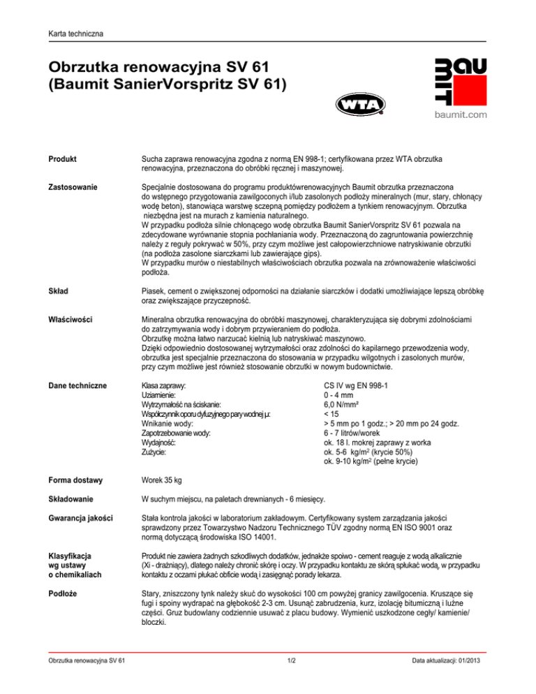 Karta techniczna Obrzutka renowacyjna SV 61 (Baumit SanierVorspritz SV 61) Produkt Sucha zaprawa renowacyjna zgodna z normą EN 998-1; certyfikowana przez WTA obrzutka renowacyjna, przeznaczona do obróbki ręcznej i maszynowej. Zastosowanie Specjalnie dostosowana do programu produktówrenowacyjnych Baumit obrzutka przeznaczona do wstępnego przygotowania zawilgoconych i/lub zasolonych podłoży mineralnych (mur, stary, chłonący wodę beton), stanowiąca warstwę sczepną pomiędzy podłożem a tynkiem renowacyjnym. Obrzutka niezbędna jest na murach z kamienia naturalnego. W przypadku podłoża silnie chłonącego wodę obrzutka Baumit SanierVorspritz SV 61 pozwala na zdecydowane wyrównanie stopnia pochłaniania wody. Przeznaczoną do zagruntowania powierzchnię należy z reguły pokrywać w 50%, przy czym możliwe jest całopowierzchniowe natryskiwanie obrzutki (na podłoża zasolone siarczkami lub zawierające gips). W przypadku murów o niestabilnych właściwościach obrzutka pozwala na zrównoważenie właściwości podłoża. Skład Piasek, cement o zwiększonej odporności na działanie siarczków i dodatki umożliwiające lepszą obróbkę oraz zwiększające przyczepność. Właściwości Mineralna obrzutka renowacyjna do obróbki maszynowej, charakteryzująca się dobrymi zdolnościami do zatrzymywania wody i dobrym przywieraniem do podłoża. Obrzutkę można łatwo narzucać kielnią lub natryskiwać maszynowo. Dzięki odpowiednio dostosowanej wytrzymałości oraz zdolności do kapilarnego przewodzenia wody, obrzutka jest specjalnie przeznaczona do stosowania w przypadku wilgotnych i zasolonych murów, przy czym możliwe jest również stosowanie obrzutki w nowym budownictwie. Dane techniczne Klasa zaprawy: Uziarnienie: Wytrzymałość na ściskanie: Współczynnik oporu dyfuzyjnego pary wodnej µ: Wnikanie wody: Zapotrzebowanie wody: Wydajność: Zużycie: Forma dostawy Worek 35 kg Składowanie W suchym miejscu, na paletach drewnianych - 6 miesięcy. Gwarancja jakości Stała kontrola jakości w laboratorium zakładowym. Certyfikowany system zarządzania jakości sprawdzony przez Towarzystwo Nadzoru Technicznego TÜV zgodny normą EN ISO 9001 oraz normą dotyczącą środowiska ISO 14001. Klasyfikacja wg ustawy o chemikaliach Produkt nie zawiera żadnych szkodliwych dodatków, jednakże spoiwo - cement reaguje z wodą alkalicznie (Xi - drażniący), dlatego należy chronić skórę i oczy. W przypadku kontaktu ze skórą spłukać wodą, w przypadku kontaktu z oczami płukać obficie wodą i zasięgnąć porady lekarza. Podłoże Stary, zniszczony tynk należy skuć do wysokości 100 cm powyżej granicy zawilgocenia. Kruszące się fugi i spoiny wydrapać na głębokość 2-3 cm. Usunąć zabrudzenia, kurz, izolację bitumiczną i luźne części. Gruz budowlany codziennie usuwać z placu budowy. Wymienić uszkodzone cegły/ kamienie/ bloczki. Obrzutka renowacyjna SV 61 CS IV wg EN 998-1 0 - 4 mm 6,0 N/mm² < 15 > 5 mm po 1 godz.; > 20 mm po 24 godz. 6 - 7 litrów/worek ok. 18 l. mokrej zaprawy z worka ok. 5-6 kg/m2 (krycie 50%) ok. 9-10 kg/m2 (pełne krycie) 1/2 Data aktualizacji: 01/2013 Karta techniczna Dokładnie oczyścić mur (stosując sprężone powietrze, miotłę/ szczotkę drucianą itp.) a następnie osuszyć. W wątpliwych przypadkach podłoże silnie chłonące wodę należy wstępnie zwilżyć (unikać tworzenia się błony wodnej na powierzchni ściany). Zagwarantować dobre przywieranie obrzutki do podłoża. Obróbka Przestrzegać zaleceń zawartych w analizie starego tynku i wytycznych renowacyjnych ! Wymieszać obrzutkę Baumit SanierVorspritz SV 61 z czystą wodą, bez dodawania jakichkolwiek dodatków. Przygotowanie ręczne - w skrzyni na zaprawę lub mieszalnikiem ręcznym (czas mieszania ok. 3 minut). Stosując odpowiednie agregaty tynkarskie należy - z uwagi na grube uziarnienie zastosować używane ślimacznice i wstępnie zamulić węże podające szlamem wapiennym. Nanosić obrzutkę - o ile to możliwe - pasmami, pokrywając jedynie 50% powierzchni. W zależności od wymogów podłoża, obrzutkę można również nakładać na całą powierzchnię muru, (grubość warstwy 5 mm). Obrzutki nie należy w żadnym przypadku stosować do wyrównywania nierówności podłoża. Nałożoną obrzutkę ewentualnie zwilżać, aby uchronić przed wypaleniem się. Cały przygotowany materiał musi zostać zużyty przed rozpoczęciem procesu twardnienia. Nie mieszać ponownie raz związanego materiału. O ile to możliwe nakładać tynk już 1- 2 dni po pokryciu podłoża obrzutką. Wskazówki Nie wykonywać prac przy bezpośrednim nasłonecznieniu, w czasie deszczu lub silnego wiatru; chronić przygotowaną powierzchnię przed zbyt szybkim wysychaniem. Świeżo zagruntowane obrzutką powierzchnie należy przez 1-2 dni chronić przed wysychaniem i innymi szkodliwymi czynnikami. W pomieszczeniach zamkniętych należy zapewnić odpowiednio szybkie wysychanie obrzutki (wentylacja i/lub odwilgacanie). Przed położeniem następnej warstwy należy zachować 1- 2 dni przerwy technologicznej. Zbyt długie przestoje mogą jednak na wilgotnym murze doprowadzić do utworzenia się spieczonej warstwy i spowodować problemy z przywieraniem. W trakcie aplikacji i procesu twardnienia temperatura otoczenia, materiału i podłoża musi wynosić min. +50C. Nasze zalecenia w zakresie stosowanych technik, przekazywane słowem i pismem w celu wsparcia nabywcy (użytkownika) opracowane w oparciu o nasze doświadczenia i aktualny stan wiedzy są niewiążące i nie uzasadniają prawnego stosunku umownego oraz żadnych zobowiązań ubocznych z tytułu umowy kupna (sprzedaży). Nie zwalniają one nabywcy od sprawdzenia na własną odpowiedzialność przydatności naszych produktów do przewidzianego zastosowania. Należy przestrzegać ogólnych zasad techniki budowlanej. Zastrzegamy sobie możliwość zmian, które służą technicznemu postępowi i ulepszeniu produktu lub jego z