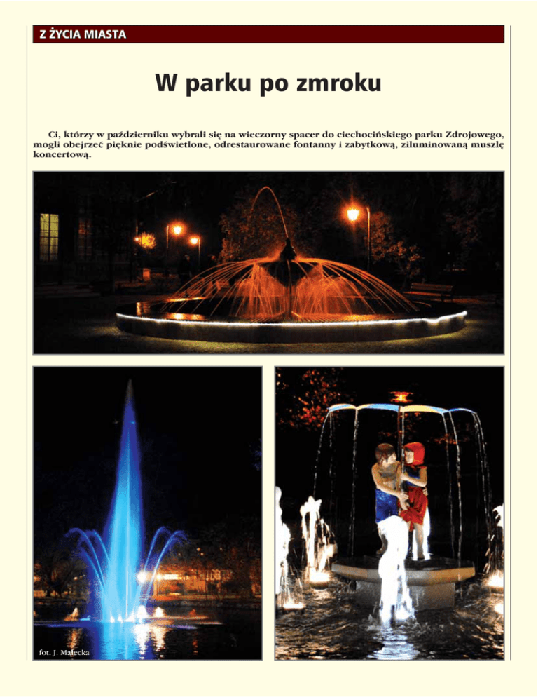 Z ˚YCIA MIASTA W parku po zmroku Ci, którzy w paêdzierniku wybrali si´ na wieczorny spacer do ciechociƒskiego parku Zdrojowego, mogli obejrzeç pi´knie podÊwietlone, odrestaurowane fontanny i zabytkowà, ziluminowanà muszl´ koncertowà. fot. J. Ma∏ecka Park Zdrojowy powsta∏ ok. 1876 roku wed∏ug projektu Hipolita Cybulskiego. Ma kszta∏t wyd∏u˝onego prostokàta, a jego powierzchnia wynosi ok. 19 ha. RoÊlinnoÊç zosta∏a sprowadzona z okolic Odessy. Rosnà tu m.in. korkowiec, k∏ek kanadyjski i mi∏orzàb dwuklapowy. To tutaj znajduje si´ tak˝e jedyny w Ciechocinku tulipanowiec amerkaƒski, który charakteryzuje si´ okaza∏ymi ˝ó∏to-pomaraƒczowymi kwiatami w kszta∏cie kielicha. W ostatnim czasie zakupiono tak˝e wiele nowych drzew, m.in. platany klonolistne, d´by czerwone, klony jawory i kasztany jadalne. W g∏ównej, obsadzonej lipami krymskimi alei znajduje si´ fontanna nierozerwalnie zwiàzana z wizerunkiem Ciechocinka. Gipsowe figurki przedstawiajàce Jasia i Ma∏gosi´ z popularnej bajki sà ch´tnie wykorzystywane jako t∏o do pamiàtkowych zdj´ç. Wodotrysk pierwotnie by∏ ozdobà placu przed Teatrem Letnim, nast´pnie przeniesiony zosta∏ do parku Zdrojowego, by staç si´ jego prawdziwà atrakcjà. Ch´tnie odwiedzana jest tak˝e kolejna fontanna „˚abka”, która przesz∏a ostatnio znacznà metamorfoz´. Na kamiennej kuli usytuowanej na kielichu siedzi ˝aba, która pluje wodà na spacerowiczów. Warto zwróciç tak˝e uwag´ na efektownie iluminowanà, drewnianà muszl´ koncertowà, która zosta∏a wybudowana w stylu zakopiaƒskim wed∏ug projektu Waldemara Feddersa. Projekt zosta∏ zrealizowany przez Zak∏ady Przemys∏owoBudowlane w Warszawie. Wszystkie elementy odpowiednio przyci´te w fabryce, przetransportowano kolejà do Ciechocinka i zmontowano w 1909 roku. Na murowanym kamienno-ceglanym podpiwniczeniu wzniesiono bry∏´ w konstrukcji drewnianej. Dach pokryto gontem. Wn´trze muszli i szczyty frontu oraz ryzalitów wyposa˝ono w promieniste wieƒce. Dodatkowo wewnàtrz wykonano dekoracje z nabijanych drewnianych çwieków, a na zewnàtrz ornamentalne grzebienie i motywy liry. Muszla od blisko stu lat s∏u˝y z wielkim powodzeniem mieszkaƒcom naszego miasta, a tak˝e kuracjuszom, turystom i wczasowiczom. Wpisana na trwa∏e w krajobraz uzdrowiska, niezmiennie kojarzy si´ z najciekawszymi wydarzeniami kulturalnymi w historii miasta i ca∏ego regionu. GoÊci∏a niezliczonà liczb´ zespo∏ów muzycznych, tanecznych, wokalnych oraz czo∏owych solistów muzyki popularnej i powa˝nej. To tu koncertowa∏a legendarna Orkiestra Zdrojowa pod batutà Kazimierza Karpeckiego, tu narodzi∏y si´ Spotkania z Folklorem Kujaw i Ziemi Dobrzyƒskiej, a tak˝e Mi´dzynarodowy Festiwal Piosenki i Kultury Romów. Tu spotykajà si´ uzdolnione dzieci niepe∏nosprawne; zespo∏y stra˝ackie i orkiestry d´te prezentujà pe∏en uroku kunszt, a Kazimierz Kowalski zabiera s∏uchaczy w Êwiat opery i operetki. Uwag´ spacerowiczów przyciàga tak˝e malowniczy mostek i staw z podÊwietlonymi, mieniàcymi si´ na ró˝ne kolory wodotryskami. Wiosnà znów b´dziemy mogli podziwiaç w pe∏nej krasie znajdujàce si´ w parku fontanny. Justyna Ma∏ecka 3 Gazeta Samorzàdu Lokalnego Wydawca: Urzàd Miejski Ciechocinka. Adres redakcji: ul. Kopernika 19, 87-720 Ciechocinek, tel. 54 416 18 00 Dy˝ury redakcji: czwartek 12.00 - 13.00 e-mail: [email protected] Redaguje kolegium w sk∏adzie: Aldona Nocna, Katarzyna Kaliszewska, Barbara Kawczyƒska, Mariola Ró˝aƒska, Maciej Wzi´ch, Justyna Ma∏ecka, - redaktor naczelna. Ok∏adka Dariusz Drzewucki Opracowanie graficzne sk∏ad i ∏amanie: tel. 600 919 975. Druk: Pracownia Poligraficzna, Toruƒ, ul. Astrowa 2, tel. 56 650 91 53 Tekstów niezamówionych redakcja nie zwraca. Zastrzegamy sobie prawo do skracania tekstów i redagowania tytu∏ów. Redakcja nie ponosi odpowiedzialnoÊci za opinie przedstawiane w publikacjach zamieszczonych na ∏amach gazety. ZDRÓJ CIECHOCI¡SKI paêdziernik 2012