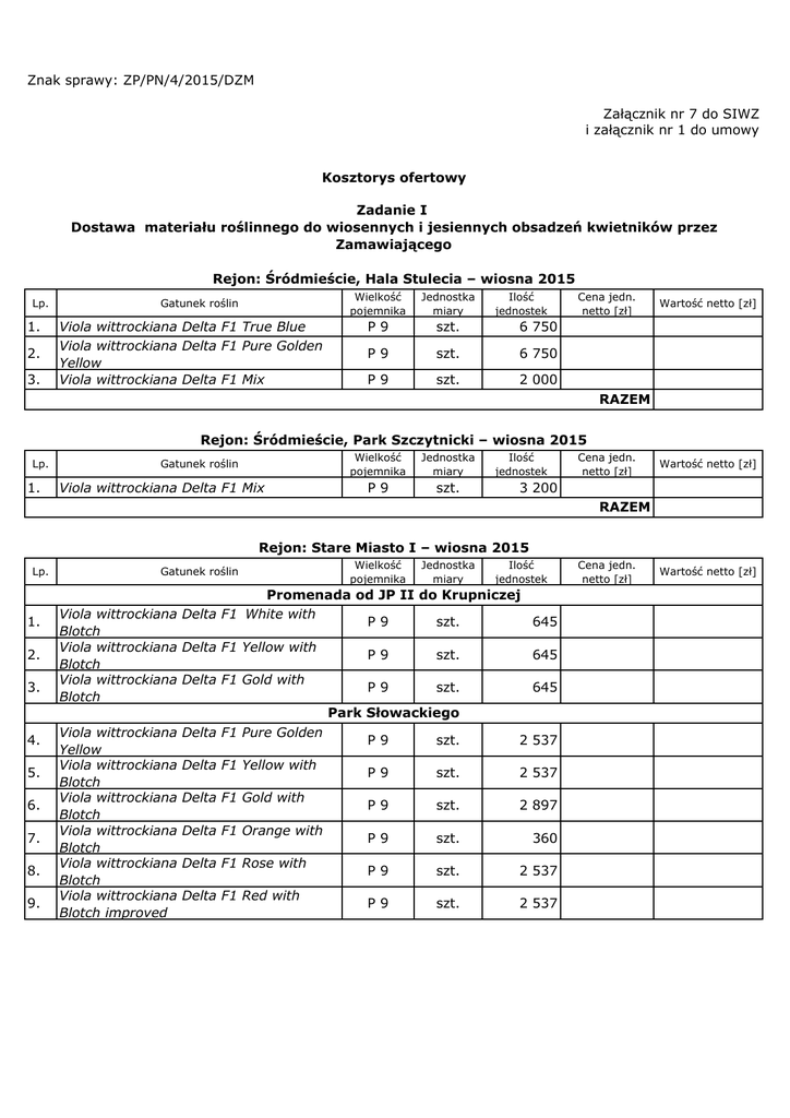 Znak sprawy: ZP/PN/4/2015/DZM Załącznik nr 7 do SIWZ i załącznik nr 1 do umowy Kosztorys ofertowy Zadanie I Dostawa materiału roślinnego do wiosennych i jesiennych obsadzeń kwietników przez Zamawiającego Rejon: Śródmieście, Hala Stulecia – wiosna 2015 Lp. 1. 2. 3. Gatunek roślin Viola wittrockiana Delta F1 True Blue Viola wittrockiana Delta F1 Pure Golden Yellow Viola wittrockiana Delta F1 Mix Wielkość pojemnika Jednostka miary Ilość jednostek P9 szt. 6 750 P9 szt. 6 750 P9 szt. 2 000 Cena jedn. netto [zł] Wartość netto [zł] RAZEM Rejon: Śródmieście, Park Szczytnicki – wiosna 2015 Lp. 1. Gatunek roślin Viola wittrockiana Delta F1 Mix Wielkość pojemnika Jednostka miary P9 szt. Ilość jednostek Cena jedn. netto [zł] Wartość netto [zł] 3 200 RAZEM Rejon: Stare Miasto I – wiosna 2015 Lp. 1. 2. 3. 4. 5. 6. 7. 8. 9. Gatunek roślin Wielkość pojemnika Jednostka miary Ilość jednostek Promenada od JP II do Krupniczej Viola wittrockiana Delta F1 White with P9 szt. Blotch Viola wittrockiana Delta F1 Yellow with P9 szt. Blotch Viola wittrockiana Delta F1 Gold with P9 szt. Blotch Park Słowackiego Viola wittrockiana Delta F1 Pure Golden P9 szt. 2 Yellow Viola wittrockiana Delta F1 Yellow with P9 szt. 2 Blotch Viola wittrockiana Delta F1 Gold with P9 szt. 2 Blotch Viola wittrockiana Delta F1 Orange with P9 szt. Blotch Viola wittrockiana Delta F1 Rose with P9 szt. 2 Blotch Viola wittrockiana Delta F1 Red with P9 szt. 2 Blotch improved 645 645 645 537 537 897 360 537 537 Cena jedn. netto [zł] Wartość netto [zł] 10. 11. 12. 13. Viola wittrockiana Blotch Viola wittrockiana Blotch Improved Viola wittrockiana Blotch Viola wittrockiana Blotch improved Zieleniec przy pl. Powstańców Warszawy Delta F1 White with P9 szt. 2 000 Delta F1 Blue With Delta F1 Yellow with Delta F1 Red with P9 szt. 2 000 P9 szt. 5 096 P9 szt. 5 096 Promenada przy Ogrodzie Staromiejskim 14. Viola wittrockiana Delta F1 Pure Violet P9 szt. Viola wittrockiana Delta F1 Pure Golden P9 szt. Yellow 16. Viola wittrockiana Delta F1 Pure Rose P9 szt. Ogród Staromiejski Viola wittrockiana Delta F1 White with 17. P9 szt. Blotch Viola wittrockiana Delta F1 Yellow With 18. P9 szt. Purple Wing 15. 19. Viola wittrockiana Primose with Blotch P9 Viola wittrockiana Delta F1 Yellow with P9 Blotch Viola wittrockiana Delta F1 Orange with P9 21. Blotch Viola wittrockiana Delta F1 Red with 22. P9 Blotch improved Zieleniec przy Placu 20. 23. Viola wittrockiana Delta F1 Inferno Mix P9 704 704 704 860 860 szt. 430 szt. 860 szt. 860 szt. 860 Kościuszki szt. 1 505 Bulwar Włosta, Bulwar Wyszyńskiego Viola wittrockiana Delta F1 White with 24. P9 szt. 2 924 Blotch Viola wittrockiana Delta F1 Gold with 25. P9 szt. 2 924 Blotch Zieleń Ostrowa Tumskiego Viola wittrockiana Delta F1 Blue With 26. P9 szt. 2 021 Blotch Improved Viola wittrockiana Delta F1 Yellow with 27. P9 szt. 1 935 Blotch Viola wittrockiana Delta F1 Orange with P9 szt. 1 505 28. blotch Viola wittrockiana Delta F1 Red with 29. P9 szt. 3 440 Blotch Improved Powodzianka, Wrocławianka 30. Viola wittrockiana Delta F1 Pure Yellow P9 szt. 688 31. Viola wittrockiana Delta F1 True blue P9 szt. 688 Plac Dominikański - donice w przejściu 32. Viola wittrockiana Delta F1 Pure Orange P9 szt. 240 33. Viola wittrockiana Delta F1 Pure Violet P9 szt. 240 P9 szt. 240 P9 szt. 240 Viola wittrockiana Delta F1 Pure Golden Yellow 35. Viola wittrockiana Delta F1 Pure Rose 34. 36. 37. 38. 39. Viola wittrockiana Blotch Viola wittrockiana Blotch Viola wittrockiana Blotch Viola wittrockiana Blotch Improved Donice na całym rejonie Stare Miasto I Delta F1 White with P9 szt. 144 Delta F1 Yellow with Delta F1 Gold with Delta F1 Red with 40. Viola wittrockiana Delta F1 Inferno Mix P9 szt. 144 P9 szt. 144 P9 szt. 1 197 P9 szt. 900 RAZEM Rejon: Krzyki I, Park Wschodni – wiosna 2015 Lp. 1. Gatunek roślin Myosotis sylvatica ‘Blue Basket’ Wielkość pojemnika Jednostka miary P9 szt. Ilość jednostek Cena jedn. netto [zł] Wartość netto [zł] 1 660 RAZEM Rejon: Śródmieście, Hala Stulecia – jesień 2015 Lp. Gatunek roślin Wielkość pojemnika Jednostka miary Ilość jednostek 1. Tulipan czerwony obwód cebuli min. 12 cm szt. 23 700 2. Tulipan żółty obwód cebuli min. 12 cm szt. 7 500 P9 szt. 5 600 P9 szt. 6 200 3. 4. Viola wittrockiana Delta F1 Fire Suprise/niebieski Viola wittrockiana Delta F1 Fire Suprise/żółty Cena jedn. netto [zł] Wartość netto [zł] RAZEM Rejon: Śródmieście, Park Szczytnicki – jesień 2015 Lp. 1. 2. Gatunek roślin Viola wittrockiana Delta F1 Fire Suprise/niebieskie Viola wittrockiana Delta F1 /pomarańczowe Wielkość pojemnika Jednostka miary Ilość jednostek P9 szt. 1 100 P9 szt. 2 000 3. Tulipan żółty obwód cebuli min. 12 cm szt. 100 4. Alium giganteum obwód cebuli min. 18-20 cm szt. 150 Cena jedn. netto [zł] RAZEM Zadanie I Razem netto Podatek VAT OGÓŁEM BRUTTO Wartość netto [zł] Zadanie II Dostawa materiału roślinnego do letnich obsadzeń kwietników w parkach i na zieleńcach przez Zamawiającego Rejon: Stare Miasto I – lato 2015 Lp. Wielkość pojemnika Gatunek roślin Jednostka miary Ilość jednostek 5. 6. 7. 8. Promenada od Placu Jana Pawła II do Krupniczej Canna x generalis (liśc bordowy, kwiat C3 szt. 76 pomarańczowy) Salvia farinacea ‘Victoria Blue’ P9 szt. 740 Tagetes erecta F1 Antigua Orange P9 szt. 910 Park Słowackiego Achillea, odm. o kwiatach czerwonych, P9 szt. 240 różowych P 11 Argyranthemum Courtyard 'Polly' szt. 80 P 11 Bidens 'Tweety Compact' szt. 240 P9 Echinacea purpurea 'Magnus' szt. 200 C2 Echinacea 'Maria' szt. 40 9. Heuchera odm. o purpurowych liściach 1. 2. 3. 4. C2 szt. 360 10. Liatris spicata 'Alba' 11. Lupinus odm. o białych kwiatach 12. Rudbekia fulgida Sedum spectabile odm. o różowych 13. kwiatach 'Brillant' Sedum spectabile odm o białych 14. kwiatach 'Star Dust' 15. Verbena bonariensis 16. Pennisetum alopecuroides 'Hameln' P9 P9 P9 szt. szt. szt. 240 240 360 P9 szt. 370 P
