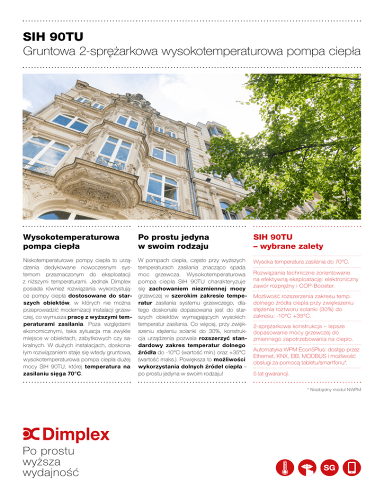 SIH 90TU Gruntowa 2-sprężarkowa wysokotemperaturowa pompa ciepła Wysokotemperaturowa pompa ciepła Po prostu jedyna w swoim rodzaju SIH 90TU – wybrane zalety Niskotemperaturowe pompy ciepła to urządzenia dedykowane nowoczesnym systemom przeznaczonym do eksploatacji z niższymi temperaturami. Jednak Dimplex posiada również rozwiązania wykorzystujące pompy ciepła dostosowane do starszych obiektów, w których nie można przeprowadzić modernizacji instalacji grzewczej, co wymusza pracę z wyższymi temperaturami zasilania. Poza względami ekonomicznymi, taka sytuacja ma zwykle miejsce w obiektach, zabytkowych czy sakralnych. W dużych instalacjach, doskonałym rozwiązaniem staje się wtedy gruntowa, wysokotemperaturowa pompa ciepła dużej mocy SIH 90TU, której temperatura na zasilaniu sięga 70°C. W pompach ciepła, często przy wyższych temperaturach zasilania znacząco spada moc grzewcza. Wysokotemperaturowa pompa ciepła SIH 90TU charakteryzuje się zachowaniem niezmiennej mocy grzewczej w szerokim zakresie temperatur zasilania systemu grzewczego, dlatego doskonale dopasowana jest do starszych obiektów wymagających wysokich temperatur zasilania. Co więcej, przy zwiększeniu stężeniu solanki do 30%, konstrukcja urządzenia pozwala rozszerzyć standardowy zakres temperatur dolnego źródła do -10°C (wartość min.) oraz +35°C (wartość maks.). Powiększa to możliwości wykorzystania dolnych źródeł ciepła – po prostu jedyna w swoim rodzaju! Wysoka temperatura zasilania do 70°C. Rozwiązania techniczne zorientowane na efektywną eksploatację: elektroniczny zawór rozprężny i COP-Booster. Możliwość rozszerzenia zakresu temp. dolnego źródła ciepła przy zwiększeniu stężenia roztworu solanki (30%) do zakresu: -10°C +35°C. 2-sprężarkowa konstrukcja – lepsze dopasowanie mocy grzewczej do zmiennego zapotrzebowania na ciepło. Automatyka WPM Econ5Plus: dostęp przez Ethernet, KNX, EIB, MODBUS i możliwość obsługi za pomocą tabletu/smartfonu*. 5 lat gwarancji. * Niezbędny moduł NWPM Po prostu wyższa wydajność SG SIH 90TU – dane techniczne Made in Germany Simply More Quality COP 4,7 wydajność do* Model SIH 90TU Kolor obudowy biały Maksymalna temperatura zasilania 70 °C Dolna / górna granica zastosowania źródła ciepła (ogrzewanie) -5 / +25 °C Moc grzewcza / COP (1 sprężarka) przy B0/W35* 47,9 kW / 4,7 Moc grzewcza / COP (2 sprężarki) przy B0/W35* 88,6 kW / 4,3 Moc grzewcza / COP (1 sprężarka) przy B0/W45* 46,4 kW / 3,8 Moc grzewcza / COP (2 sprężarki) przy B0/W45* 86,5 kW / 3,5 Znamionowy pobór mocy wg EN 14511 przy B0/W35 20,4 kW Poziom mocy akustycznej urządzenia wg EN 12102 70 dB (A) Poziom ciśnienia akustycznego w odległości 1 m (wewnątrz) 55 dB (A) Oznaczenie / masa czynnika chłodniczego R134a / 24,5 kg Maksymalny przepływ nośnika ciepła źródła górnego / opory hydrauliczne 15,4 m³/h / 14700 Pa Minimalny przepływ nośnika ciepła źródła dolnego 15,5 m³/h Wymiary (szer. x wys. x gł.) ** 1350 x 1890 x 775 mm Masa całkowita urządzenia 807 kg Napięcie zasilania 3/N/PE ~400 V, 50 Hz Prąd rozruchowy z układem łagodnego rozruchu 120 A Zabezpieczenie *** C 100 A Króćce przyłączeniowe górnego źródła ciepła Rp 2" Króćce przyłączeniowe dolnego źródła ciepła Rp 3" * EN 14511 ** Należy uwzględnić dodatkowe miejsce do przyłączenia rur, obsługi i konserwacji *** Wyłącznik zabezpieczający musi zapewnić wyłączenie wszystkich faz równocześnie Po prostu odwiedź naszą stronę internetową: www.dimplex.pl Glen Dimplex Polska Sp. z o.o. ul. Strzeszyńska 33, 60-479 Poznań · tel. 61 842 58 05 · fax: 61 842 58 06 [email protected] · www.dimplex.pl Projekt nr 044/01. Zastrzegamy sobie prawo do zmian i odstępstw w kolorach. SIH 90TU