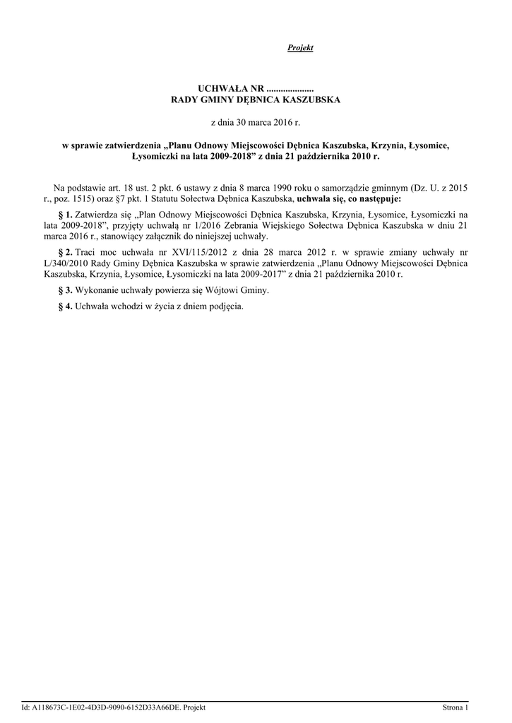 Projekt UCHWAŁA NR .................... RADY GMINY DĘBNICA KASZUBSKA z dnia 30 marca 2016 r. w sprawie zatwierdzenia „Planu Odnowy Miejscowości Dębnica Kaszubska, Krzynia, Łysomice, Łysomiczki na lata 2009-2018” z dnia 21 października 2010 r. Na podstawie art. 18 ust. 2 pkt. 6 ustawy z dnia 8 marca 1990 roku o samorządzie gminnym (Dz. U. z 2015 r., poz. 1515) oraz §7 pkt. 1 Statutu Sołectwa Dębnica Kaszubska, uchwala się, co następuje: § 1. Zatwierdza się „Plan Odnowy Miejscowości Dębnica Kaszubska, Krzynia, Łysomice, Łysomiczki na lata 2009-2018”, przyjęty uchwałą nr 1/2016 Zebrania Wiejskiego Sołectwa Dębnica Kaszubska w dniu 21 marca 2016 r., stanowiący załącznik do niniejszej uchwały. § 2. Traci moc uchwała nr XVI/115/2012 z dnia 28 marca 2012 r. w sprawie zmiany uchwały nr L/340/2010 Rady Gminy Dębnica Kaszubska w sprawie zatwierdzenia „Planu Odnowy Miejscowości Dębnica Kaszubska, Krzynia, Łysomice, Łysomiczki na lata 2009-2017” z dnia 21 października 2010 r. § 3. Wykonanie uchwały powierza się Wójtowi Gminy. § 4. Uchwała wchodzi w życia z dniem podjęcia. Id: A118673C-1E02-4D3D-9090-6152D33A66DE. Projekt Strona 1 Załącznik do Uchwały Nr .................... Rady Gminy Dębnica Kaszubska z dnia 30 marca 2016 r. Załącznik do uchwały nr 1/2016 zebrania wiejskiego z dnia 21.03.2016 r. Plan Odnowy Miejscowości Dębnica Kaszubska, Krzynia, Łysomice, Łysomiczki na lata 2009-2018 GMINA DĘBNICA KASZUBSKA POWIAT SŁUPSK WOJEWÓDZTWO POMORSKIE Dębnica Kaszubska, marzec 2016 r. 1 Id: A118673C-1E02-4D3D-9090-6152D33A66DE. Projekt Strona 1 Spis treści: 1. Charakterystyka sołectwa Dębnica Kaszubska ...................................................... 3 1.1 Podstawowe dane ............................................................................................. 3 1.2 Historia miejscowości ........................................................................................ 5 1.3. Przestrzenna struktura miejscowości i zabudowa architektoniczna ................. 6 2. Inwentaryzacja zasobów służących odnowie miejscowości .................................... 8 2.1 Geograficzne i przyrodnicze uwarunkowania rozwoju....................................... 8 2.2 Walory turystyczne ........................................................................................... 8 2.3 Warunki klimatyczne i glebowo-rolnicze.......................................................... 10 2.4. Dziedzictwo kulturowe .................................................................................... 10 2.5. Gospodarka, rynek pracy i rolnictwo .............................................................. 11 2.6. Infrastruktura techniczna ................................................................................ 12 2.7. Kapitał społeczny i ludzki ............................................................................... 13 3. Charakterystyka otoczenia sołectwa – gmina Dębnica Kaszubska ...................... 15 4. Wizja i misja wsi ................................................................................................... 21 5. Ocena mocnych i słabych stron miejscowości ...................................................... 22 6. Cele rozwoju i projektowane przedsięwzięcia....................................................... 24 7. Opis planowanych zadań inwestycyjnych i przedsięwzięć aktywizujących społeczność sołectwa Dębnica Kaszubska na lata 2009-2018 w kolejności wynikającej z przyjętych priorytetów rozwoju............................................................ 25 7a. Opis i charakterystyka obszarów związanych z kształtowaniem obszarów o szczególnym znaczeniu dla zaspokojenia potrzeb mieszkańców............................. 47 8. Razem szacunkowy budżet rozwoju sołectwa na lata 2009-2018 ........................ 48 9. Zgodność Planu Odnowy Miejscowości z dokumentami strategicznymi dotyczącymi rozwoju obszarów wiejskich ................................................................. 52 10. Wdrażanie Planu Odnowy Miejscowości, monitorowanie i ewaluacja ................ 56 2 Id: A118673C-1E02-4D3D-9090-6152D33A66DE. Projekt Strona 2 1. Charakterystyka sołectwa Dębnica Kaszubska 1.1 Podstawowe dane Położenie miejscowości i przynależność administracyjna Sołectwo Dębnica Kaszubska położone jest na Wysoczyźnie Polanowskiej, w północno-zachodniej części województwa pomorskiego, w powiecie słupskim, w zachodniej części gminy, przy drodze wojewódzkiej nr 210 Słupsk - Unichowo. Dębnica Kaszubska jest jedną z 22 wsi sołeckich i jednocześnie stolicą gminy. W skład sołectwa wchodzi siedem miejscowości: Dębnica Kaszubska, Krzynia, Łysomice, Łysomiczki, Dobrzykowo, Dudzicze i Dargacz. Powierzchnia Powierzchnia obrębu sołectwa Dębnica Kaszubska wynosi 8939,74 ha. W poniższej tabeli przedstawiono strukturę powierzchni gruntów w obrębie sołectwa: Wyszczególnienie Powierzchnia [ha] Udział % w ogólnej powierzchni obrębu Grunty zabudowane i zurbanizowane 140,19 1,57 Grunty leśne oraz zadrzewione i zakrzaczone 6970,20 77,97 Łąki i pastwiska trwałe 303,70 3,40 Grunty orne 1131,65 12,66 1,28 0,01 Nieużytki 100,36 1,12 Drogi 107,50 1,20 Rowy 6,05 0,07 161,76 1,81 Grunty pod wodami powierzchniowymi stojącymi 6,96 0,08 Użytek ekologiczny 0,1 0,001 Tereny różne 4,95 0,06 8939,74 100,00 Sady Grunty pod wodami powierzchniowymi płynącymi Razem 3 Id: A118673C-1E02-4D3D-9090-6152D33A66DE. Projekt Strona 3 Grunty zabudowane i zurbanizowane Grunty leśne oraz zadrzewione i zakrzaczone Łąki i pastwiska trwałe Grunty orne Sady Nieużytki Drogi Rowy Grunty pod wodami powierzchniowymi płynącymi Grunty pod wodami powierzchniowymi stojącymi Użytek ekologiczny Tereny różne Liczba ludności Sołectwo Dębnica Kaszubska zamieszkują 3820 osoby. Liczba mieszkańców poszczególnych wsi wchodzących w skład sołectwa przedstawia się następująco