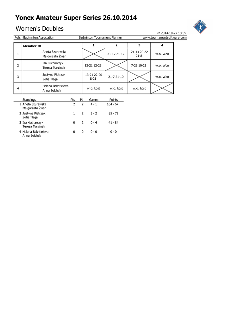 Yonex Amateur Super Series 26.10.2014 Women's Doubles Polish Badminton Association 1 Member ID 2 3 4 21-12 21-12 21-13 20-22 21-8 w.o. Won 7-21 10-21 w.o. Won 1 Aneta Szurawska Małgorzata Żwan 2 Iza Kucharczyk Teresa Marcinek 12-21 12-21 3 Justyna Pietrzak Zofia Tlaga 13-21 22-20 8-21 21-7 21-10 4 Helena Bakhtieieva Anna Bolshak w.o. Lost w.o. Lost Standings 1 Aneta Szurawska Małgorzata Żwan Pn 2014-10-27 18:09 www.tournamentsoftware.com Badminton Tournament Planner Pts 2 Pl. 2 Games 4-1 Points 104 - 67 2 Justyna Pietrzak Zofia Tlaga 1 2 3-2 85 - 79 3 Iza Kucharczyk Teresa Marcinek 0 2 0-4 41 - 84 4 Helena Bakhtieieva Anna Bolshak 0 0 0-0 0-0 w.o. Won w.o. Lost