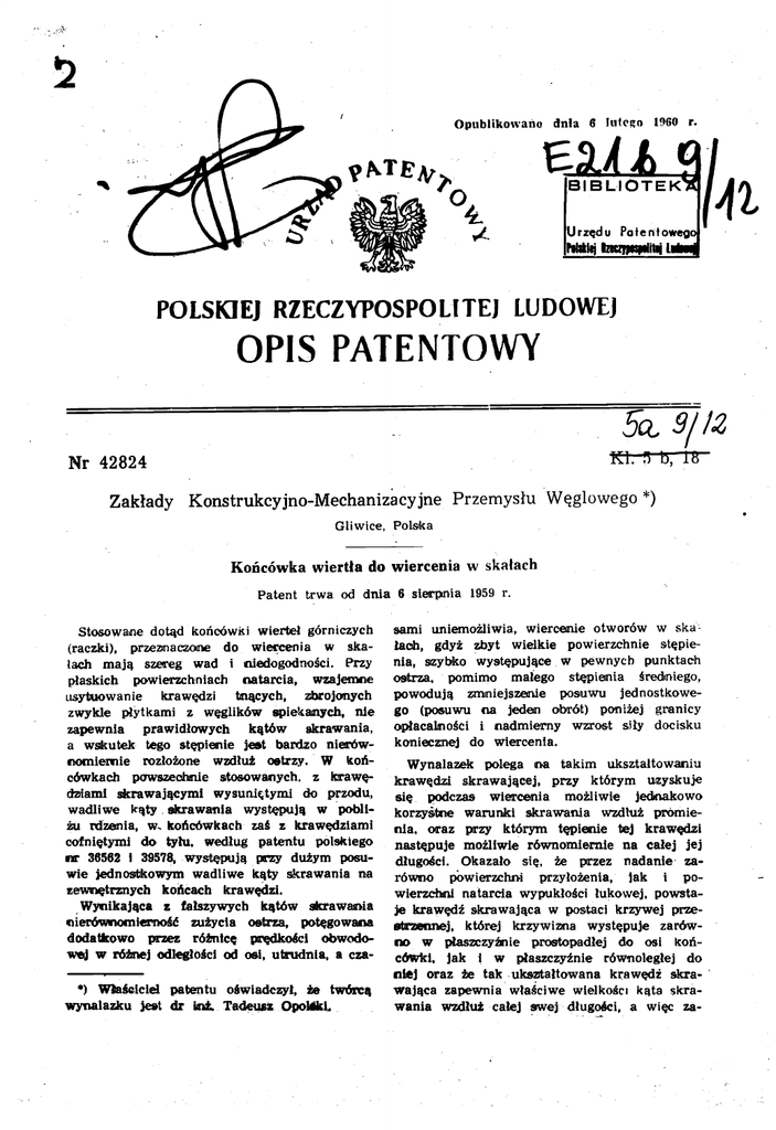 Opublikowano dnia 6 **T*A>" lutego 1960 r. BIBLIOTEK 4. IUrzędu Potentowegi POLSKIEJ RZECZYPOSPOLITEJ LUDOWEJ OPIS PATENTOWY Nr 42824 KI. B b, 16 Zakłady Konstrukcyjno-Mechanizacyjne Przemysłu Węglowego *) Gliwice, Polska Końcówka wiertła do wiercenia w skałach Patent trwa od dnia 6 sierpnia 1959 r. Stosowane dotąd końcówki wierteł górniczych (raczki), przeznaczone do wiercenia w ska¬ lach mają szereg wad i niedogodności. Przy płaskich powierzchniach natarcia, wzajemne usytuowanie krawędzi tnących, zbrojonych zwykle płytkami z węglików spiekanych, nie zapewnia prawidłowych kątów skrawania, a wskutek tego stępienie jest bardzo nierów¬ nomiernie rozłożone wzdłuż ostrzy. W koń¬ cówkach powszechnie stosowanych, z krawę¬ dziami skrawającymi wysuniętymi do przodu, wadliwe kąty skrawania występują w pobli¬ żu rdzenia, w. końcówkach zaś z krawędziami cofniętymi do tylu, według patentu polskiego nr 36562 i 39578, występują przy dużym posu¬ wie jednostkowym wadliwe kąty skrawania na zewnętrznych końcach krawędzi. Wynikająca z fałszywych kątów skrawania nierównomierność zużycia ostrza, potęgowana dodatkowo przez różnicę prędkości obwodo¬ wej w różnej odległości od osi, utrudnia, a cza•) Właściciel patentu oświadczył, że twórcą wynalazku jest dr inz. Tadeusz Opolski. sami uniemożliwia, wiercenie otworów w ska¬ łach, gdyż zbyt wielkie powierzchnie stępie¬ nia, szybko występujące w pewnych punktach ostrza, pomimo małego stępienia średniego, powodują zmniejszenie posuwu jednostkowe¬ go (posuwu na jeden obrót) poniżej granicy opłacalności i nadmierny wzrost siły docisku koniecznej do wiercenia. Wynalazek polega na takim ukształtowaniu krawędzi skrawającej, przy którym uzyskuje się podczas wiercenia możliwie jednakowo korzystne warunki skrawania wzdłuż promie¬ nia, oraz przy którym tępienie tej krawędzi następuje możliwie równomiernie na całej jej długości. Okazało się, że przez nadanie za¬ równo powierzchni przyłożenia, jak i po¬ wierzchni natarcia wypukłości łukowej, powsta¬ je krawędź skrawająca w postaci krzywej prze¬ strzennej, której krzywizna występuje zarów¬ no w płaszczyźnie prostopadłej do osi koń¬ cówki, jak i w płaszczyźnie równoległej do niej oraz że tak ukształtowana krawędź skra¬ wająca zapewnia właściwe wielkości kąta skra¬ wania wzdłuż całej swej długości, a więc za- równo w pobliżu rdzenia, jak i W następuje wyniku karnych hib-innego twardego i trudno ścieral¬ nego tworzywa. Dzięki temu, że powierzchnia uniknione tępienie się krawędzi skrawającej, jednakże w przypadku ukształtowania tej kra¬ natarcia 5 i powierzchnia przyłożenia 6 skrzy¬ według skrawania na' peryferii. nie¬ wędzi pracy wynalazku, tępienie to zacho¬ dełka 3 ukształtowane są wypukło łukowo, krawędź skrawająca na . przecięciu tyfcn po¬ dzi równomiernie na całej jej długości. Dzięki wierzchni temu między jednym ostrzeniem, a następnym można osiągnąć długość wiercenia dotychczas rej krzywizna występuje zarówno w płaszczyź¬ nieosiągalną. W celu uzyskania płaszczyźnie równoległej do tej osi. wiercenia, łukowe optymalnych wypukłości stanowi krzywą przestrzenną, któ¬ nie prostopadłej ćę psi końcówki, jak i w wyników powierzchni przyłożenia i powierzchni natarcia dobiera się w zależności od zamierzonego posuwu jed¬ nostkowego* i od własności ścierających wier¬ conej skały. Na rysunku jest uwidoczniona- schematycznie końcówka wiertła według wynalazku, na przy¬ kładzie wiertła dwuskrzydełkowego, przy czym Zastrzeżenie patentowe Końcówka wiertła do wiercenia w skałach, posiadająca dwa hib więcej skrzydełek, zna¬ mienna tym, że powierzchnia natarcia (5) i po¬ wierzchnia przyłożenia (fi) każdego skrzydeł¬ ka posiadając kształt łukowo wypukły, dzięki fig. 2 — widok końcówki z boku i fig. 3 — widok końcówki z góry. czemu krawędzie skrawające stanowią krzywe przestrzenne, których krzywi zna występuje w płaszczyźnie-prostopadłej do osi i w płaszczyź¬ nie do niej równoległej. Końcpwka dolną częścią swego kadłuba, sta¬ nowiącą trzon 1, jest osadzona na żerdzi wiert¬ niczej, na gwincie lub w inny sposób. Kadłub 2 posiada dwa Gub więcej) skrzydełka 3 za¬ kończone krawędziami skrawającymi. Skrzy¬ Konstrukcyjno - Mecbanizacyjne Przemysłu Węglowego Zastępca: mgr inż. Witold Hennel dełka są zbrojone płytkami 4 z węglików spie- rzecznik lig. 1 przedstawia widok końcówki z przodu, %* Zakłady patentowy P19 2 R9 3 Wzór jednoraz. Sto!. Żaki. Grat. — WG. Zam. 789, tM egz., Al pism., ki. III.