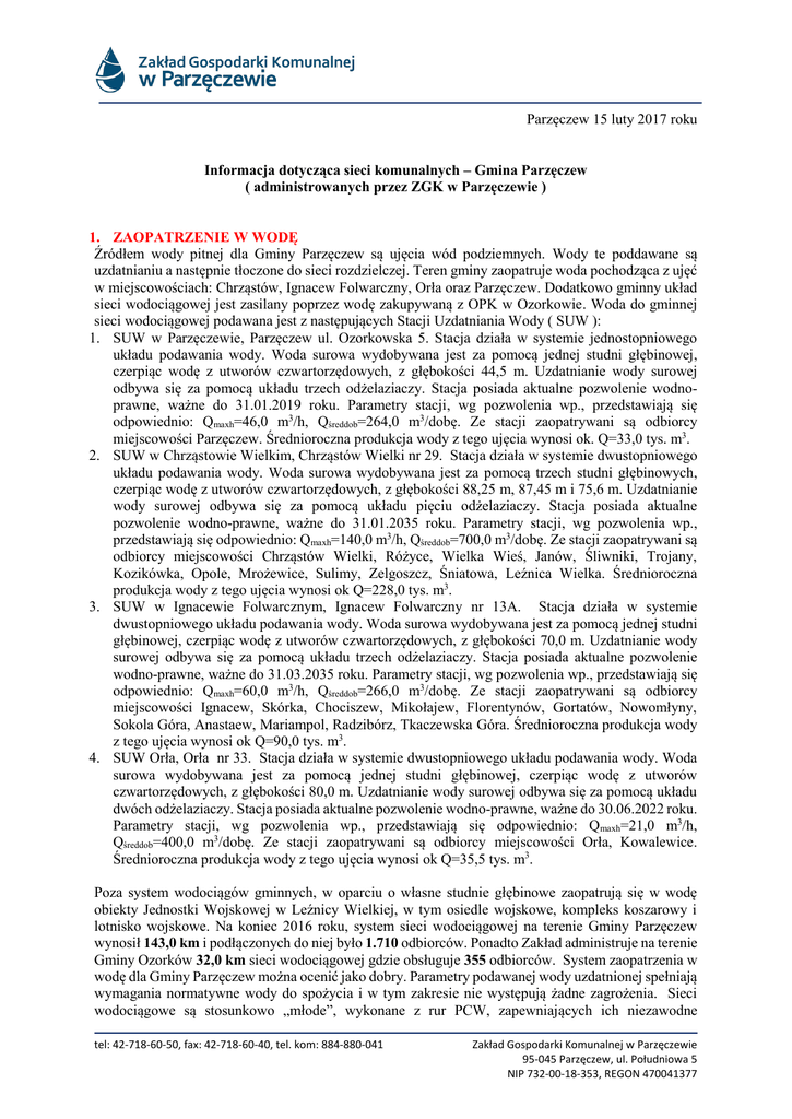 Parzęczew 15 luty 2017 roku Informacja dotycząca sieci komunalnych – Gmina Parzęczew ( administrowanych przez ZGK w Parzęczewie ) 1. ZAOPATRZENIE W WODĘ Źródłem wody pitnej dla Gminy Parzęczew są ujęcia wód podziemnych. Wody te poddawane są uzdatnianiu a następnie tłoczone do sieci rozdzielczej. Teren gminy zaopatruje woda pochodząca z ujęć w miejscowościach: Chrząstów, Ignacew Folwarczny, Orła oraz Parzęczew. Dodatkowo gminny układ sieci wodociągowej jest zasilany poprzez wodę zakupywaną z OPK w Ozorkowie. Woda do gminnej sieci wodociągowej podawana jest z następujących Stacji Uzdatniania Wody ( SUW ): 1. SUW w Parzęczewie, Parzęczew ul. Ozorkowska 5. Stacja działa w systemie jednostopniowego układu podawania wody. Woda surowa wydobywana jest za pomocą jednej studni głębinowej, czerpiąc wodę z utworów czwartorzędowych, z głębokości 44,5 m. Uzdatnianie wody surowej odbywa się za pomocą układu trzech odżelaziaczy. Stacja posiada aktualne pozwolenie wodnoprawne, ważne do 31.01.2019 roku. Parametry stacji, wg pozwolenia wp., przedstawiają się odpowiednio: Qmaxh=46,0 m3/h, Qśreddob=264,0 m3/dobę. Ze stacji zaopatrywani są odbiorcy miejscowości Parzęczew. Średnioroczna produkcja wody z tego ujęcia wynosi ok. Q=33,0 tys. m3. 2. SUW w Chrząstowie Wielkim, Chrząstów Wielki nr 29. Stacja działa w systemie dwustopniowego układu podawania wody. Woda surowa wydobywana jest za pomocą trzech studni głębinowych, czerpiąc wodę z utworów czwartorzędowych, z głębokości 88,25 m, 87,45 m i 75,6 m. Uzdatnianie wody surowej odbywa się za pomocą układu pięciu odżelaziaczy. Stacja posiada aktualne pozwolenie wodno-prawne, ważne do 31.01.2035 roku. Parametry stacji, wg pozwolenia wp., przedstawiają się odpowiednio: Qmaxh=140,0 m3/h, Qśreddob=700,0 m3/dobę. Ze stacji zaopatrywani są odbiorcy miejscowości Chrząstów Wielki, Różyce, Wielka Wieś, Janów, Śliwniki, Trojany, Kozikówka, Opole, Mrożewice, Sulimy, Zelgoszcz, Śniatowa, Leźnica Wielka. Średnioroczna produkcja wody z tego ujęcia wynosi ok Q=228,0 tys. m3. 3. SUW w Ignacewie Folwarcznym, Ignacew Folwarczny nr 13A. Stacja działa w systemie dwustopniowego układu podawania wody. Woda surowa wydobywana jest za pomocą jednej studni głębinowej, czerpiąc wodę z utworów czwartorzędowych, z głębokości 70,0 m. Uzdatnianie wody surowej odbywa się za pomocą układu trzech odżelaziaczy. Stacja posiada aktualne pozwolenie wodno-prawne, ważne do 31.03.2035 roku. Parametry stacji, wg pozwolenia wp., przedstawiają się odpowiednio: Qmaxh=60,0 m3/h, Qśreddob=266,0 m3/dobę. Ze stacji zaopatrywani są odbiorcy miejscowości Ignacew, Skórka, Chociszew, Mikołajew, Florentynów, Gortatów, Nowomłyny, Sokola Góra, Anastaew, Mariampol, Radzibórz, Tkaczewska Góra. Średnioroczna produkcja wody z tego ujęcia wynosi ok Q=90,0 tys. m3. 4. SUW Orła, Orła nr 33. Stacja działa w systemie dwustopniowego układu podawania wody. Woda surowa wydobywana jest za pomocą jednej studni głębinowej, czerpiąc wodę z utworów czwartorzędowych, z głębokości 80,0 m. Uzdatnianie wody surowej odbywa się za pomocą układu dwóch odżelaziaczy. Stacja posiada aktualne pozwolenie wodno-prawne, ważne do 30.06.2022 roku. Parametry stacji, wg pozwolenia wp., przedstawiają się odpowiednio: Q maxh=21,0 m3/h, Qśreddob=400,0 m3/dobę. Ze stacji zaopatrywani są odbiorcy miejscowości Orła, Kowalewice. Średnioroczna produkcja wody z tego ujęcia wynosi ok Q=35,5 tys. m3. Poza system wodociągów gminnych, w oparciu o własne studnie głębinowe zaopatrują się w wodę obiekty Jednostki Wojskowej w Leźnicy Wielkiej, w tym osiedle wojskowe, kompleks koszarowy i lotnisko wojskowe. Na koniec 2016 roku, system sieci wodociągowej na terenie Gminy Parzęczew wynosił 143,0 km i podłączonych do niej było 1.710 odbiorców. Ponadto Zakład administruje na terenie Gminy Ozorków 32,0 km sieci wodociągowej gdzie obsługuje 355 odbiorców. System zaopatrzenia w wodę dla Gminy Parzęczew można ocenić jako dobry. Parametry podawanej wody uzdatnionej spełniają wymagania normatywne wody do spożycia i w tym zakresie nie występują żadne zagrożenia. Sieci wodociągowe są stosunkowo „młode”, wykonane z rur PCW, zapewniających ich niezawodne tel: 42-718-60-50, fax: 42-718-60-40, tel. kom: 884-880-041 Zakład Gospodarki Komunalnej w Parzęczewie 95-045 Parzęczew, ul. Południowa 5 NIP 732-00-18-353, REGON 470041377 funkcjonowanie na najbliższe lata. Dwie Stacje Uzdatniania Wody ( Orła i Chrząstów Wielki ) są po gruntownej modernizacji. Pozostałe stacje ( Parzęczew oraz Ignacew Folwarczny ) funkcjonują poprawnie. Jednak w najbliższej przyszłości winno się zaplanować ich modernizacje, poprzez wymianę urządzeń. Bardzo ważnym problemem jaki występuje w systemie zaopatrzenia w wodę są przerwy w dostawie energii elektrycznej skutkujące przerwami w zaopatrzeniu w wodę. Dlatego też ważnym działaniem będzie wyposażenie naszych Stacji w agregaty prądotwórcze. Zakład Gospodarki Komunalnej w Parzęczewie opracował dokumentację budowlaną w tym zakresie. Przewidziano montaż agregatów prądotwórczych dla: SUW w miejscowości Ignacew Folwarczny, SUW w miejscowości Chrząstów Wielki, SUW w miejscowości Orła. 2. GOSPODARKA ŚCIEKOWA Ścieki sanitarne, z miejscowości skanalizowanych, odprowadzane są do oczyszczalni ścieków zlokalizowanych w miejscowościach Chociszew, Parzęczew ulica Kątna, Parzęczew, ulica Ozorkowska 14. Z pozostałych terenów nieskanalizowanych ścieki sanitarne są oczyszczane poprzez przydomowe oczyszczalnie ścieków lub wywożone wozami asenizacyjnymi do oczyszczalni ścieków w Parzęczewie. 1. Oczyszczalnia ścieków w Parzęczewie, Parzęczew, ul. Kątna. Jest to mechaniczno-biologiczna oczyszczalnia ścieków. Ścieki surowe kierowane są z pompowni ścieków, poprzez sito-piaskownik do osadnika wstępnego. Następnie 