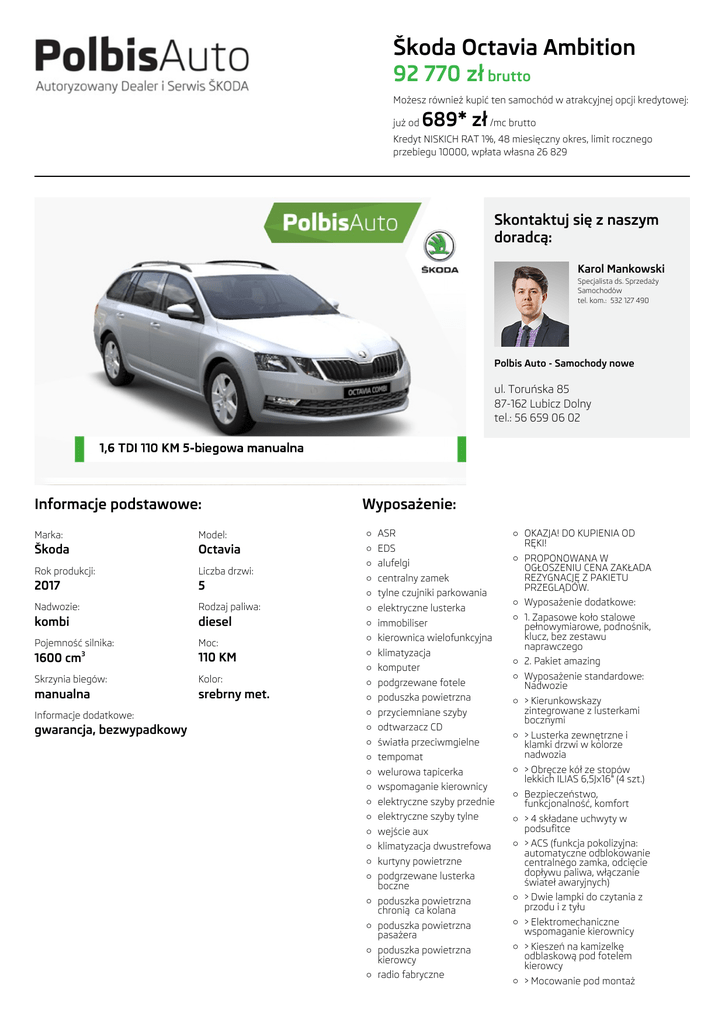 Škoda Octavia Ambition 92 770 zł brutto Możesz również kupić ten samochód w atrakcyjnej opcji kredytowej: już od 689* zł /mc brutto Kredyt NISKICH RAT 1%, 48 miesięczny okres, limit rocznego przebiegu 10000, wpłata własna 26 829 Skontaktuj się z naszym doradcą: Karol Mankowski Specjalista ds. Sprzedaży Samochodów tel. kom.: 532 127 490 Polbis Auto - Samochody nowe ul. Toruńska 85 87-162 Lubicz Dolny tel.: 56 659 06 02 Informacje podstawowe: Wyposażenie: Marka: Model: ASR Škoda Octavia EDS Rok produkcji: Liczba drzwi: 2017 5 Nadwozie: Rodzaj paliwa: elektryczne lusterka kombi diesel immobiliser Pojemność silnika: Moc: alufelgi centralny zamek tylne czujniki parkowania kierownica wielofunkcyjna 110 KM klimatyzacja Skrzynia biegów: Kolor: manualna srebrny met. podgrzewane fotele 1600 cm 3 komputer poduszka powietrzna Informacje dodatkowe: przyciemniane szyby gwarancja, bezwypadkowy odtwarzacz CD światła przeciwmgielne tempomat welurowa tapicerka wspomaganie kierownicy elektryczne szyby przednie elektryczne szyby tylne wejście aux klimatyzacja dwustrefowa kurtyny powietrzne podgrzewane lusterka boczne poduszka powietrzna chronią ca kolana poduszka powietrzna pasażera poduszka powietrzna kierowcy radio fabryczne OKAZJA! DO KUPIENIA OD RĘKI! PROPONOWANA W OGŁOSZENIU CENA ZAKŁADA REZYGNACJĘ Z PAKIETU PRZEGLĄDÓW. Wyposażenie dodatkowe: 1. Zapasowe koło stalowe pełnowymiarowe, podnośnik, klucz, bez zestawu naprawczego 2. Pakiet amazing Wyposażenie standardowe: Nadwozie > Kierunkowskazy zintegrowane z lusterkami bocznymi > Lusterka zewnętrzne i klamki drzwi w kolorze nadwozia > Obręcze kół ze stopów lekkich ILIAS 6,5Jx16" (4 szt.) Bezpieczeństwo, funkcjonalność, komfort > 4 składane uchwyty w podsufitce > ACS (funkcja pokolizyjna: automatyczne odblokowanie centralnego zamka, odcięcie dopływu paliwa, włączanie świateł awaryjnych) > Dwie lampki do czytania z przodu i z tyłu > Elektromechaniczne wspomaganie kierownicy > Kieszeń na kamizelkę odblaskową pod fotelem kierowcy > Mocowanie pod montaż klimatyzacja automatyczna systemu siatek > Multicollision Brake – hamulec antykolizyjny > Oświetlenie części bagażowej - dwie lampki > Podłokietnik z tyłu ze schowkiem i przejściem do bagażnika > Podpowiedź zmiany biegu > Przegroda wnęki nadkola – lewa strona bagażnika > Przestrzeń bagażowa z 4 haczykami na torby > Schowek przed pasażerem z przodu – oświetlony, chłodzony > Skrobaczka do szyb w pokrywie wlewu paliwa > Sygnalizacja niezamkniętych drzwi > Sygnał ostrzegawczy niewyłączonych reflektorów > Światła odblaskowe w przednich drzwiach > Uchwyt na kwity parkingowe Skorzystaj z naszej oferty! Zapraszamy do kontaktu z naszym Doradcą Klienta. Zapytaj o dostępność auta. Gwarantujemy profesjonalne doradztwo w zakresie kupna samochodu oraz kompleksową realizację formalności związanych z zakupem. Oferujemy atrakcyjne WARUNKI FINANSOWANIA oraz promocyjne pakiety ubezpieczeniowe OC AC NNW. PAKIET POGWARANCYJNY - Przedłuż beztroską jazdę swoją ŠKODĄ! Pakiety pogwarancyjne to program, który pozwala na przedłużenie bezproblemowego serwisowania nowego samochodu na kolejne 2 lata lub do osiągnięcia określonego limitu kilometrów (60 000 km lub 120 000 km). PAKIET PRZEGLĄDÓW – Zapewnij sobie spokój, pewność i najwyższą jakość Pakiet przeglądów to opłacone wcześniej obowiązkowe przeglądy (robocizna, oryginalne części i materiały eksploatacyjne zgodne z planem serwisowym) przez pierwsze 4 lata lub do osiągnięcia określonego limitu kilometrów (60 000 km lub 120 000 km). GWARANCJA DOŻYWOTNIEJ MOBILNOŚCI Program Gwarancja Dożywotniej Mobilności skierowany jest do użytkowników samochodów marki ŠKODA po upływie dwuletniej gwarancji i obejmuje cały okres eksploatacji samochodu. W przypadku awarii poniesiesz jedynie koszty związane z naprawą i użytymi materiałami - wszystkie pozostałe usługi programu ŠKODA Assistance świadczone są bezpłatnie. ASSISTANCE W przypadku unieruchomienia samochodu, nie pozwalającego na kontynuowanie jazdy w sposób bezpieczny lub zgodny z przepisami, będącego skutkiem awarii części, podzespołów lub akcesoriów pojazdu objętego gwarancją producenta, możesz skorzystać z usług Program ŠKODA Assistance oferuje również usługi płatne, m.in. naprawa w miejscu zdarzenia lub holowanie. ŠKODA Assistance. Uwaga! Zamieszczone zdjęcia stanowią materiał poglądowy. Przedstawiona propozycja nie jest ofertą handlową w rozumieniu przepisów prawa, ma jedynie charakter informacyjny.