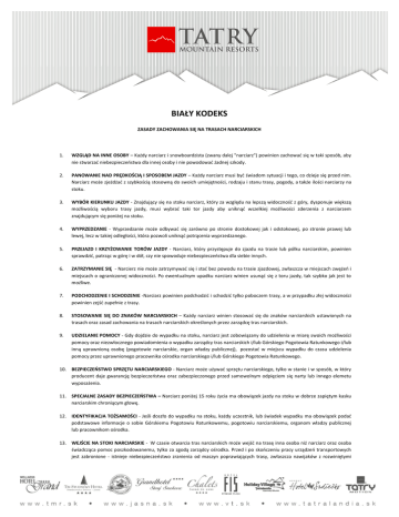 BIAŁY KODEKS ZASADY ZACHOWANIA SIĘ NA TRASACH NARCIARSKICH 1. WZGLĄD NA INNE OSOBY – Każdy narciarz i snowboardzista (zwany dalej "narciarz") powinien zachować się w taki sposób, aby nie stwarzać niebezpieczeństwa dla innej osoby i nie powodować żadnej szkody. 2. PANOWANIE NAD PRĘDKOŚCIĄ I SPOSOBEM JAZDY – Każdy narciarz musi być świadom sytuacji i tego, co dzieje się przed nim. Narciarz może zjeżdżać z szybkością stosowną do swoich umiejętności, rodzaju i stanu trasy, pogody, a także ilości narciarzy na stoku. 3. WYBÓR KIERUNKU JAZDY - Znajdujący się na stoku narciarz, który za względu na lepszą widoczność z góry, dysponuje większą możliwością wyboru trasy jazdy, musi wybrać taki tor jazdy aby uniknąć wszelkiej możliwości zderzenia z narciarzem znajdującym się poniżej na stoku. 4. WYPRZEDZANIE - Wyprzedzanie może odbywać się zarówno po stronie dostokowej jak i odstokowej, po stronie prawej lub lewej, lecz w takiej odległości, która pozwoli uniknąć potrącenia wyprzedzanego. 5. PRZEJAZD I KRZYŻOWANIE TORÓW JAZDY - Narciarz, który przystępuje do zjazdu na trasie lub pólku narciarskim, powinien sprawdzić, patrząc w górę i w dół, czy nie spowoduje niebezpieczeństwa dla siebie innych. 6. ZATRZYMANIE SIĘ - Narcierz nie może zatrzymywać się i stać bez powodu na trasie zjazdowej, zwłaszcza w miejscach zwężeń i miejscach o ograniczonej widoczności. Po ewentualnym upadku narciarz winien usunąć się z toru jazdy, tak szybko jak jest to możliwe. 7. PODCHODZENIE I SCHODZENIE -Narciarz powinien podchodzić i schodzić tylko poboczem trasy, a w przypadku złej widoczności powinien zejść zupełnie z trasy. 8. STOSOWANIE SIĘ DO ZNAKÓW NARCIARSKICH – Każdy narciarz winien stosować się do znaków narciarskich ustawionych na trasach oraz zasad zachowania na trasach narciarskich określonych przez zarządcę tras narciarskich. 9. UDZIELANIE POMOCY - Gdy dojdzie do wypadku na stoku, narciarz jest zobowiązany do udzielenia w miarę swoich możliwości pomocy oraz niezwłocznego powiadomienia o wypadku zarządcy tras narciarskich i/lub Górskiego Pogotowia Ratunkowego i/lub inną uprawnioną osobę (pogotowie narciarskie, organ władzy publicznej), pozostać w miejscu wypadku do czasu udzielenia pomocy przez uprawnionego pracownika ośrodka narciarskiego i/lub Górskiego Pogotowia Ratunkowego. 10. BEZPIECZEŃSTWO SPRZĘTU NARCIARSKIEGO - Narciarz może używać sprzętu narciarskiego, tylko w stanie i w sposób, w który producent daje gwarancję bezpieczeństwa oraz zabezpieczonego przed samowolnym odpięciem się narty lub innego elemetu wyposażenia. 11. SPECJALNE ZASADY BEZPIECZEŃSTWA – Narciarz poniżej 15 roku życia ma obowiązek jazdy na stoku w dobrze zapiętym kasku narciarskim chroniącym głowę. 12. IDENTYFIKACJA TOŻSAMOŚCI - Jeśli doszło do wypadku na stoku, każdy uczestnik, lub świadek wypadku ma obowiązek podać podstawowe informacje o sobie Górskiemu Pogotowiu Ratunkowemu, pogotowiu narciarskiemu, organom władzy publicznej lub pracownikom ośrodka. 13. WEJŚCIE NA STOKI NARCIARSKIE - W czasie otwarcia tras narciarskich może wejść na trasę inna osoba niż narciarz oraz osoba świadcząca pomoc poszkodowanemu, tylko za zgodą zarządcy ośrodka. Przed i po skończeniu pracy urządzeń transportowych jest zabronione - istnieje niebezpieczeństwo zranienia od maszyn poprawiających trasy, zwłaszcza nawijaków z rozwiniętymi linami! 14. DZIAŁALNOŚĆ ZORGANIZOWANA (NAUKA NARCIARSTWA/SNOWBOARDINGU) – Osoba, która organizuje zajęcia narciarskie na stoku ma obowiązek zapewnienia, aby osoba poniżej 15 roku życia poruszała się po stoku w kamizelce odblaskowej lub posiadała odzież z elementami odblaskowymi. 15. PIERWSZE LEKCJE NARCIARSTWA / SNOWBORDINGU - Pierwsze lekcje nauki jazdy na nartach / snowboardzie (tzn. nauka przy której narciarz nie korzysta z wyciągów, ewent. urządzeń transportowych, a w trakcie nauki następuje wielokrotne wchodzenie piechotą na dany odcinek stoku) muszą odbywać się poza niebezpiecznymi (nieodpowiednimi) miejscami, którymi są: trasy narciarske nr 2b Májová Priehyba–Jasná, 12a Jelení Grúň, 34b Panoráma Predné Dereše-Kosodrevina, 34c Panoráma ChopokPredné Dereše, powierzchnia górnych 100 m zjazdovky č.13 Biela Púť oraz dolnych 200 m tras zjazdowych: nr 13 Biela Púť, trasa zjazdowa nr 10 Vrbická, trasa zjazdowa nr 5 Turistická, trasa zjazdowa nr 11 FIS, trasa zjazdowa nr 12 Jelení Grúň a trasa zjazdowa nr 1a Pretekárska Luková-Priehyba. 16. REKLAMA I DZIAŁALNOŚĆ HANDLOWA NA STOKACH - Bez zgody zarządcy ośrodka narciarskiego obowiązuje zakaz wykorzystania tras narciarskich i terenów kończących trasy narciarskie w celach reklamowych (np. umieszczanie straganów, przedmiotów reklamowych i innych). Bez zgody zarządcy ośrodka narciarskiego obowiązuje zakaz wykonywania działalności handlowej na trasach narciarskich i terenach kończących trasy narciarskie. Każdy gość ośrodka narciarskiego ma obowiązek zapoznania się i przestrzegania zasad korzystania z trasy narciarskiej oraz zasad zachowania na stoku. Wchodząc na stok narciarski i/lub korzystając z górskich urządzeń transportowych, zasady i wytyczne stają się dla każdego wiążące. Tatry mounatin resorts, a.s. jako zarządca ośrodka zastrzega sobie prawo, w przypadku jakiegokolwiek naruszenia zasad i wytycznych określonych w Białym Kodeksie lub w ogólnym regulaminie, po uprzednim ostrzeżeniu zakazać osobie naruszającej zasady i wytyczne wejścia na stoki narciarskie, a jednocześnie uniemożliwić jej w tym dniu korzystanie z górskich urządzeń transportowych poprzez zablokowanie karnetu narciarskiego. Tatry mountain resorts, a.s., Demänovská dolina 72, 031 01 Liptovský Mikuláš, IČO: 31 560 636, za písaná v OR vedenom OS Žilina, oddiel Sa, vložka č. 62/L.