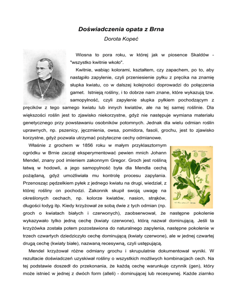 Doświadczenia opata z Brna Dorota Kopeć Wiosna to pora roku, w której jak w piosence Skaldów "wszystko kwitnie wkoło". Kwitnie, wabiąc kolorami, kształtem, czy zapachem, po to, aby nastąpiło zapylenie, czyli przeniesienie pyłku z pręcika na znamię słupka kwiatu, co w dalszej kolejności doprowadzi do połączenia gamet. Istnieją rośliny, i to dobrze nam znane, które wykazują tzw. samopylność, czyli zapylenie słupka pyłkiem pochodzącym z pręcików z tego samego kwiatu lub innych kwiatów, ale na tej samej roślinie. Dla większości roślin jest to zjawisko niekorzystne, gdyż nie następuje wymiana materiału genetycznego przy powstawaniu osobników potomnych. Jednak dla wielu odmian roślin uprawnych, np. pszenicy, jęczmienia, owsa, pomidora, fasoli, grochu, jest to zjawisko korzystne, gdyż pozwala utrzymać pożyteczne cechy odmianowe. Właśnie z grochem w 1856 roku w małym przyklasztornym ogródku w Brnie zaczął eksperymentować pewien mnich Johann Mendel, znany pod imieniem zakonnym Gregor. Groch jest rośliną łatwą w hodowli, a jego samopylność była dla Mendla cechą pożądaną, gdyż umożliwiała mu kontrolę procesu zapylania. Przenosząc pędzelkiem pyłek z jednego kwiatu na drugi, wiedział, z której rośliny on pochodzi. Zakonnik skupił swoją uwagę na określonych cechach, np. kolorze kwiatów, nasion, strąków, długości łodyg itp. Kiedy krzyżował ze sobą dwie z tych odmian (np. groch o kwiatach białych i czerwonych), zaobserwował, że następne pokolenie wykazywało tylko jedną cechę (kwiaty czerwone), którą nazwał dominującą. Jeśli ta krzyżówka została potem pozostawiona do naturalnego zapylenia, następne pokolenie w trzech czwartych dziedziczyło cechę dominującą (kwiaty czerwone), ale w jednej czwartej drugą cechę (kwiaty białe), nazwaną recesywną, czyli ustępującą. Mendel krzyżował różne odmiany grochu i skrupulatnie dokumentował wyniki. W rezultacie doświadczeń uzyskiwał rośliny o wszystkich możliwych kombinacjach cech. Na tej podstawie doszedł do przekonania, że każdą cechę warunkuje czynnik (gen), który może istnieć w jednej z dwóch form (alleli) - dominującej lub recesywnej. Każde ziarnko pyłku i każda komórka jajowa zawierają po jednym z alleli, a pozostałe komórki rośliny zawierają po jednej parze takich alleli na każdą cechę. Wyniki swoich doświadczeń Mendel przedstawił w 1865 roku w Towarzystwie Historii Naturalnej w Brnie. Sprawozdanie zlekceważono. Nawiązał następnie korespondencję ze znanym botanikiem, Karlem Wilhelmem von Nägelim, który niestety zniechęcił Mendla do dalszych badań nad dziedziczeniem. Dopiero w 1900 roku, czyli 16 lat po śmierci zakonnika, trzej botanicy z Holandii, Austrii i Niemiec, niezależnie od siebie gromadząc literaturę do własnych prac odkryli publikacje Mendla. Jemu to właśnie przypisali zasługę za swe osiągnięcia w badaniach nad dziedzicznością. Historia Mendla uświadamia nam, że wcale nie trzeba wędrować na koniec świata, aby odkryć coś ważnego i interesującego. I jeszcze jedna ciekawostka z życia ojca genetyki. Gdy w 1850 roku, a miał wówczas 28 lat, przystąpił do egzaminów nauczycielskich, nie zdał – jak na ironię – egzaminu z biologii, a przecież jego eksperymenty to krok milowy w tej dziedzinie. Źródła informacji: • John Simmons: 100 najwybitniejszych uczonych wszech czasów, Świat Książki, 1997, Warszawa • 21 WIEK – Magazyn o nauce, technice, ludziach i odkryciach, Wydawca: AMCONEX sp. Z o.o., Warszawa, 02 jesień/zima 2009 • Źródła zdjęć: http://pl.wikipedia.org/