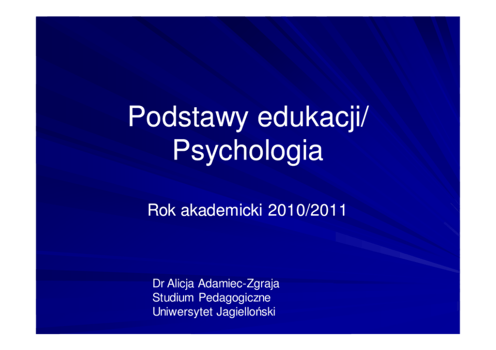 Podstawy edukacji/ Psychologia Rok akademicki 2010/2011 Dr Alicja Adamiec-Zgraja Studium Pedagogiczne Uniwersytet Jagiello ski Wykład III Metody badawcze w psychologii Etyczne zasady prowadzenia bada psychologicznych • Uczestnik bada jako równoprawny partner badacza • Zasady zwi zane z udziałem w psychologicznych - - badaniach naukowych: dobrowolna, u wiadomiona zgoda wolna od jakichkolwiek nacisków (na badanie oraz okoliczno ci ich przeprowadzenia); Ochrona prywatno ci; Ochrona anonimowo ci; Poufno ; Zachowanie granic w relacjach diagnostycznych, diagnostycznych, narz dzia adekwatne do tematu bada ; Ostro no w procesie wnioskowania. wnioskowania. Etyczne zasady prowadzenia bada psychologicznych Podejmowanie bada zgodnie z warto ciami etycznymi swojego zawodu. Rozwa anie przede wszystkim czy dociekania i badania z udziałem ludzi s zgodne z ogólnymi zasadami etyki zawodowej. Przestrzeganie zasady dobrowolno ci, na ka dym etapie badania. Nie podejmowanie bada , które mogłyby przynie cierpienia lub utrat cenionych warto ci przez badany podmiot. Obowi zek poinformowania o aspektach badania i uzyskania zgody np. na dokumentacj wyników. W przypadku bada z udziałem zwierz t unika zadawania cierpie (kodeks etycznoetyczno-zawodowy psychologa - PTP). Metoda naukowa Psycholodzy stosuj metod naukow do empirycznej weryfikacji stawianych hipotez Metoda naukowa Składa si z 5 kroków procesu empirycznego badania hipotez w warunkach zapewniaj cych kontrol wpływu tendencyjno ci i subiektywno ci P.G.Zimbardo,, R.L.Johnson, R.L.Johnson, V.McCann; V.McCann; 2010: 36) s dów ( P.G.Zimbardo Kroki metody naukowej ( P.G.Zimbardo, P.G.Zimbardo, R.L.Johnson, R.L.Johnson, V.McCann; V.McCann; 2010: 37) Podstawowe poj cia Metoda badawcza: badawcza: szeroki sposób zdobywania informacji przez wykonanie wielu czynno ci w celu poznania zjawiska; cało post powania badacza zmierzaj cego do rozwi zania okre lonego problemu naukowego, zbiór technik badawczych (np. studium przypadku) Technika badawcza badawcza:: sposób realizacji wybranej metody badawczej (np. ankieta) Narz dzie badawcze: badawcze: przedmioty słu ce do realizacji jednej wybranej przez badacza techniki (np. kwestionariusz ankiety) Podział metod w psychologii Idiograficzne – cel opis zjawiska, jednostki – bez poszukiwania praw ogólnych np. studium przypadku Nomotetyczne – cel - d enie do wyja nienia zjawisk, podstawa do tworzenia teorii i praw ogólnych Rodzaje zmiennych /zmienne – dana cecha nie przysługuje w taki sam sposób wszystkim badanym/ Jako ciowe – celem jest opis w kategoriach jako ciowych (przyjmuj warto ci nominalne tzn. s opisywane jedynie za pomoc nazwy). Wi kszo z metod jako ciowych ma charakter idiograficzny. Ilo ciowe – skupienie na pomiarze (przyjmuj warto ci liczbowe). Wi kszo z metod ilo ciowych ma charakter nomotetyczny. Typy zmiennych ze wzgl du na typy skali pomiarowej wg S.S.Stevensa (1951) porz dkowe (uporz dkowanie osób według przysługuj cych im warto ci zmiennych) – np. wykształcenie nominalne (jako ciowe, kategorialne) – np. płe interwałowe – (o ile nat enie zmiennej X dla danej osoby jest wi ksze/mniejsze od tej zmiennej dla innej osoby) – np. temperatura, IQ ilorazowe (ile razy dana osoba jest lepsza/gorsza pod wzgl dem danej zmiennej od innej osoby) – np. wiek Techniki stosowane w psychologii Studium przypadku Metoda biograficzna Wywiad Ankieta Analiza wytworów działania Obserwacja Eksperyment psychologiczny Test psychologiczny Techniki projekcyjne Kwestionariusz Socjometria Genogram Studium przypadku Badanie indywidualne Celowe, zaplanowane, wieloaspektowe zebranie informacji o badanej jednostce dla jej opisu, b d diagnozy Wykorzystanie wielu metod np.: – Wywiadu – Testów – Kwestionariuszy – Obserwacji – Testów projekcyjnych Analiza danych: jako ciowa i ilo ciowa Przebieg badania – dopasowany do konkretnego przypadku Metoda biograficzna - Analiza przebiegu ycia jednostki, b d grupy społecznej ujmowana z danej perspektywy Wyodr bniamy: Autobiografi (osoba badana opisuje swoje losy) Psychobiografi (analiza osobowo ci) Biografi tematyczn (analiza losów podmiotu pod k tem zwi zanym z przedmiotem bada ) Historiografi (analiza losów jednostki w danych warunkach historycznych) Socjobiografi (analiza losów danej osoby w okre lonych warunkach społeczno – kulturowych) Wywiad bezpo rednia metoda badania psychologicznego, polegaj ca na swobodnej rozmowie z badanym, prowadzona w celu zdobycia informacji Typy wywiadu Rodzaje pyta skategoryzowany nieskategoryzowany Sposób prowadzenia jawny ukryty jawny nieformalny (ukryty formalny) Liczba osób indywidualny zbiorowy Cel wycinkowy cało ciowy (anamnestyczny) Cechy wywiadu stosunkowo szybkie poznanie osoby badanej bezpo redni kontakt psychiczny z rozmówc motywuj cy wpływ badaj cego na osob badan analiza nie tylko tre ci wypowiedzi ale równie inne danych obserwacyjnych: Kategorie wska ników obserwacyjnych Wska niki konstytucjonalne OBSERWOWANY OBIEKT Wska niki behawioralne Wska niki fizjologiczne OBSERWATOR, PSYCHOLOG Wywiad J zyk – musi by dostosowany do kompetencji komunikacyjnych rozmówcy (badanego) Kolejno zadawanych pyta Rodzaj pyta Zapis wywiadu Rodzaje pyta : pytania otwarte pytania zamkni te pytania wprost Jak Pani reaguje w sytuacji ci gania podczas prac pisemnych? Jak reaguje Pani na ci ganie? zwracam uwag uczniom wpisuj uwag do dziennika udaj , e nie widz wzywam rodziców do szkoły Jak reaguje Pani na brak samodzielno ci w trakcie klasówek, czy testów ? pytania nie wprost – gdzie istotne pytanie ukryte jest w ród pyta nie budz cych oporu pytania projekcyjne – maskuj ce prawdziwy cel pytania wykorzystuj c projekcj Czynniki zakłócaj ce wiarygodno informacji: respondent – celowe lub nie wiadome podawanie fałszywych informacji narz dzie badawcze – niejasno sformułowane pytania, – pytania tendencyjne, nie wyczerpuj ce, brak pyta dotycz cych wa nych zagadnie prowadz cy badania – sugerowanie