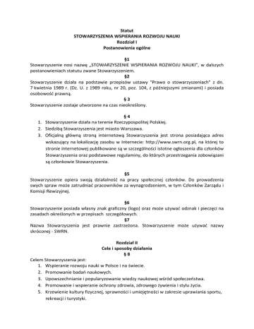 Statut STOWARZYSZENIA WSPIERANIA ROZWOJU NAUKI Rozdział I Postanowienia ogólne §1 Stowarzyszenie nosi nazwę „STOWARZYSZENIE WSPIERANIA ROZWOJU NAUKI”, w dalszych postanowieniach statutu zwane Stowarzyszeniem. §2 Stowarzyszenie działa na podstawie przepisów ustawy "Prawo o stowarzyszeniach" z dn. 7 kwietnia 1989 r. (Dz. U. z 1989 roku, nr 20, poz. 104, z późniejszymi zmianami) i posiada osobowość prawną. §3 Stowarzyszenie zostaje utworzone na czas nieokreślony. §4 1. Stowarzyszenie działa na terenie Rzeczypospolitej Polskiej. 2. Siedzibą Stowarzyszenia jest miasto Warszawa. 3. Oficjalną główną stroną internetową Stowarzyszenia jest strona posiadająca adres wskazujący na lokalizację zasobu w Internecie: http://www.swrn.org.pl, na której to stronie internetowej publikowane są w szczególności istotne ogłoszenia dla członków Stowarzyszenia oraz podstawowe regulaminy, do których przestrzegania zobowiązani są członkowie Stowarzyszenia. §5 Stowarzyszenie opiera swoją działalność na pracy społecznej członków. Do prowadzenia swych spraw może zatrudniać pracowników za wynagrodzeniem, w tym Członków Zarządu i Komisji Rewizyjnej. §6 Stowarzyszenie posiada własny znak graficzny (logo) oraz może używać odznak i pieczęci na zasadach określonych w przepisach szczegółowych. §7 Nazwa Stowarzyszenia jest prawnie zastrzeżona. Stowarzyszenie może używać nazwy skróconej - SWRN. Rozdział II Cele i sposoby działania §8 Celem Stowarzyszenia jest: 1. Wspieranie rozwoju nauki w Polsce i na świecie. 2. Promowanie badań naukowych. 3. Upowszechnianie i popularyzowanie wiedzy naukowej wśród społeczeństwa. 4. Promowanie i wspieranie ochrony zdrowia, zdrowego żywienia i stylu życia. 5. Krzewienie kultury fizycznej, sprawności i umiejętności w zakresie uprawiania sportu, rekreacji i turystyki. 6. Wspieranie innych organizacji pozarządowych o podobnych celach statutowych. 7. Pomoc Członkom stowarzyszenia w szczególnych, trudnych sytuacjach życiowych. 8. Zapewnienie Członkom stowarzyszenia możliwości dostępu do różnych wynegocjowanych grupowych form usług, w tym usług medycznych, prawnych, oraz wszelkich grupowych ubezpieczeń i produktów, w tym inwestycyjnych, a także pomoc w ich realizacji. 9. Wspieranie osób, Członków stowarzyszenia, w zakresie ubezpieczeń, usług i produktów - w tym inwestycyjnych, oraz informowanie o przysługujących im prawach i obowiązkach wynikających z umów ubezpieczeń, zakupu usług i produktów. 10. Negocjowanie w imieniu Członków ofert specjalnych i rabatów na wybrane produkty i usługi. 11. Wspieranie wszelkich przedsięwzięć, które zmierzają do realizacji powyższych celów. §9 Stowarzyszenie realizuje swoje cele poprzez: 1. Organizowanie konferencji, pikników, szkoleń, warsztatów, sympozjów, seminariów oraz innych spotkań i wydarzeń . 2. Udział finansowy i obecność Członków w konferencjach, szkoleniach, sympozjach, seminariach, kongresach i innych wydarzeniach, także w charakterze sponsora, darczyńcy. 3. Zakup sprzętu badawczego, naukowego, edukacyjnego, materiałów, odczynników w celu organizowania pokazów i warsztatów dla dorosłych i młodzieży – w tym Członków stowarzyszenia. 4. Zakup sprzętu, w szczególności badawczego, naukowego, edukacyjnego oraz materiałów, odczynników w celu przekazania ich do użytkowania osobom i podmiotom prowadzącym badania naukowe lub edukacyjne. 5. Działalność promocyjną i wydawniczą. 6. Wspomagania nauki, edukacji, oświaty, wychowania, sportu, turystyki i rekreacji środkami pieniężnymi, rzeczowymi, pracą własną Członków. 7. Fundowanie nagród i stypendiów naukowych, darowizn, dotacji. 8. Organizowanie konkursów i loterii. 9. Stworzenie możliwości korzystania przez Członków z zakupionych lub wynajętych środków trwałych, włącznie z dzierżawą długoterminową, o charakterze sportowo – rekreacyjnym, z zakresu aktywnej turystyki oraz pro-zdrowotnym i rehabilitacyjnym. 10. Organizowanie wydarzeń sportowo - rekreacyjnych oraz o charakterze turystycznym. 11. Udział finansowy i obecność Członków w kursach i szkoleniach sportowo – rekreacyjnych w kraju i za granicą. 12. Promocję swoich celów poprzez współpracę z innymi organizacjami pozarządowymi, uczelniami, podmiotami badawczymi i komercyjnymi. 1. 2. 3. 4. §10 Stowarzyszenie może prowadzić działalność gospodarczą, na ogólnych zasadach określonych w odrębnych przepisach. Dochód z działalności gospodarczej Stowarzyszenia służy realizacji celów statutowych. Stowarzyszenie dopuszcza w swej działalności możliwość przekazywania środków pieniężnych od Członków na zadeklarowane przez nich cele, zgodnie z ich pisemną dyspozycją. Stowarzyszenie może być założycielem, a także członkiem innych organizacji pozarządowych i klubów. Stowarzyszenie może angażować się kapitałowo jako udziałowiec lub akcjonariusz w podmioty prowadzące działalność gospodarczą. Rozdział III Członkowie, ich prawa i obowiązki § 11 1. Członkami Stowarzyszenia mogą być osoby fizyczne i prawne. 2. Osoba prawna może być jedynie Członkiem Wspierającym Stowarzyszenie. § 12 Członkowie Stowarzyszenia dzielą się na: 1) Członków Zwyczajnych, 2) Członków Wspierających, 3) Członków Honorowych. 1. 2. 3. 4. § 13 Członkiem Zwyczajnym Stowarzyszenia może być osoba fizyczna posiadająca pełną zdolność do czynności prawnych i nie pozbawiona praw publicznych, która akceptuje i popiera cele Stowarzyszenia oraz rokuje aktywne zaangażowanie w działalność na rzecz realizacji celów statutowych, a zostanie przyjęta w poczet członków uchwałą Zarządu, za rekomendacją przynajmniej pięciu Członków Zwyczajnych Stowarzyszenia. Członkiem Wspierającym może być osoba fizyczna lub prawna zainteresowana działalnością Stowarzyszenia, która zadeklarowała na jego rzecz pomoc finansową, rzeczową lub dzia
