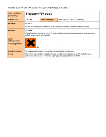 WYCIĄG Z KARTY CHARAKTERYSTYKI SUBSTANCJI NIEBEZPIECZNEJ nazwa związku (synonimy) Siarczan(IV) sodu numer CAS 7757-83-7 zwroty R R: 22-31 charakterystyka ciało stałe, tt. > 500 °C (rozkład) Działa szkodliwie po połknięciu. W kontakcie z kwasami uwalnia toksyczne gazy. zwroty S S: 25-46 Unikać zanieczyszczenia oczu. W razie połknięcia niezwłocznie zasięgnij porady lekarza pokaż opakowanie lub etykietę. znaki ostrzegawcze / inne zagrożenia Xn inne informacje, W przypadku kontaktu z oczami przepłukać dużą ilością wody. uwagi Nie wolno dopuścić do przypadkowego kontaktu wodorosiarczanu(IV) sodu lub jego roztworów z kwasami – wydziela się trujący i duszący tlenek siarki(IV).