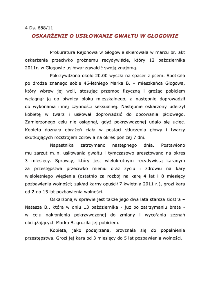 4 Ds. 688/11 OSKARŻENIE O USIŁOWANIE GWAŁTU W GŁOGOWIE Prokuratura Rejonowa w Głogowie skierowała w marcu br. akt oskarżenia przeciwko groźnemu recydywiście, który 12 października 2011r. w Głogowie usiłował zgwałcić swoją znajomą. Pokrzywdzona około 20.00 wyszła na spacer z psem. Spotkała po drodze znanego sobie 46-letniego Marka B. – mieszkańca Głogowa, który wbrew jej woli, stosując przemoc fizyczną i grożąc pobiciem wciągnął ją do piwnicy bloku mieszkalnego, a następnie doprowadził do wykonania innej czynności seksualnej. Następnie oskarżony uderzył kobietę w twarz i usiłował doprowadzić do obcowania płciowego. Zamierzonego celu nie osiągnął, gdyż pokrzywdzonej udało się uciec. Kobieta doznała obrażeń ciała w postaci stłuczenia głowy i twarzy skutkujących rozstrojem zdrowia na okres poniżej 7 dni. Napastnika zatrzymano następnego dnia. Postawiono mu zarzut m.in. usiłowania gwałtu i tymczasowo aresztowano na okres 3 miesięcy. Sprawcy, który jest wielokrotnym recydywistą karanym za przestępstwa przeciwko mieniu oraz życiu i zdrowiu na kary wieloletniego więzienia (ostatnio za rozbój na karę 4 lat i 8 miesięcy pozbawienia wolności; zakład karny opuścił 7 kwietnia 2011 r.), grozi kara od 2 do 15 lat pozbawienia wolności. Oskarżoną w sprawie jest także jego dwa lata starsza siostra – Natasza B., która w dniu 13 października - już po zatrzymaniu brata w celu nakłonienia pokrzywdzonej do zmiany i wycofania zeznań obciążających Marka B. groziła jej pobiciem. Kobieta, jako podejrzana, przyznała się do popełnienia przestępstwa. Grozi jej kara od 3 miesięcy do 5 lat pozbawienia wolności.