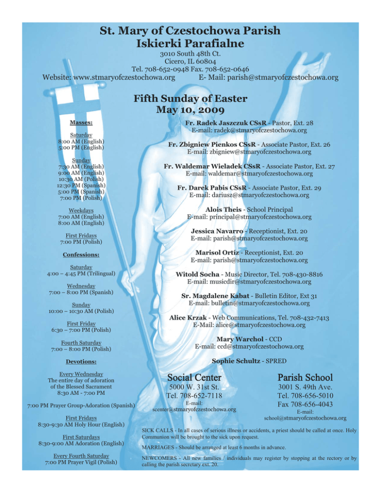 St. Mary of Czestochowa Parish Iskierki Parafialne 3010 South 48th Ct. Cicero, IL 60804 Tel. 708-652-0948 Fax. 708-652-0646 Website: www.stmaryofczestochowa.org E- Mail: [email protected] Fifth Sunday of Easter May 10, 2009 Masses: Saturday 8:00 AM (English) 5:00 PM (English) Sunday 7:30 AM (English) 9:00 AM (English) 10:30 AM (Polish) 12:30 PM (Spanish) 5:00 PM (Spanish) 7:00 PM (Polish) Weekdays 7:00 AM (English) 8:00 AM (English) First Fridays 7:00 PM (Polish) Confessions: Saturday 4:00 – 4:45 PM (Trilingual) Wednesday 7:00 – 8:00 PM (Spanish) Sunday 10:00 – 10:30 AM (Polish) First Friday 6:30 – 7:00 PM (Polish) Fr. Radek Jaszczuk CSsR - Pastor, Ext. 28 E-mail: [email protected] Fr. Zbigniew Pienkos CSsR - Associate Pastor, Ext. 26 E-mail: [email protected] Fr. Waldemar Wieladek CSsR - Associate Pastor, Ext. 27 E-mail: [email protected] Fr. Darek Pabis CSsR - Associate Pastor, Ext. 29 E-mail: [email protected] Alois Theis - School Principal E-mail: [email protected] Jessica Navarro - Receptionist, Ext. 20 E-mail: [email protected] Marisol Ortíz - Receptionist, Ext. 20 E-mail: [email protected] Witold Socha - Music Director, Tel. 708-430-8816 E-mail: [email protected] Sr. Magdalene Kabat - Bulletin Editor, Ext 31 E-mail: [email protected] Alice Krzak - Web Communications, Tel. 708-432-7413 E-Mail: [email protected] Fourth Saturday 7:00 – 8:00 PM (Polish) Mary Warchol - CCD E-mail: [email protected] Devotions: Sophie Schultz - SPRED Every Wednesday The entire day of adoration of the Blessed Sacrament 8:30 AM - 7:00 PM 7:00 PM Prayer Group-Adoration (Spanish) First Fridays 8:30-9:30 AM Holy Hour (English) First Saturdays 8:30-9:00 AM Adoration (English) Every Fourth Saturday 7:00 PM Prayer Vigil (Polish) Social Center Parish School 5000 W. 31st St. Tel. 708-652-7118 3001 S. 49th Ave. Tel. 708-656-5010 Fax 708-656-4043 E-mail: [email protected] E-mail: [email protected] SICK CALLS - In all cases of serious illness or accidents, a priest should be called at once. Holy Communion will be brought to the sick upon request. MARRIAGES - Should be arranged at least 6 months in advance. NEWCOMERS - All new families / individuals may register by stopping at the rectory or by calling the parish secretary ext. 20. Sunday May 10, Fifth Sunday of Easter 7:30 For all Mothers living and deceased 9:00 For all Mothers living and deceased 10:10 Nabożeństwo Majowe 10:30 Za wszystkie Matki żyjące i zmarłe 12:30 Por todas las Madres vivas y muertas 5:00 Por todas las Madres vivas y muertas 7:00 Za wszystkie Matki żyjące i zmarłe May 11, Monday, Easter Weekday 7:00 †Darlene Burke (Mother) 8:00 †Leopold Łazarski (5 rocz. śm., od Matki) May 12, Tuesday, Easter Weekday 7:00 For parishioners 8:00 †Edward Kurcab May 13, Wednesday, Our Lady of Fatima 7:00 †For the Holy Souls in the Book of Remembrance 8:00 †For the Holy Souls in the Book of Remembrance 8:30 Eucharistic Adoration until 7PM 7PM El Circulo de Oración May 14, Thursday, Matthias, apostle 7:00 †For the Holy Souls in the Book of Remembrance 8:00 †For the Holy Souls in the Book of Remembrance May 15, Friday, Easter Weekday 7:00 †Zofia Lew (w dniu imienin o wieczne szczęście ) 8:00 O zdrowie, Boże bł. i pokój w rodzinie Bystrek May 16, Saturday, Easter Weekday 8:00 †For the Holy Souls in the Book of Remembrance 11:00 Wedding : Beata Guzy & Dariusz Dudek 5:00 †Helen Natonski (Lawry) †Frank & Jennie Walter (Dolores Walter) †Helen Skowian (Frances & Clara Zima) †Antoinette Paida (Karolyn Paida) †Edward J. Slepicka (Rita & Andy) †Zorka Blazevc (fran Slepicka) May 17, Sixth Sunday of Easter 7:30 Parishioners 9:00 †Bernice Kryzaniak (Bernice & Marie) 10:10 Nabożeństwo Majowe 10:30 O Boże bł. w dniu urodzin dla Ojca Zbigniewa Pieńkos O Boże bł. dla Rodziny Gabryś Iskierki Parafialne Za Annę i Tadeusza †Halina & Stanley Czykier †Fr. Mac †Edward Ptak (od żony i dzieci) †Władysława Gabryś (syn z rodziną) †Józef Pałka †Stanisław Gawron i córka Józefa Gawron) †Franciszek Górka (30 rocz. śm.) †Maria Kisielewska (5th anniv.) 12:30 †Filimon Corona (familia) †Erasmo Zavala Sr. (su hijo y nietos) 5PM Por los feligreses 7:PM †Stanley Maka (wife) Lector Schedule May 16, 2009 5:00 Martha Stolarski, Marie Jarding May 17 2009 7:30 John Kociolko 9:00 , Helen Cison, Michael Yunker 10:30 Alicja Krzak, Arek Topór 12:30 Roberto Pasillas, Linda Ramirez, Juan Rodriguez, Miriam Campagne 5PM Los Niños Eucharistic Ministers May 16, 2009 5:00 Jean Yunker, Larry Napoletano May 17, 2009 7:30 Ed Hennessy 9:00 Christina Zaragozai, Rafael Ayala, Myra Rodriguez, John Kulaga 10:30 Waldemar Lipka 12:30 Ma. Cruz Rodriguez, Juana Salas, Javier Hernandez 5:00 Martha Tamayo, Humberto Telles WEDDING BANNS There is a promise of marriage between…. III. Beata Guzy & Dariusz Dudek I. Katarzyna Milanowska & Karol Nycz We welcome in Baptism….. Daisy Sophia Campos Julia Guel Carrillo Camila Paula Mercado Alexis Pilado Julian Javier Rico St. Mary of Czestochowa Sunday Collection: May 3, 2009 Golden Wedding Anniversary Mass The Family Ministries Office of the Archdiocese of Chicago is sponsoring a GOLDEN WEDDING ANNIVERSARY MASS to be held on Sunday, August 30, 2009 at St. John Brebeuf Church in Niles. Couples married in 1959 who are interested in attending this celebration should contact their parish to register. In order for the sponsors to have adequate time to prepare the invitations, the deadline for notifying our parish office of your intention to attend this celebration is May 29, 2009. After that day, the couple can call directly at 312-534-8351 or you can register online at www.family ministries.org. SPRED RELIGIOUS FORMATION FOR DEVELOPMENTALLY DISABLED: The Divine Providence Parish SPRED CENTER is specially designed to provide religious education for children ages 6yrs to 10yrs. Children with disabilities deserve to grow in faith, and this program is devoted to serving them. The Archdiocese of Ch