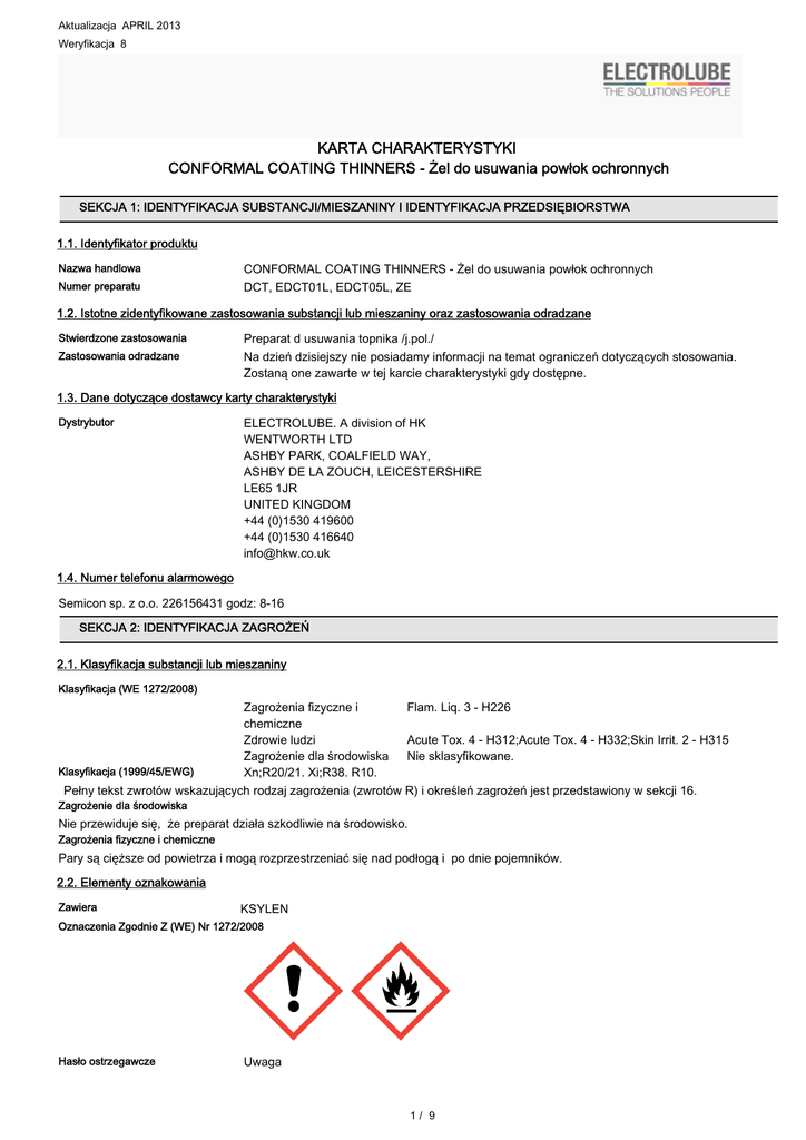 Aktualizacja APRIL 2013 Weryfikacja 8 KARTA CHARAKTERYSTYKI CONFORMAL COATING THINNERS - Żel do usuwania powłok ochronnych SEKCJA 1: IDENTYFIKACJA SUBSTANCJI/MIESZANINY I IDENTYFIKACJA PRZEDSIĘBIORSTWA 1.1. Identyfikator produktu Nazwa handlowa Numer preparatu CONFORMAL COATING THINNERS - Żel do usuwania powłok ochronnych DCT, EDCT01L, EDCT05L, ZE 1.2. Istotne zidentyfikowane zastosowania substancji lub mieszaniny oraz zastosowania odradzane Stwierdzone zastosowania Zastosowania odradzane Preparat d usuwania topnika /j.pol./ Na dzień dzisiejszy nie posiadamy informacji na temat ograniczeń dotyczących stosowania. Zostaną one zawarte w tej karcie charakterystyki gdy dostępne. 1.3. Dane dotyczące dostawcy karty charakterystyki Dystrybutor ELECTROLUBE. A division of HK WENTWORTH LTD ASHBY PARK, COALFIELD WAY, ASHBY DE LA ZOUCH, LEICESTERSHIRE LE65 1JR UNITED KINGDOM +44 (0)1530 419600 +44 (0)1530 416640 [email protected] 1.4. Numer telefonu alarmowego Semicon sp. z o.o. 226156431 godz: 8-16 SEKCJA 2: IDENTYFIKACJA ZAGROŻEŃ 2.1. Klasyfikacja substancji lub mieszaniny Klasyfikacja (WE 1272/2008) Zagrożenia fizyczne i Flam. Liq. 3 - H226 chemiczne Zdrowie ludzi Acute Tox. 4 - H312;Acute Tox. 4 - H332;Skin Irrit. 2 - H315 Zagrożenie dla środowiska Nie sklasyfikowane. Klasyfikacja (1999/45/EWG) Xn;R20/21. Xi;R38. R10. Pełny tekst zwrotów wskazujących rodzaj zagrożenia (zwrotów R) i określeń zagrożeń jest przedstawiony w sekcji 16. Zagrożenie dla środowiska Nie przewiduje się, że preparat działa szkodliwie na środowisko. Zagrożenia fizyczne i chemiczne Pary są cięższe od powietrza i mogą rozprzestrzeniać się nad podłogą i po dnie pojemników. 2.2. Elementy oznakowania Zawiera KSYLEN Oznaczenia Zgodnie Z (WE) Nr 1272/2008 Hasło ostrzegawcze Uwaga 1/ 9 CONFORMAL COATING THINNERS - Żel do usuwania powłok ochronnych Zwroty wskazujące rodzaj zagrożenia Zwroty wskazujące środki ostrożności H226 H312 H315 H332 Łatwopalna ciecz i pary. Działa szkodliwie w przypadku kontaktu ze skórą. Działa drażniąco na skórę. Działa szkodliwie w następstwie wdychania. P280 Stosować rękawice ochronne, ochronę oczu i twarzy. P210 Przechowywać z dala od źródeł ciepła/iskrzenia/otwar tego ognia/gorących powierzchni. Palenie wzbronione. Unikać wdychania par/rozpylonej cieczy. W PRZYPADKU DOSTANIA SIĘ NA SKÓRĘ: Umyć dużą ilością wody z mydłem. W przypadku wystąpienia podrażnienia skóry: Zasięgnąć porady/zgłosić się pod opiekę lekarza. Przechowywać w dobrze wentylowanym miejscu. Przechowywać w chłodnym miejscu. Dodatkowe zwroty wskazujące środki ostrożności P261 P302+352 P332+313 P403+235 Informacje uzupełniające na etykiecie EUH208 Zawiera OKSYM BUTAN-2-ONU. Może powodować wystąpienie reakcji alergicznej. 2.3. Inne zagrożenia Nieklasyfikowany jako PBT / vPvB na podstawie obecnych kryteriów UE. SEKCJA 3: SKŁAD/INFORMACJA O SKŁADNIKACH 3.2. Mieszaniny KSYLEN Numer CAS: 1330-20-7 80-100% Numer WE: 215-535-7 Klasyfikacja (WE 1272/2008) Flam. Liq. 3 - H226 Acute Tox. 4 - H312 Acute Tox. 4 - H332 Skin Irrit. 2 - H315 Klasyfikacja (67/548/EWG) R10 Xn;R20/21 Xi;R38 OKSYM BUTAN-2-ONU Numer CAS: 96-29-7 <0.5% Numer WE: 202-496-6 Klasyfikacja (WE 1272/2008) Acute Tox. 4 - H312 Eye dam. 1 - H318 Skin Sens. 1 - H317 Carc. 2 - H351 Klasyfikacja (67/548/EWG) Carc. Cat. 3;R40 Xn;R21 R43 Xi;R41 Pełny tekst zwrotów wskazujących rodzaj zagrożenia (zwrotów R) i określeń zagrożeń jest przedstawiony w sekcji 16. Uwagi względem składu Składniki nie wymienione są zakwalifikowe jako sybstancje nieszkodliwe lub w stężeniu poniżej dopuszczalnego poziomu. SEKCJA 4: ŚRODKI PIERWSZEJ POMOCY 4.1. Opis środków pierwszej pomocy Wdychanie Niezwłocznie wynieść/wyprowadzić osobę narażoną na wdychanie na świeże powietrze. Zapewnić poszkodowanej osobie ciepło i odpoczynek. Zapewnić niezwłoczną opiekę lekarską. Spożycie NIE WYWOŁYWAĆ WYMIOTÓW! Dokładnie wypłukać usta. Natychmiast zapewnić opiekę lekarską! 2/ 9 CONFORMAL COATING THINNERS - Żel do usuwania powłok ochronnych Kontakt ze skórą Natychmiast umyć skórę wodą z mydłem. Jeśli podrażnienie nie zniknie po myciu, skontaktować się z lekarzem. Kontakt z oczami Przed płukaniem upewnić się, że ewentualne soczewki kontaktowe zostały wyjęte z oczu. Niezwłocznie przemyć oczy dużą ilością wody, podnosząc powieki. Kontynuować płukanie przez co najmniej 15 minut. W przypadku utrzymującego się podrażnienia skontaktować się z lekarzem. Use tepid water for rinsing 4.2. Najważniejsze ostre i opóźnione objawy oraz skutki narażenia 4.3. Wskazania dotyczące wszelkiej natychmiastowej pomocy lekarskiej i szczególnego postępowania z poszkodowanym Leczyć objawowo. SEKCJA 5: POSTĘPOWANIE W PRZYPADKU POŻARU 5.1. Środki gaśnicze Środki gaśnicze Pożar można ugasić stosując: Piana. Suche środki chemiczne, piasek, dolomit itp. 5.2. Szczególne zagrożenia związane z substancją lub mieszaniną Niebezpieczne produkty spalania Wskutek rozkładu termicznego lub spalania mogą uwalniać się tlenki węgla i inne toksyczne gazy oraz pary. Nadzwyczajne zagrożenia pożarowe i wybuchowe Puszki aerozolu mogą wybuchnąć w płomieniach. Może wybuchnąć wskutek podgrzania albo narażenia na płomienie bądź iskry. Pary są cięższe od powietrza i mogą rozprzestrzeniać się nad ziemią do źródeł zapłonu. Zagrożenia specyficzne Wskutek silnego nagrzania powstaje nadciśnienie grożące wybuchowym rozsadzeniem pojemnika aerozolu. 5.3. Informacje dla straży pożarnej Szczególne Procedury Gasnicze Unikać wdychania par z pożaru. Pojemniki narażone na pożar chłodzić wodą jeszcze długo po ugaszeniu pożaru. Środki ochrony personelu straży pożarnej W warunkach pożarowych stosować urządzenia oddechowe z własnym obiegiem powietrza i odzież ochronną na całe ciało. SEKCJA 6: POSTĘPOWANIE W PRZYPADKU NIEZAMIERZONEGO UWOLNIENIA DO