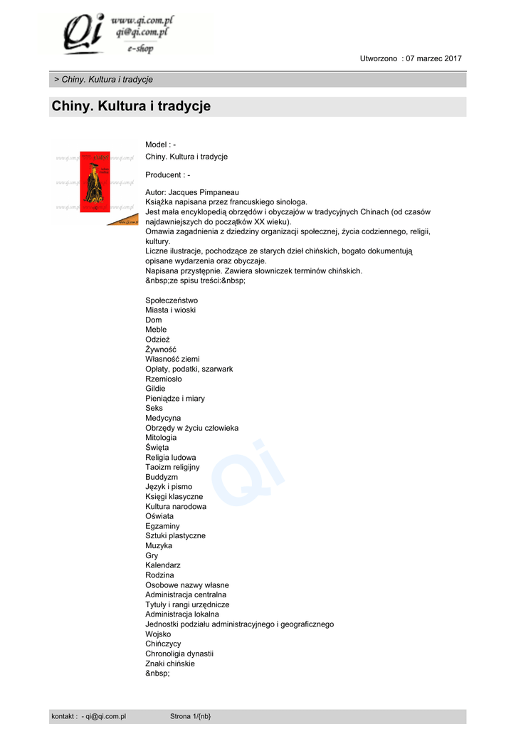 Utworzono : 07 marzec 2017 > Chiny. Kultura i tradycje Chiny. Kultura i tradycje Model : Chiny. Kultura i tradycje Producent : Autor: Jacques Pimpaneau Książka napisana przez francuskiego sinologa. Jest mała encyklopedią obrzędów i obyczajów w tradycyjnych Chinach (od czasów najdawniejszych do początków XX wieku). Omawia zagadnienia z dziedziny organizacji społecznej, życia codziennego, religii, kultury. Liczne ilustracje, pochodzące ze starych dzieł chińskich, bogato dokumentują opisane wydarzenia oraz obyczaje. Napisana przystępnie. Zawiera słowniczek terminów chińskich. ze spisu treści: Społeczeństwo Miasta i wioski Dom Meble Odzież Żywność Własność ziemi Opłaty, podatki, szarwark Rzemiosło Gildie Pieniądze i miary Seks Medycyna Obrzędy w życiu człowieka Mitologia Święta Religia ludowa Taoizm religijny Buddyzm Język i pismo Księgi klasyczne Kultura narodowa Oświata Egzaminy Sztuki plastyczne Muzyka Gry Kalendarz Rodzina Osobowe nazwy własne Administracja centralna Tytuły i rangi urzędnicze Administracja lokalna Jednostki podziału administracyjnego i geograficznego Wojsko Chińczycy Chronoligia dynastii Znaki chińskie i Q kontakt : - [email protected] Strona 1/{nb} Utworzono : 07 marzec 2017 > Chiny. Kultura i tradycje Chiny. Kultura i tradycje Format 23,5cm x 16,5cm, 318 stron, okładka barwna, miękka, wewnątrz czarno-białe ilustracje rok wydania: 2001 Cena : 37,00 zł Brutto ( 37,00 zł Netto) Dostępność: Produkt dostępny w naszym sklepie od 06 kwiecień 2007 i Q kontakt : - [email protected] Strona 2/{nb}