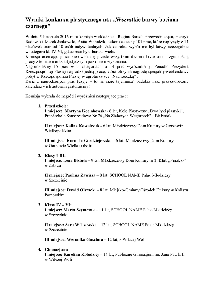 Wyniki konkursu plastycznego nt.: „Wszystkie barwy bociana czarnego” W dniu 5 listopada 2016 roku komisja w składzie: - Regina Bartek- przewodnicząca, Henryk Radowski, Marek Jankowski, Anita Wołodzik, dokonała oceny 101 prac, które napłynęły z 14 placówek oraz od 10 osób indywidualnych. Jak co roku, wybór nie był łatwy, szczególnie w kategorii kl. IV-VI, gdzie prac było bardzo wiele. Komisja oceniając prace kierowała się przede wszystkim dwoma kryteriami - zgodnością pracy z tematem oraz artystycznym poziomem wykonania. Nagrodziliśmy 15 prac w 5 kategoriach, a 14 prac wyróżniliśmy. Ponadto Prezydent Rzeczpospolitej Ptasiej nagrodził jedną pracę, która otrzyma nagrodę specjalną-weekendowy pobyt w Rzeczpospolitej Ptasiej w agroturystyce „Nad rzeczką” . Dwie z nagrodzonych prac (czyje – to na razie tajemnica) ozdobią nasz przyszłoroczny kalendarz - ich autorom gratulujemy! Komisja wybrała do nagród i wyróżnień następujące prace: 1. Przedszkole: I miejsce: Martyna Kociakowska- 6 lat, Koło Plastyczne „Dwa łyki plastyki”, Przedszkole Samorządowe Nr 76 „Na Zielonych Wzgórzach” - Białystok II miejsce: Kalina Kowalczuk - 6 lat, Młodzieżowy Dom Kultury w Gorzowie Wielkopolskim III miejsce: Kornelia Gordziejewska – 6 lat, Młodzieżowy Dom Kultury w Gorzowie Wielkopolskim 2. Klasy I-III: I miejsce: Lena Bistuła – 9 lat, Młodzieżowy Dom Kultury nr 2, Klub „Pinokio” w Zabrzu II miejsce: Paulina Zawisza – 8 lat, SCHOOL NAME Pałac Młodzieży w Szczecinie III miejsce: Dawid Olszacki – 8 lat, Miejsko-Gminny Ośrodek Kultury w Kaliszu Pomorskim 3. Klasy IV – VI: I miejsce: Marta Szymczak – 11 lat, SCHOOL NAME Pałac Młodzieży w Szczecinie II miejsce: Sara Wilczewska – 12 lat, SCHOOL NAME Pałac Młodzieży w Szczecinie III miejsce: Weronika Guściora – 12 lat, z Wilczej Woli 4. Gimnazjum: I miejsce: Karolina Kołodziej – 14 lat, Publiczne Gimnazjum im. Jana Pawła II w Wilczej Woli II miejsce: Marta Wilczewska – 16 lat, SCHOOL NAME Pałac Młodzieżowy w Szczecinie III miejsce: Marta Kawecka – 15 lat, Zespół Szkół w Leśmierzu (Gimnazjum), Ozorków 5. Dorośli: I miejsce: Anna Bajon - lat 18, z Polkowic II miejsce: Anna Pilch, Młodzieżowy Dom Kultury nr 2, Klub „Pinokio” z Zabrza III miejsce: Maria Szeliga- 56 lat, Młodzieżowy Dom Kultury nr 2, Klub „Pinokio” z Zabrza Nagrodę Prezydenta Rzeczpospolitej Ptasiej otrzymała Karolina Kołodziej z Publicznego Gimnazjum im. Jana Pawła II w Wilczej Woli PRACE WYRÓŻNIONE: 1. Jan Poznański – 6 lat, Prywatna Szkoła Podstawowa i Gimnazjum o profilu artystycznym w Gorzowie Wielkopolskim 2. Martyna Gniadek- 6 lat, Młodzieżowy Dom Kultury w Gorzowie Wielkopolskim 3. Daria Parafinowicz- 6 lat, Koło Plastyczne „Dwa łyki plastyki”, Przedszkole Samorządowe Nr 76 „Na Zielonych Wzgórzach” – Białystok 4. Ewa Mruk- 8 lat, Miejsko-Gminny Ośrodek Kultury w Kaliszu Pomorskim 5. Kalina Burdyńska- 9 lat, Miejsko-Gminny Ośrodek Kultury w Kaliszu Pomorskim 6. Aleksandra Wochniak- 7,5 lat, Młodzieżowy Dom Kultury w Gorzowie Wielkopolskim 7. Pola Karpińska- 7 lat, Prywatna Szkoła Podstawowa i Gimnazjum o profilu artystycznym w Gorzowie Wielkopolskim 8. Gabriela Rojek- 11 lat, z Wilczej Woli 9. Bartosz Kowal- VI klasa, Zespół Szkół im. Jana Pawła II w Wilczej Woli 10. Jakub Chłosta- VI klasa, Prywatna Szkoła Podstawowa i Gimnazjum o profilu artystycznym w Gorzowie Wielkopolskim 11. Joanna Serafin- 15 lat, Polkowickie Towarzystwo Kulturalno-Edukacyjne „IKAR” w Polkowicach 12. Marek Brzezicki- 13,5 lat, Szkoła Podstawowa nr 2 im. Przyjaciół Ziemi w Kostrzynie nad Odrą 13. Marek Ławoński- 15 lat, Szkoła Podstawowa nr 2 im. Przyjaciół Ziemi w Kostrzynie nad Odrą 14. Michał Kizuk- 13,5 lat, Szkoła Podstawowa nr 2 im. Przyjaciół Ziemi w Kostrzynie nad Odrą Do wszystkich placówek, które wzięły udział w konkursie prześlemy w styczniu podziękowanie i kalendarze Rzeczpospolitej Ptasiej. Nagrody i wyróżnienia rozdane będą na Zlocie Obywateli w 2017 roku lub rozesłane pocztą do osób nieobecnych na Zlocie. Serdecznie dziękujemy wszystkim za udział w konkursie i gratulujemy zwycięstwa. Prace nadesłali: 1. Miejski Dom Kultury w Myszkowie 2. Prywatna Szkoła Podstawowa i Gimnazjum o profilu artystycznym w Gorzowie Wielkopolskim 3. Miejsko-Gminny Ośrodek Kultury w Kaliszu Pomorskim 4. Przedszkole Samorządowe nr 76 na Zielonych Wzgórzach, Białystok 5. Młodzieżowy Dom Kultury nr 2, ul. 3 Maja 12, w Zabrzu 6. Młodzieżowy Dom Kultury nr 2, ul. Gagarina, w Zabrzu 7. Gimnazjum nr 2 w Polkowicach 8. Polkowickie Towarzystwo Kulturalno-Edukacyjne "Ikar" w Polkowicach 9. Szkoła Podstawowa nr 2 im. Przyjaciół Ziemi w Kostrzynie nad Odrą 10. Zespół Szkół w Leśmierzu 11. Młodzieżowy Dom Kultury w Gorzowie Wielkopolskim 12. Zespół Szkół im. Jana Pawłą II z Wilczej Woli 13. Ognisko Artystyczne przy ZSiPA w Nysie 14. Pałac Młodzieży PCE w Szczecinie Osoby indywidualne: 1. Tomasz Jaros z Wilczej Woli 2. Weronika Gościora z Wilczej Woli 3. Aleksandra Rojek z Wilczej Woli 4. Gabriela Rojek z Wilczej Woli 5. Waldemar Paszke z Ryjewa 6. Gabriel Laskowski z Wilczej Woli 7. Marek Borowski z Łomży 8. Jagoda Matejek z Wilczej Woli 9. Jolanta Pestrowicz z Gorzowa Wielkopolskiego 10. Jakub Paluch z Poznania