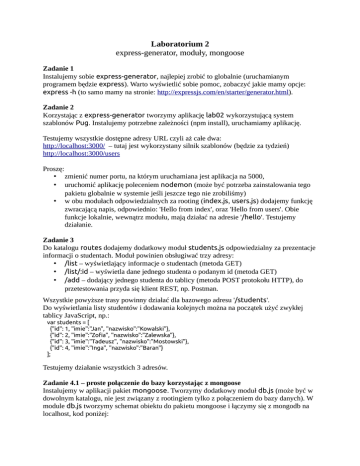 Korzystając z express-generator tworzymy aplikację lab02 wykorzystującą system