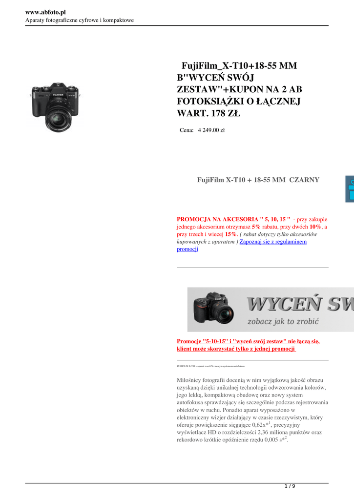 www.abfoto.pl Aparaty fotograficzne cyfrowe i kompaktowe FujiFilm_X-T10+18-55 MM B"WYCEŃ SWÓJ ZESTAW"+KUPON NA 2 AB FOTOKSIĄŻKI O ŁĄCZNEJ WART. 178 ZŁ Cena: 4 249.00 zł FujiFilm X-T10 + 18-55 MM CZARNY PROMOCJA NA AKCESORIA " 5, 10, 15 " - przy zakupie jednego akcesorium otrzymasz 5% rabatu, przy dwóch 10%, a przy trzech i wiecej 15%. ( rabat dotyczy tylko akcesoriów kupowanych z aparatem ) Zapoznaj się z regulaminem promocji Promocje "5-10-15" i "wyceń swój zestaw" nie łączą się, klient może skorzystać tylko z jednej promocji FUJIFILM X-T10 – aparat z serii X z nowym systemem autofokusa Miłośnicy fotografii docenią w nim wyjątkową jakość obrazu uzyskaną dzięki unikalnej technologii odwzorowania kolorów, jego lekką, kompaktową obudowę oraz nowy system autofokusa sprawdzający się szczególnie podczas rejestrowania obiektów w ruchu. Ponadto aparat wyposażono w elektroniczny wizjer działający w czasie rzeczywistym, który oferuje powiększenie sięgające 0,62x*1, precyzyjny wyświetlacz HD o rozdzielczości 2,36 miliona punktów oraz rekordowo krótkie opóźnienie rzędu 0,005 s*2. 1/9 www.abfoto.pl Aparaty fotograficzne cyfrowe i kompaktowe W modelu X-T10 zastosowano matrycę APS-C X-Trans™*3 CMOS II z wbudowaną obsługą autofokusa z detekcją fazową. Połączenie wysokowydajnego mechanizmu przetwarzania obrazu, możliwości obiektywów FUJINON i unikalnej technologii odwzorowania kolorów sprawia, że aparat uzyskuje znakomitą rozdzielczość i bardzo dobrą jakość obrazu. Nowy system autofokusa w modelu X-T10 oferuje tradycyjny, 49-punktowy tryb pojedynczy, który cechuje duża szybkość i precyzja, a także dwa nowe tryby: strefowy i szeroki ze śledzeniem, w których ruchome obiekty są śledzone w większym, 77-punktowym polu, co znacznie usprawnia rejestrowanie takich obiektów. Należy także wspomnieć o trybie AF-C oraz trybie zdjęć seryjnych pracującym z szybkością do 8,0 kl./s*4. Wszystko to sprawia, że aparat oferuje wysoką jakość zdjęć znaną z serii X w jeszcze większym spektrum warunków fotografowania. Najważniejsze zalety aparatu Fujifilm X-T10 Nowa konstrukcja łącząca możliwości serii X z lekką, kompaktową obudową Lekka i kompaktowa obudowa aparatu została zaprojektowana tak, aby zachować wszelkie charakterystyczne elementy serii X. Górną i dolną płytkę wykonano z lekkiego, ale bardzo wytrzymałego odlewu magnezu. Na górnej płytce znajdują się trzy precyzyjnie wykonane, aluminiowe pokrętła, które nadają modelowi X-T10 najwyższej klasy wygląd i umożliwiają fotografowi intuicyjną zmianę ustawień przysłony, czasu naświetlania i funkcji fotografowania bez odrywania jego uwagi od rejestrowanych obiektów. Z tyłu aparatu znajduje się 3-calowy, odchylany wyświetlacz LCD o rozdzielczości 920 tysięcy punktów, który przydaje się zarówno podczas wykonywania zdjęć nad głowami, jak i tuż przy ziemi. Producent przygotował dwie wersje kolorystyczne do wyboru: czarną i srebrną. Przełącznik trybu automatycznego pozwala włączyć w pełni automatyczny, zaawansowany tryb SR AUTO. W trybie tym aparat sam dobiera ustawienia optymalne dla danej sceny, maksymalnie ułatwiając fotografowanie. Aparat można dostosować do indywidualnych potrzeb, odpowiednio konfigurując dwa pokrętła sterujące i siedem przycisków funkcyjnych. W środkowej części górnej płytki korpusu znajduje się wbudowana, wyskakująca lampa błyskowa. Dzięki technologii Super Intelligent Flash lampa automatycznie dobiera intensywność światła do danej sceny. Wizjer działający w czasie rzeczywistym Duży i szybki wizjer aparatu X-T10 oferuje powiększenie 0,62x i opóźnienie rzędu zaledwie 0,005 s. Wyraźny podgląd 2/9 www.abfoto.pl Aparaty fotograficzne cyfrowe i kompaktowe na żywo w jakości HD uzyskano dzięki zastosowaniu nowego, elektronicznego wizjera z organicznym panelem EL o rozdzielczości 2,36 miliona punktów. Widoczność została poprawiona dzięki automatycznej regulacji jasności wizjera dostosowywanej do intensywności światła w otoczeniu. Zapewniający podgląd na żywo wyświetlacz można również ustawić w tryb podglądu efektu fotograficznego (Preview Pic. Effect), który potrafi odzwierciedlać różne warunki fotografowania lub pokazywać naturalny widok zbliżony do tego, co widzi ludzkie oko. Czujnik oka w wizjerze automatycznie przełącza wyświetlane informacje, gdy aparat jest ustawiony pionowo - to coś, co nie jest możliwe w modelach z wizjerem optycznym. Połączenie matrycy X-Trans™ CMOS II z procesorem EXR II zapewniające wyjątkową jakość obrazu i szybkość działania Aparat jest wyposażony w matrycę Fujifilm APS-C X-Trans™ CMOS II 16,3 MPix. Zastosowana w niej unikalna matryca filtrów kolorów z losowym wzorcem ogranicza występowanie prążków mory i błędne odwzorowania kolorów bez konieczności stosowania optycznego filtra dolnoprzepustowego. Brak filtra dolnoprzepustowego, który pogarsza jakość obrazu, oznacza, że do matrycy dociera większa ilość światła. Matryca współpracuje z przetwarzającym obraz procesorem EXR II, co zapewnia wyjątkową rozdzielczość przy niskim poziomie szumów. Firma Fujifilm połączyła możliwości procesora w zakresie redukcji szumów z odpowiednią technologią montażu płytek drukowanych, aby ograniczyć występowanie szumów na zdjęciach wykonywanych z dużą czułością, dzięki czemu użytkownicy aparatu mają do dyspozycji czułość ISO o wartości sięgającej 51200*5. Zatem nawet po ustawieniu tak wysokiej czułości poziom szumów pozostaje niski, a czarne odcienie są nadal intensywne, co stwarza więcej możliwości podczas fotografowania przy słabym świetle. Aparat jest wyposażony w unikalny optymalizator modulacji obiektywu*6, który dzięki zastosowanej technologii przetwarzania obrazu zapewnia najwyższą możliwą jakość zdjęć. Optymalizator wykorzystuje wydajność i c