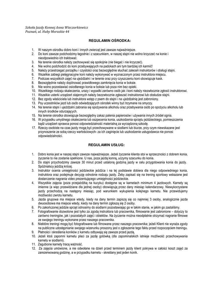 Szkoła Jazdy Konnej Anna Wieczorkiewicz Poznań, ul. Huby Moraskie 44 REGULAMIN OŚRODKA: 1. 2. 3. 4. 5. 6. 7. 8. 9. 10. 11. 12. 13. 14. 15. 16. 17. W naszym ośrodku dobro koni i innych zwierząt jest zawsze najważniejsze. Do koni zawsze podchodzimy łagodnie i z szacunkiem, w naszej stajni nie wolno krzyczeć na konie i nieodpowiednio ich traktować. Na terenie ośrodka należy zachowywać się spokojnie (nie biegać i nie krzyczeć). Nie wolno podchodzić do koni przebywających na padokach ani tym bardziej ich karmić! Należy przestrzegać porządku i czystości oraz bezwzględnie słuchać zaleceń instruktorów i obsługi stajni. Wszelkie zabiegi pielęgnacyjne koni należy wykonywać w wyznaczonym przez instruktora miejscu. Podczas wszystkich zajęć na ujeżdżalni i w terenie oraz przy czyszczeniu koni obowiązuje kask. Bezwzględnie należy dopilnować prawidłowego zamknięcia konia w boksie. Nie wolno pozostawiać osiodłanego konia w boksie lub poza nim bez opieki. Wszelkiego rodzaju skaleczenia, urazy i wypadki zarówno osób jak i koni należy niezwłocznie zgłosić instruktorowi. Wszelkie usterki urządzeń stajennych należy bezzwłocznie zgłaszać instruktorowi lub obsłudze stajni. Bez zgody właściciela lub instruktora wstęp z psem do stajni i na ujeżdżalnię jest zabroniony. Psy uczestników jazd lub osób odwiedzających ośrodek winny być trzymane na smyczy. Na terenie stajni i ujeżdżalni zabrania się spożywania alkoholu oraz przebywania osób po spożyciu alkoholu lub innych środków odurzających. Na terenie ośrodka obowiązuje bezwzględny zakaz palenia papierosów i używania innych źródeł ognia. W przypadku umyślnego okaleczenia lub oszpecenia konia, uszkodzenia sprzętu jeździeckiego, pomieszczenia bądź urządzeń sprawca ponosi odpowiedzialność materialną za wyrządzoną szkodę. Rzeczy osobiste na czas jazdy mogą być przechowywane w siodlarni lub biurze, przy czym niewskazane jest przynoszenie ze sobą rzeczy wartościowych- za ich zaginięcie lub uszkodzenie usługodawca nie ponosi odpowiedzialności. REGULAMIN USŁUG: 1. Dobro konia jest w naszej stajni zawsze najważniejsze. Jeżeli życzenie klienta stoi w sprzeczności z dobrem konia, życzenie to nie zostanie spełnione. U nas, poza jazdą konną, uczymy szacunku do konia. 2. Do stajni przychodzimy zawsze 30 minut przed ustaloną godziną jazdy w celu przygotowania konia do jazdy. Spóźnialscy jeżdżą krócej. 3. Instruktor ocenia umiejętności jeździeckie jeźdźca i na tej podstawie dobiera dla niego odpowiedniego konia, instruktora oraz podejmuje decyzję odnośnie rodzaju jazdy. Żeby zapisać się na trening sportowy wskazane jest dostarczenie nagrania video prezentującego umiejętności jeździeckie. 4. Wszystkie zajęcia (poza przejażdżką na kucyku) dostępne są w karnetach minimum 4 jazdowych. Karnety są imienne (a więc przewidziane dla jednej osoby) obowiązują przez dany miesiąc kalendarzowy. Niewykorzystane jazdy przechodzą na następny miesiąc, pod warunkiem wykupienia kolejnego karnetu. Nie przewidujemy możliwości zwrotu karnetu. 5. Jazda grupowa ma miejsce wtedy, kiedy na dany termin zapiszą się co najmniej 3 osoby, analogicznie jazda dwuosobowa ma miejsce wtedy, kiedy na dany termin zgłoszą się 2 osoby. 6. Po zakończonej jeździe sprzęt odnosimy do siodlarni pozostawiając go w takim stanie, w jakim go zastaliśmy. 7. Fotografowanie dozwolone jest tylko za zgodą instruktora lub pracownika, filmowanie jest zabronione – dotyczy to zarówno treningów, jak i pozostałych zajęć i obiektów. Na życzenie można nieodpłatnie otrzymać nagranie filmowe ze swojego treningu wykonane przez naszego pracownika. 8. Niektóre treningi mogą być fotografowane lub filmowane przez naszego pracownika; jeżeli Klient nie wyraża zgody na publiczne udostępnianie swojego wizerunku proszony jest o zgłoszenie tego faktu przed rozpoczęciem treningu. 9. Płatności i skreślenia koników z karnetu odbywają się zawsze przed jazdą. 10. Jeżeli ktoś zapomni karnetu płaci za jazdę gotówką (dla zapominalskich istnieje możliwość przechowywania karnetu w siodlarni). 11. Zagubione karnety tracą ważność. 12. Za zajęcia umówione, a nie odwołane na dzień przed terminem jazdy klient pokrywa w całości koszt zajęć za zarezerwowaną godzinę, a w przypadku karnetu - skreślany jest jeden konik.