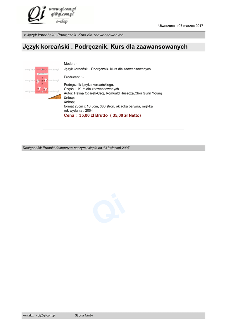 Utworzono : 07 marzec 2017 > Język koreański . Podręcznik. Kurs dla zaawansowanych Język koreański . Podręcznik. Kurs dla zaawansowanych Model : Język koreański . Podręcznik. Kurs dla zaawansowanych Producent : Podręcznik języka koreańskiego. Część II. Kurs dla zaawansowanych Autor: Halina Ogarek-Czoj, Romuald Huszcza,Choi Gunn Young format 23cm x 16,5cm, 380 stron, okładka barwna, miękka rok wydania : 2004 Cena : 35,00 zł Brutto ( 35,00 zł Netto) Dostępność: Produkt dostępny w naszym sklepie od 13 kwiecień 2007 i Q kontakt : - [email protected] Strona 1/{nb}