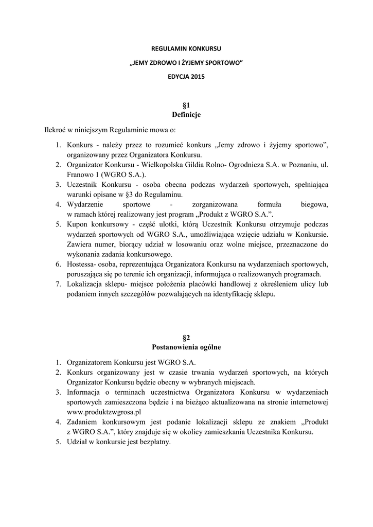REGULAMIN KONKURSU „JEMY ZDROWO I ŻYJEMY SPORTOWO” EDYCJA 2015 §1 Definicje Ilekroć w niniejszym Regulaminie mowa o: 1. Konkurs - należy przez to rozumieć konkurs „Jemy zdrowo i żyjemy sportowo”, organizowany przez Organizatora Konkursu. 2. Organizator Konkursu - Wielkopolska Gildia Rolno- Ogrodnicza S.A. w Poznaniu, ul. Franowo 1 (WGRO S.A.). 3. Uczestnik Konkursu - osoba obecna podczas wydarzeń sportowych, spełniająca warunki opisane w §3 do Regulaminu. 4. Wydarzenie sportowe zorganizowana formuła biegowa, w ramach której realizowany jest program „Produkt z WGRO S.A.”. 5. Kupon konkursowy - część ulotki, którą Uczestnik Konkursu otrzymuje podczas wydarzeń sportowych od WGRO S.A., umożliwiająca wzięcie udziału w Konkursie. Zawiera numer, biorący udział w losowaniu oraz wolne miejsce, przeznaczone do wykonania zadania konkursowego. 6. Hostessa- osoba, reprezentująca Organizatora Konkursu na wydarzeniach sportowych, poruszająca się po terenie ich organizacji, informująca o realizowanych programach. 7. Lokalizacja sklepu- miejsce położenia placówki handlowej z określeniem ulicy lub podaniem innych szczegółów pozwalających na identyfikację sklepu. §2 Postanowienia ogólne 1. Organizatorem Konkursu jest WGRO S.A. 2. Konkurs organizowany jest w czasie trwania wydarzeń sportowych, na których Organizator Konkursu będzie obecny w wybranych miejscach. 3. Informacja o terminach uczestnictwa Organizatora Konkursu w wydarzeniach sportowych zamieszczona będzie i na bieżąco aktualizowana na stronie internetowej www.produktzwgrosa.pl 4. Zadaniem konkursowym jest podanie lokalizacji sklepu ze znakiem „Produkt z WGRO S.A.”, który znajduje się w okolicy zamieszkania Uczestnika Konkursu. 5. Udział w konkursie jest bezpłatny. §3 Warunki uczestnictwa 1. Uczestnik Konkursu otrzymuje kupon konkursowy podczas wydarzeń sportowych od hostess reprezentujących Organizatora Konkursu. 2. Uczestnik Konkursu po otrzymaniu kuponu konkursowego zobowiązany jest podać lokalizację sklepu ze znakiem „Produkt z WGRO S.A.”, znajdującego się w okolicy miejsca zamieszkania Uczestnika Konkursu, a także odwiedzić stoisko Organizatora Konkursu i wrzucić uzupełniony kupon konkursowy do urny. W ten sposób Uczestnik Konkursu zgłasza swoje uczestnictwo w Konkursie. 3. Uczestnictwo w Konkursie nie jest ograniczone wiekowo. 4. Zgłoszenie udziału w Konkursie jest anonimowe. Podczas zgłoszenia nie są określane dane personalne Uczestnika Konkursu. 5. Uczestnik Konkursu zobowiązany jest zachować ulotkę po oderwaniu kuponu konkursowego, w celu dalszej identyfikacji Uczestnika Konkursu na podstawie numeru konkursowego, który znajduje się zarówno na kuponie konkursowym jak i na ulotce. 6. Każdy kupon konkursowy może być wylosowaniu tylko jeden raz. Po wylosowaniu Kupon konkursowy nie wraca do urny i nie bierze udziału w dalszym losowaniu. §4 Przebieg konkursu Etap I Uczestnik Konkursu otrzymuje ulotkę z kuponem konkursowym. Etap II Uczestnik Konkursu wpisuje lokalizację sklepu ze znakiem „Produkt z WGRO S.A.”, znajdującego się w okolicy miejsca zamieszkania Uczestnika Konkursu. Etap III Uczestnik Konkursu odrywa kupon konkursowy od ulotki i wrzuca go do urny znajdującej się na stanowisku Organizatora Konkursu. Etap IV Kupony konkursowe zbierane są w urnie na stanowisku Organizatora Konkursu, przez cały czas trwania wydarzenia sportowego. Etap V 1. Losowanie trzech nagrodzonych miejsc odbędzie się podczas trwania wydarzenia sportowego. Losowanie przeprowadza komisja powołana przez przedstawicieli Organizatora Konkursu. 2. W wypadku jeśli pomimo 3-krotnego komunikatu nie zgłosi się po odbiór nagrody Uczestnik Konkursu, którego numer został wylosowany- nastąpi dalsze losowanie, celem wyłonienia kolejnego nagrodzonego Uczestnika Konkursu. Etap VI 1. Po wylosowaniu trzech kuponów konkursowych, następuje wręczenie nagród posiadaczom kuponów konkursowych. 2. Każdy posiadacz wylosowanego kuponu konkursowego zobowiązany jest przekazać jego numer przedstawicielowi Organizatora Konkursu. §5 Nagrody 1. Nagrodami w Konkursie dla trzech nagrodzonych miejsc są trzy kosze upominków, sponsorowane przez Organizatora Konkursu. 2. Wyniki losowania są ostateczne i nieodwołalne. 3. Przyznane nagrody nie podlegają zamianie na inne nagrody rzeczowe ani ich równowartość pieniężną. §6 Postanowienia ogólne 1. Biorąc udział w konkursie, Uczestnik Konkursu akceptuje Regulamin Konkursu, dostępny na stronie www.produktzwgrosa.pl 2. WGRO S.A. zastrzega sobie prawo do: a) dokonania zmiany postanowień niniejszego Regulaminu; b) nierozstrzygnięcia Konkursu bez podania przyczyny. 3. Z każdego losowania kuponów konkursowych zostanie sporządzony protokół.