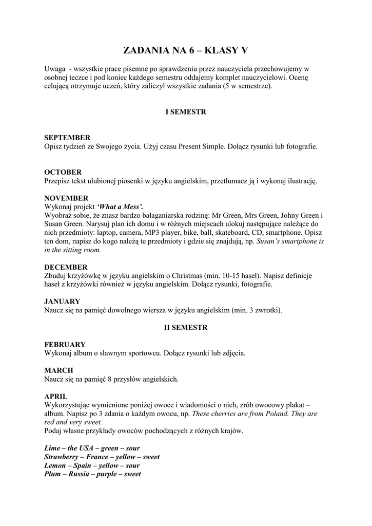 ZADANIA NA 6 – KLASY V Uwaga - wszystkie prace pisemne po sprawdzeniu przez nauczyciela przechowujemy w osobnej teczce i pod koniec każdego semestru oddajemy komplet nauczycielowi. Ocenę celującą otrzymuje uczeń, który zaliczył wszystkie zadania (5 w semestrze). I SEMESTR SEPTEMBER Opisz tydzień ze Swojego życia. Użyj czasu Present Simple. Dołącz rysunki lub fotografie. OCTOBER Przepisz tekst ulubionej piosenki w języku angielskim, przetłumacz ją i wykonaj ilustrację. NOVEMBER Wykonaj projekt ‘What a Mess’. Wyobraź sobie, że znasz bardzo bałaganiarska rodzinę: Mr Green, Mrs Green, Johny Green i Susan Green. Narysuj plan ich domu i w różnych miejscach ulokuj następujące należące do nich przedmioty: laptop, camera, MP3 player, bike, ball, skateboard, CD, smartphone. Opisz ten dom, napisz do kogo należą te przedmioty i gdzie się znajdują, np. Susan’s smartphone is in the sitting room. DECEMBER Zbuduj krzyżówkę w języku angielskim o Christmas (min. 10-15 haseł). Napisz definicje haseł z krzyżówki również w języku angielskim. Dołącz rysunki, fotografie. JANUARY Naucz się na pamięć dowolnego wiersza w języku angielskim (min. 3 zwrotki). II SEMESTR FEBRUARY Wykonaj album o sławnym sportowcu. Dołącz rysunki lub zdjęcia. MARCH Naucz się na pamięć 8 przysłów angielskich. APRIL Wykorzystując wymienione poniżej owoce i wiadomości o nich, zrób owocowy plakat – album. Napisz po 3 zdania o każdym owocu, np. These cherries are from Poland. They are red and very sweet. Podaj własne przykłady owoców pochodzących z różnych krajów. Lime – the USA – green – sour Strawberry – France – yellow – sweet Lemon – Spain – yellow – sour Plum – Russia – purple – sweet Pineapple – South America – green – sweet MAY Naucz się na pamięć 6 łamańców językowych. JUNE Wytnij zdjęcie z gazety (na którym coś się dzieje). Naklej je na kartkę A4. Opisz fotografię używając czasu Present Continuous i konstrukcji there is, there are.