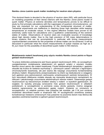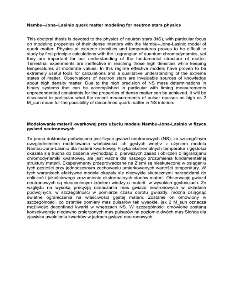 Nambu–Jona–Lasinio quark matter modeling for neutron stars physics This doctoral thesis is devoted to the physics of neutron stars (NS), with particular focus on modeling properties of their dense interiors with the Nambu--Jona-Lasinio model of quark matter. Physics at extreme densities and temperatures proves to be diffcult to study by first principle calculations with the Lagrangian of quantum chromodynamics, yet they are important for our understanding of the fundamental structure of matter. Terrestrial experiments are ineffective in reaching those high densities while keeping temperatures at moderate values. In this regime effective models have proven to be extremely useful tools for calculations and a qualitative understanding of the extreme states of matter. Observations of neutron stars are invaluable sources of knowledge about high density matter. Due to the high precision of NS mass determinations in binary systems that can be accomplished in particular with timing measurements unprecendented constraints for the properties of dense matter can be achieved. It will be discussed in particular what the recent measurements of pulsar masses as high as 2 M_sun mean for the possibility of deconfined quark matter in NS interiors. Modelowanie materii kwarkowej przy użyciu modelu Nambu-Jona-Lasinio w fizyce gwiazd neutronowych Ta praca doktorska poświęcona jest fizyce gwiazd neutronowych (NS), ze szczególnym uwzględnieniem modelowania właściwości ich gęstych wnętrz z użyciem modelu Nambu-Jona-Lasinio dla materii kwarkowej. Fizyka ekstremalnych temperatur i gęstości okazała się trudna do badania wychodząc z pierwszych zasad i obliczeń z lagranżjanu chromodynamiki kwantowej, ale jest ważna dla naszego zrozumienia fundamentalnej struktury materii. Eksperymenty przeprowadzane na Ziemi są nieskuteczne w osiąganiu tych gęstości przy jednoczesnym zachowaniu umiarkowanych wartości temperatury. W tych warunkach efektywne modele okazały się niezwykle skutecznymi narzędziami do obliczeń i jakościowego zrozumienie ekstremalnych stanów materii. Obserwacje gwiazd neutronowych są nieocenionym źródłem wiedzy o materii w wysokich gęstościach. Ze względu na wysoką precyzją oznaczania mas gwiazd neutronowych w układach podwójnych, w szczególności w pomiarze czasu obrotu gwiazdy, można osiągnąć świetne ograniczenia na właściwości gęstej materii. Zostanie on omówiony w szczególności, co ostatnie pomiary mas pulsarów tak wysokie, jak 2 M_sun oznacza możliwość deconfined kwarki w wnętrzach NS. W szczególności omówione zostaną konsekwencje niedawno zmierzonych mas pulsarów na poziomie dwóch mas Słońca dla zjawiska uwolnienia kwarków w jądrach gwiazd neutronowych.