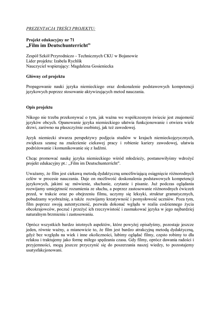 PREZENTACJA TREŚCI PROJEKTU: Projekt edukacyjny nr 71 „Film im Deutschunterricht” Zespół Szkół Przyrodniczo - Technicznych CKU w Bojanowie Lider projektu: Izabela Rychlik Nauczyciel wspierający: Magdalena Gosieniecka Główny cel projektu Propagowanie nauki języka niemieckiego oraz doskonalenie podstawowych kompetencji językowych poprzez stosowanie aktywizujących metod nauczania. Opis projektu Nikogo nie trzeba przekonywać o tym, jak ważna we współczesnym świecie jest znajomość języków obcych. Opanowanie języka niemieckiego ułatwia funkcjonowanie i otwiera wiele drzwi, zarówno na płaszczyźnie osobistej, jak też zawodowej. Język niemiecki stwarza perspektywy podjęcia studiów w krajach niemieckojęzycznych, zwiększa szansę na znalezienie ciekawej pracy i robienie kariery zawodowej, ułatwia podróżowanie i komunikowanie się z ludźmi. Chcąc promować naukę języka niemieckiego wśród młodzieży, postanowiłyśmy wdrożyć projekt edukacyjny pt.: ,,Film im Deutschunterricht". Uważamy, że film jest ciekawą metodą dydaktyczną umożliwiającą osiągnięcie różnorodnych celów w procesie nauczania. Daje on możliwość doskonalenia podstawowych kompetencji językowych, jakimi są: mówienie, słuchanie, czytanie i pisanie. Już podczas oglądania rozwijamy umiejętność rozumienia ze słuchu, a poprzez zastosowanie różnorodnych ćwiczeń przed, w trakcie oraz po obejrzeniu filmu, uczymy się leksyki, struktur gramatycznych, pobudzamy wyobraźnię, a także rozwijamy kreatywność i pomysłowość uczniów. Poza tym, film poprzez swoją autentyczność, pozwala dokonać wglądu w realia codziennego życia obcokrajowców, poczuć i przeżyć ich rzeczywistość i zasmakować języka w jego najbardziej naturalnym brzmieniu i zastosowaniu. Oprócz wszystkich bardzo istotnych aspektów, które powyżej opisałyśmy, pozostaje jeszcze jeden, równie ważny, a mianowicie to, że film jest bardzo atrakcyjną metodą dydaktyczną, gdyż bez względu na wiek i inne okoliczności, lubimy oglądać filmy, często robimy to dla relaksu i traktujemy jako formę miłego spędzania czasu. Gdy filmy, oprócz dawania radości i przyjemności, mogą jeszcze przyczynić się do poszerzania naszej wiedzy, to pozostajemy usatysfakcjonowani. Etapy pracy: I. Rok szkolny 2015/2016 1. Zajęcia pozalekcyjne ,,Deutsch mit Film" (dwa razy w tygodniu). 2. Trzyetapowy konkurs z języka niemieckiego: a) I etap: ,,Najpiękniejszy plakat filmowy" b) II etap: ,,Test wiedzy gramatycznej i leksykalnej" c) III etap: ,,Najciekawsza recenzja filmowa". 3. Doskonalenie zawodowe nauczyciela. Seminarium dla nauczycieli języka niemieckiego ,,Film im Deutschunterricht" w Goethe - Institut w Krakowie. 4. Udział młodzieży z klasy maturalnej w Ogólnopolskim Konkursie ,,Mein Beruf ist spitze!" zorganizowanym przez Goethe - Institut w Krakowie. 5. Wystawa plakatów filmowych zorganizowana w bibliotece szkolnej. 6. Nawiązanie współpracy z Goethe - Institut w Krakowie. 7. Nawiązanie współpracy z I Liceum Ogólnokształcącym im. J. Słowackiego w Częstochowie (wizyta w szkole i wspólne działania). 8. Prezentacja recenzji filmowych przed różnymi klasami oraz w bibliotece szkolnej. 9. Podsumowanie I etapu projektu oraz nagrodzenie wyróżniających się uczniów na Uroczystości Zakończenia Roku Szkolnego 2015/2016 na forum szkoły. II. Rok szkolny 2016/2017 1. Zajęcia pozalekcyjne ,,Deutsch mit Film" (dwa razy w tygodniu). 2. Trzyetapowy konkurs z języka niemieckiego: a) I etap: ,,Mój scenariusz filmowy" b) II etap: ,,Odgrywanie ról - moja ulubiona scena filmowa" c) III etap: ,,Film według mojego scenariusza" 3. Prezentacja scenariuszy filmowych, napisanych przez uczniów w języku niemieckim, w bibliotece szkolnej. 4. Odgrywanie przygotowanych scenek z filmów przed uczniami ZSPT CKU w Bojanowie. 5. Prezentacja przygotowanych materiałów filmowych na stronie internetowej szkoły oraz w lokalnych mediach. 6. Kontynuacja działań w ramach współpracy z I Liceum Ogólnokształcącym w Częstochowie. 7. Prezentacja filmów nakręconych przez uczniów podczas Dnia Otwartych Drzwi w ZSPT CKU w Bojanowie. 8. Prezentacja filmów nakręconych przez uczniów w Gimnazjum w Bojanowie. 9. Podsumowanie projektu edukacyjnego ,,Film im Deutschunterricht" oraz nagrodzenie zaangażowanych uczniów na Uroczystości Zakończenia Roku Szkolnego 2016/2017. Cele projektu: I. Cele główne: 1. Promowanie nauki języka niemieckiego. 2. Rozwijanie kompetencji językowych. 3. Wdrażanie aktywizujących metod nauczania. 4. Napisanie recenzji i scenariusza filmowego w języku niemieckim. 5. Nakręcenie filmu w języku niemieckim. II. Cele szczegółowe: 1. Motywowanie uczniów do działań edukacyjnych. 2. Kształcenie umiejętności organizacyjnych uczniów. 3. Kształcenie umiejętności odgrywania ról w języku niemieckim. 4. Rozwijanie umiejętności interpersonalnych i komunikacyjnych. 5. Rozwijanie umiejętności nawiązywania współpracy i pracy zespołowej.