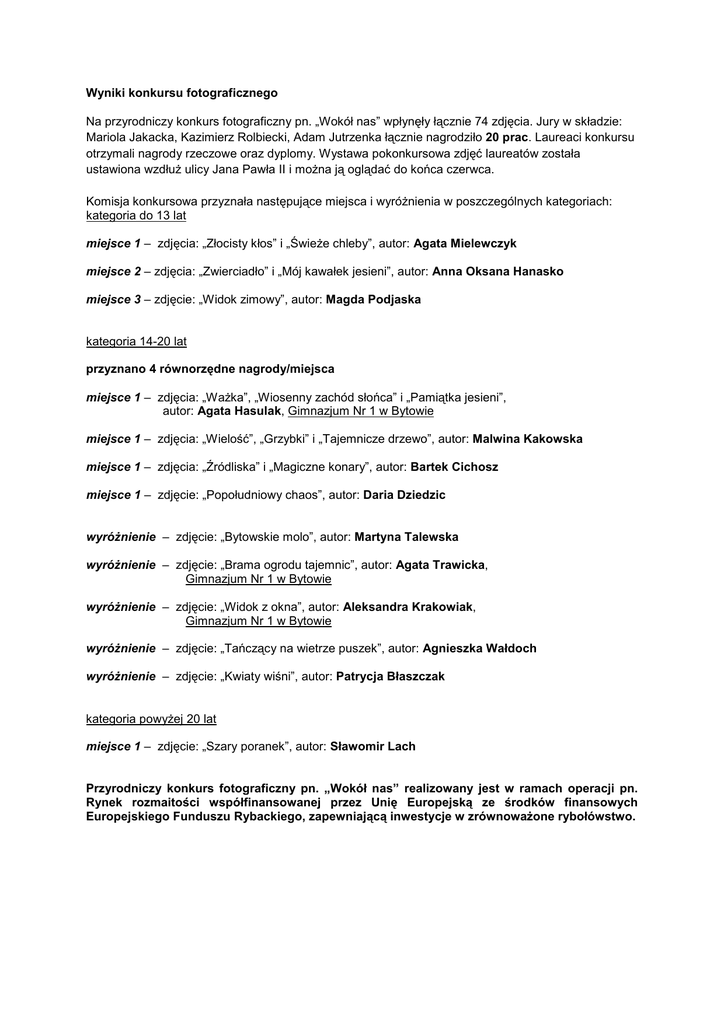 Wyniki konkursu fotograficznego Na przyrodniczy konkurs fotograficzny pn. „Wokół nas” wpłynęły łącznie 74 zdjęcia. Jury w składzie: Mariola Jakacka, Kazimierz Rolbiecki, Adam Jutrzenka łącznie nagrodziło 20 prac. Laureaci konkursu otrzymali nagrody rzeczowe oraz dyplomy. Wystawa pokonkursowa zdjęć laureatów została ustawiona wzdłuŜ ulicy Jana Pawła II i moŜna ją oglądać do końca czerwca. Komisja konkursowa przyznała następujące miejsca i wyróŜnienia w poszczególnych kategoriach: kategoria do 13 lat miejsce 1 – zdjęcia: „Złocisty kłos” i „ŚwieŜe chleby”, autor: Agata Mielewczyk miejsce 2 – zdjęcia: „Zwierciadło” i „Mój kawałek jesieni”, autor: Anna Oksana Hanasko miejsce 3 – zdjęcie: „Widok zimowy”, autor: Magda Podjaska kategoria 14-20 lat przyznano 4 równorzędne nagrody/miejsca miejsce 1 – zdjęcia: „WaŜka”, „Wiosenny zachód słońca” i „Pamiątka jesieni”, autor: Agata Hasulak, Gimnazjum Nr 1 w Bytowie miejsce 1 – zdjęcia: „Wielość”, „Grzybki” i „Tajemnicze drzewo”, autor: Malwina Kakowska miejsce 1 – zdjęcia: „Źródliska” i „Magiczne konary”, autor: Bartek Cichosz miejsce 1 – zdjęcie: „Popołudniowy chaos”, autor: Daria Dziedzic wyróŜnienie – zdjęcie: „Bytowskie molo”, autor: Martyna Talewska wyróŜnienie – zdjęcie: „Brama ogrodu tajemnic”, autor: Agata Trawicka, Gimnazjum Nr 1 w Bytowie wyróŜnienie – zdjęcie: „Widok z okna”, autor: Aleksandra Krakowiak, Gimnazjum Nr 1 w Bytowie wyróŜnienie – zdjęcie: „Tańczący na wietrze puszek”, autor: Agnieszka Wałdoch wyróŜnienie – zdjęcie: „Kwiaty wiśni”, autor: Patrycja Błaszczak kategoria powyŜej 20 lat miejsce 1 – zdjęcie: „Szary poranek”, autor: Sławomir Lach Przyrodniczy konkurs fotograficzny pn. „Wokół nas” realizowany jest w ramach operacji pn. Rynek rozmaitości współfinansowanej przez Unię Europejską ze środków finansowych Europejskiego Funduszu Rybackiego, zapewniającą inwestycje w zrównowaŜone rybołówstwo.