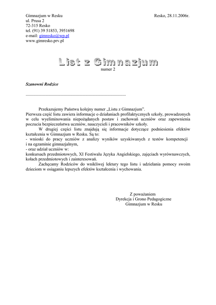 Gimnazjum w Resku ul. Prusa 2 72-315 Resko tel. (91) 39 51853, 3951698 e-mail: [email protected] www.gimresko.prv.pl Resko, 28.11.2006r. numer 2 Szanowni Rodzice ............................................................................................ Przekazujemy Państwu kolejny numer „Listu z Gimnazjum”. Pierwsza część listu zawiera informacje o działaniach profilaktycznych szkoły, prowadzonych w celu wyeliminowania niepożądanych postaw i zachowań uczniów oraz zapewnienia poczucia bezpieczeństwa uczniów, nauczycieli i pracowników szkoły. W drugiej części listu znajdują się informacje dotyczące podniesienia efektów kształcenia w Gimnazjum w Resku. Są to: - wnioski do pracy uczniów z analizy wyników uzyskiwanych z testów kompetencji i na egzaminie gimnazjalnym, - oraz udział uczniów w: konkursach przedmiotowych, XI Festiwalu Języka Angielskiego, zajęciach wyrównawczych, kołach przedmiotowych i zainteresowań. Zachęcamy Rodziców do wnikliwej lektury tego listu i udzielania pomocy swoim dzieciom w osiąganiu lepszych efektów kształcenia i wychowania. Z poważaniem Dyrekcja i Grono Pedagogiczne Gimnazjum w Resku Informacja dotycząca wyników testu kompetencji, który uczniowie rozwiązywali w klasie pierwszej w maju 2006r. Zaświadczenia z wynikami testu uczniowie otrzymali razem ze świadectwami 23 czerwca 2006r. Wcześniej, 20 czerwca br., na debacie klasowej z wychowawcami dokonali analizy swoich mocnych i słabych stron z testu. Dowiedzieli się, które umiejętności muszą powtórzyć, aby nadrobić zaległości w nauce z klasy pierwszej i poprawnie napisać następny test kompetencji w klasie drugiej. Każdy uczeń ułożył dla siebie indywidualny program nadrobienia zaległości w nauce, zapisał go na kopiach zaświadczeń i w zeszytach. W klasie drugiej uczniowie powinni indywidualnie pracować nad poprawą zaległości w nauce, korzystać z pomocy nauczycieli i uczestniczyć w zajęciach wyrównawczych. Rodzice zostali zapoznani z w/w programami swoich dzieci na wywiadówce klasowej we wrześniu 2006r. W listopadzie każdy uczeń na g-w złożył pisemne sprawozdanie z realizacji swoich zobowiązań dotyczących nadrobienia zaległości w nauce podjętych w czerwcu br. Na wywiadówce rodzice będą mieli możliwość sprawdzenia, czy uczniowie wykonali swoje zobowiązania, czy nadrobili zaległości w nauce i czy skorzystali z pomocy szkoły uczestnicząc w zajęciach wyrównawczych. Nauczyciele na sprawdzianach i pracach klasowych będą kontrolować wiedzę i umiejętności uczniów. Kolejne badanie poziomu wiedzy i umiejętności uczniów klas drugich odbędzie się 9-10 stycznia 2007r. Wyniki poznamy po feriach zimowych. Testy zakupiono w Instytucie Badań Kompetencji w Wałbrzychu i zapłacono z budżetu naszej szkoły. Badania diagnozujące mają na celu poznanie poziomu wiedzy i umiejętności uczniów i mobilizowanie ich do osiągnięcia lepszych wyników w nauce. Informujemy, iż uczniowie otrzymują na własność karty testów kompetencji. Zachęcamy rodziców do zainteresowania się testami i wspólnie z uczniami omawiania ich w domu. Informacja o przygotowaniach uczniów klas III do egzaminu gimnazjalnego Minęły trzy miesiące nauki. Uczniowie, pod kierunkiem nauczycieli, przygotowują się do egzaminu gimnazjalnego. Mają możliwość uczestniczenia w zajęciach wyrównawczych i kołach zainteresowań. Szczególną uwagę zwracamy na konieczność stałego motywowania dzieci do efektywniejszej nauki, odrabiania prac domowych, systematycznego przygotowywania się do zajęć, przynoszenia do szkoły podręczników, ćwiczeń , atlasów , zeszytów przedmiotowych i przyborów szkolnych. Próba egzaminu odbędzie się już na początku stycznia. Wyniki dokładnej analizy prób i egzaminu z roku ubiegłego wskazują , które umiejętności i wiadomości trzeba doskonalić i uzupełnić. Są to: 1. Uświadamianie uczniom, że lepsze wyniki z egzaminu gimnazjalnego umożliwią im wybranie dobrej szkoły ponadgimnazjalnej. 2. Rozbudzanie aspiracji uczniów i wiary w swoje możliwości. 3. Mobilizowanie uczniów do sumiennej i systematycznej pracy. 4. Doskonalenie czytania ze zrozumieniem różnych tekstów kultury. 5. Praca nad poprawnością ortograficzną i stylistyczną . 6. Redagowanie przez uczniów różnych form wypowiedzi. 7. Doskonalenie umiejętności zdobywania informacji z różnych źródeł, np.: tabel, encyklopedii, Internetu, schematów, obrazów itp. 8. Pobudzanie do obserwacji i wyciągania wniosków z zaobserwowanych zjawisk. 9. Zwracanie uwagi na użyteczność poznanych praw i zasad w życiu codziennym. 10. Doskonalenie techniki twórczego rozwiązywania problemów. 11. Rozwiązywanie zadań nietypowych, kształcących samodzielne, logiczne myślenie. 12. Doskonalenie umiejętności odczytywania, analizowania i przetwarzania informacji podanych w różnych formach – z rysunków, szkiców, wykresów, schematów, tabel, map geograficznych i historycznych. 13. Zwracanie uwagi, aby uczniowie bardzo dokładnie czytali instrukcje i polecenia do zadań i w odpowiedniej kolejności je wykonywali. 14. Kształcenie umiejętności posługiwania się technologią informatyczną oraz planowania przez uczniów własnego rozwoju. Tylko wspólne połączenie wysiłków: uczniów, nauczycieli i rodziców da szansę otrzymywania pozytywnych ocen, powodzenia w odniesieniu sukcesu szkolnego i uzyskania dobrego wyniku z egzaminu gimnazjalnego. TEST KOMPETENCJI HUMANISTYCZNYCH I MATEMATYCZNO-PRZYRODNICZYCH 18 września 2006r. uczniowie klas I gimnazjum pisali test kompetencji humanistycznych i matematyczno-przyrodniczych. Za testy, zakupione w Instytucie Badań Kompetencji w Wałbrzychu, zapłacono z budżetu naszej szkoły . Rozwiązanie zadań polegało na wyborze poprawnej odpowiedzi i zaznaczeniu jej na karcie. Czas rozwiązania każdego z testów – 45 minut. Średni wynik testu kompetencji humanistycznych - 15,15pkt. (po