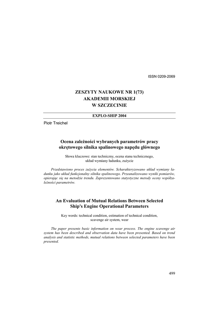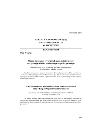 ISSN 0209-2069 ZESZYTY NAUKOWE NR 1(73) AKADEMII MORSKIEJ W SZCZECINIE EXPLO-SHIP 2004 Piotr Treichel Ocena zależności wybranych parametrów pracy okrętowego silnika spalinowego napędu głównego Słowa kluczowe: stan techniczny, ocena stanu technicznego, układ wymiany ładunku, zużycie Przedstawiono proces zużycia elementów. Scharakteryzowano układ wymiany ładunku jako układ funkcjonalny silnika spalinowego. Przeanalizowano wyniki pomiarów, opierając się na metodzie trendu. Zaprezentowano statystyczne metody oceny współzależności parametrów. An Evaluation of Mutual Relations Between Selected Ship's Engine Operational Parameters Key words: technical condition, estimation of technical condition, scavenge air system, wear The paper presents basic information on wear process. The engine scavenge air system has been described and observation data have been presented. Based on trend analysis and statistic methods, mutual relations between selected parameters have been presented. 499 Piotr Treichel Wstęp Ocena stanu technicznego urządzeń siłowni okrętowej na statkach wyposażonych w kompleksowe systemy nadzoru i sterowania najczęściej jest prowadzona na podstawie relatywnie łatwych do zaimplementowania i mało skomplikowanych metod wartości granicznych oraz trendu. Metoda wartości granicznych polega na porównywaniu wielkości parametru diagnostycznego z określoną (stałą lub zmienną) wartością odniesienia, po przekroczeniu której możemy wnioskować o pogorszeniu się stanu technicznego obiektu. Metoda trendu jest natomiast metodą analizy zmian parametru diagnostycznego w zależności od czasu. W metodzie tej zakłada się, że dla określonego stanu technicznego obiektu wartość parametru diagnostycznego jest zależna tylko od losowo zmieniających się warunków eksploatacji, a więc parametr ten jest zmienną losową, dla której można wyznaczyć wartość średnią wraz z przedziałem ufności. Zmiana stanu technicznego obiektu ma wpływ zarówno na wielkość wartości średniej, jak również na amplitudę oscylacji wartości chwilowych parametru w stosunku do wartości średniej. Metoda ta nadaje się szczególnie dla procesów wolnozmiennych i powinna być stosowana do parametrów silnie zależnych od parametrów struktury, a nieznacznie od parametrów wejściowych. Wadą obydwu metod jest uproszczenie polegające na założeniu, że do opisania jednego parametru struktury obiektu lub jego układu funkcjonalnego wystarczy jeden parametr diagnostyczny. Ponadto stosowane w większości przypadków modele trendu są modelami liniowymi względem swych parametrów, dlatego też jakikolwiek nieliniowy charakter zmian z silnie zaznaczonym krótkookresowym zakłóceniem może prowadzić do błędnych wniosków w ocenie parametrów. Pod pojęciem metod trendu spotyka się czasami próby zastosowania przez producentów systemów nadzoru i sterowania prezentacji surowych wyników pomiarowych w postaci szeregów czasowych. 1. Obiekt analizy Jako obiekt analizy posłużył układ funkcjonalny wymiany ładunku silnika wolnoobrotowego typu MAN-B&W 5S60MC. Układ ten był wyposażony w pojedynczą turbosprężarkę z zasilaniem stałociśnieniowym, posiadający filtr powietrza, chłodnicę powietrza doładowania oraz dmuchawy pomocnicze wraz z zespołem zaworów płytkowych (rys. 1). Do parametrów wejściowych tego układu zaliczamy m.in.: temperaturę powietrza na ssaniu sprężarki, temperaturę wody chłodzącej na dopływie do chłodnicy powietrza doładowania, natężenie przepływu wody chłodzącej. Do parametrów wyjściowych należą natomiast: 500 Ocena zależności wybranych parametrów pracy okrętowego silnika spalinowego ... ciśnienie powietrza doładowania w zasobniku, jego temperatura oraz temperatury w poszczególnych przestrzeniach podtłokowych. Rys. 1. Schemat ideowy przepływu czynnika w instalacji zasilania powietrzem silnika MAN-B&W 5S60MC: ts – temperatura w siłowni, twm – temperatura wody morskiej, tzpd – temperatura w zasobniku powietrza doładowania Fig. 1. Schematic diagram of scavenge air flow through the scavenge air instillation for MAN-B&W 5S60MC diesel engine Analizą objęto powyższy układ, ponieważ posiada on znaczący wpływ na parametry eksploatacyjne silnika. Zgodnie z zagadnieniami przedstawionymi w pracy [11] można przyjąć w pierwszym przybliżeniu, że obniżenie temperatury powietrza doładowania o 10ºC powoduje wzrost jego gęstości o 3–5%, co przy założeniu stałej wartości współczynnika nadmiaru powietrza przekłada się na taki sam wzrost mocy silnika. Za dopuszczalną wielkość temperatury powietrza doładowania dla potrzeb systemu nadzoru przyjęto 55ºC, natomiast jako wartość graniczną 65ºC [1]. Dopuszczalna minimalna wielkość temperatury w zasobniku powietrza została ustalona jako nie niższa niż 15ºC powyżej temperatury wody morskiej [2]. Za dopuszczalną temperaturę przestrzeni podtłokowych przyjęto 70ºC [1]. Obserwacje prowadzono w trakcie jednej podróży morskiej, której czas trwania umożliwiał zgromadzenie znacznej ilości wyników. W trakcie całej serii pomiarowej siłownia pozostawała w normalnym cyklu pracy, przy stałym obciążeniu silnika (ważniejsze parametry eksploatacyjne przedstawiono w tabeli 1). Nie stwierdzono żadnych uszkodzeń lub zaistnienia nieprawidłowych stanów pracy urządzeń. Zapis parametrów pracy siłowni był dokonywany automatycznie cztery razy na dobę. 501 Piotr Treichel Tabela 1 Wielkość ważniejszych parametrów eksploatacyjnych silnika napędowego w analizowanym okresie Important operational parameters of the diesel engine in the examined period Jednostki miary Średnia wielkości parametru Odchylenie standardowe obr/min 90,72 0,9% Moc silnika mierzona torsjometrem kW 7304,42 1,6% Ciśnienie powietrza doładowania w zasobniku kPa 2074,81 1,82% Spadek ciśnienia powietrza na chłodnicy powietrza doładowania mm H2O 219,69 2,9%