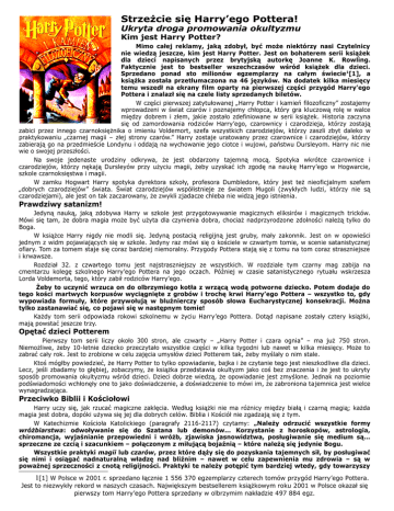 Strzeżcie się Harry’ego Pottera! Ukryta droga promowania okultyzmu Kim jest Harry Potter? Mimo całej reklamy, jaką zdobył, być może niektórzy nasi Czytelnicy nie wiedzą jeszcze, kim jest Harry Potter. Jest on bohaterem serii książek dla dzieci napisanych przez brytyjską autorkę Joanne K. Rowling. Faktycznie jest to bestseller wszechczasów wśród książek dla dzieci. Sprzedano ponad sto milionów egzemplarzy na całym świecie1[1], a książka została przetłumaczona na 46 języków. Na dodatek kilka miesięcy temu wszedł na ekrany film oparty na pierwszej części przygód Harry’ego Pottera i znalazł się na czele listy sprzedanych biletów. W części pierwszej zatytułowanej „Harry Potter i kamień filozoficzny” zostajemy wprowadzeni w świat czarów i poznajemy chłopca, który gra kluczową rolę w walce między dobrem i złem, jakie zostało zdefiniowane w serii książek. Historia zaczyna się od zamordowania rodziców Harry’ego, czarownicy i czarodzieja, którzy zostają zabici przez innego czarnoksiężnika o imieniu Voldemort, szefa wszystkich czarodziejów, którzy zaszli zbyt daleko w praktykowaniu „czarnej magii – złej strony czarów.” Harry zostaje uratowany przez czarownice i czarodziejów, którzy zabierają go na przedmieście Londynu i oddają na wychowanie jego ciotce i wujowi, państwu Dursleyom. Harry nic nie wie o swojej przeszłości. Na swoje jedenaste urodziny odkrywa, że jest obdarzony tajemną mocą. Spotyka wkrótce czarownice i czarodziejów, którzy nękają Dursleyów przy użyciu magii, żeby uzyskać ich zgodę na naukę Harry’ego w Hogwarcie, szkole czarnoksięstwa i magii. W zamku Hogwart Harry spotyka dyrektora szkoły, profesora Dumbledore, który jest też nieoficjalnym szefem „dobrych czarodziejów” świata. Świat czarodziejów współistnieje ze światem Mugoli (zwykłych ludzi, którzy nie są czarodziejami), ale jest on tak zaczarowany, że zwykli zjadacze chleba nie widzą jego istnienia. Prawdziwy satanizm! Jedyną nauką, jaką zdobywa Harry w szkole jest przygotowywanie magicznych eliksirów i magicznych tricków. Mówi się tam, że dobra magia może być użyta dla czynienia dobra, chociaż nadprzyrodzone zdolności należą tylko do Boga. W książce Harry nigdy nie modli się. Jedyną postacią religijną jest gruby, mały zakonnik. Jest on w opowieści jednym z widm pojawiających się w szkole. Jedyny raz mówi się o kościele w czwartym tomie, w scenie satanistycznej ofiary. Tom za tomem staje się coraz bardziej niemoralny. Przygody Pottera stają się z tomu na tom coraz straszniejsze i krwawsze. Rozdział 32. z czwartego tomu jest najstraszniejszy ze wszystkich. W rozdziale tym czarny mag zabija na cmentarzu kolegę szkolnego Harry’ego Pottera na jego oczach. Później w czasie satanistycznego rytuału wskrzesza Lorda Voldemorta, tego, który zabił rodziców Harry’ego. Żeby to uczynić wrzuca on do olbrzymiego kotła z wrzącą wodą potworne dziecko. Potem dodaje do tego kości martwych korpusów wyciągnięte z grobów i trochę krwi Harry’ego Pottera – wszystko to, gdy wypowiada formuły, które przywołują w bluźnierczy sposób słowa Eucharystycznej konsekracji. Można tylko zastanawiać się, co pojawi się w następnym tomie! Każdy tom serii odpowiada rokowi szkolnemu w życiu Harry’ego Pottera. Dotąd napisane zostały cztery książki, mają powstać jeszcze trzy. Opętać dzieci Potterem Pierwszy tom serii liczy około 300 stron, ale czwarty – „Harry Potter i czara ognia” – ma już 750 stron. Niemożliwe, żeby 10-letnie dziecko przeczytało wszystkie części w kilka tygodni lub nawet w kilka miesięcy. Może to zabrać cały rok. Jest to zrobione w celu zajęcia umysłów dzieci Potterem tak, żeby myślały o nim stale. Ktoś mógłby powiedzieć, że Harry Potter to tylko opowiadanie, bajka i że czytanie tego jest nieszkodliwe dla dzieci. Lecz, jeśli zbadamy to głębiej, zobaczymy, że książka przedstawia okultyzm jako coś bez znaczenia i że jest to ukryty sposób promowania okultyzmu wśród dzieci. Dzieci dobrze wiedzą, że opowiadanie jest zmyślone. Jednak na poziomie podświadomości wchłonęły one to jako doświadczenie, a doświadczenie to mówi im, że zabroniona tajemnica jest wielce wynagradzająca. Przeciwko Biblii i Kościołowi Harry uczy się, jak rzucać magiczne zaklęcia. Według książki nie ma różnicy między białą i czarną magią; każda magia jest dobra, dopóki używa się jej dla dobrych celów. Biblia i Kościół nie zgadzają się z tym. W Katechizmie Kościoła Katolickiego (paragrafy 2116-2117) czytamy: „Należy odrzucić wszystkie formy wróżbiarstwa: odwoływanie się do Szatana lub demonów... Korzystanie z horoskopów, astrologia, chiromancja, wyjaśnianie przepowiedni i wróżb, zjawiska jasnowidztwa, posługiwanie się medium są... sprzeczne ze czcią i szacunkiem – połączonym z miłującą bojaźnią – które należą się jedynie Bogu. Wszystkie praktyki magii lub czarów, przez które dąży się do pozyskania tajemnych sił, by posługiwać się nimi i osiągać nadnaturalną władzę nad bliźnim – nawet w celu zapewnienia mu zdrowia – są w poważnej sprzeczności z cnotą religijności. Praktyki te należy potępić tym bardziej wtedy, gdy towarzyszy 1[1] W Polsce w 2001 r. sprzedano łącznie 1 556 370 egzemplarzy czterech tomów przygód Harry’ego Pottera. Jest to niezwykły rekord w naszych czasach. Największym bestsellerem książkowym roku 2001 w Polsce okazał się pierwszy tom Harry’ego Pottera sprzedany w olbrzymim nakładzie 497 884 egz. im intencja zaszkodzenia drugiemu człowiekowi lub uciekanie się do interwencji demonów. Jest również naganne noszenie amuletów. Spirytyzm często pociąga za sobą praktyki wróżbiarskie lub magiczne. Dlatego Kościół upomina wiernych, by wystrzegali się ich.” Seria książek o Potterze wielokrotnie opisuje w pozytywnym świ
