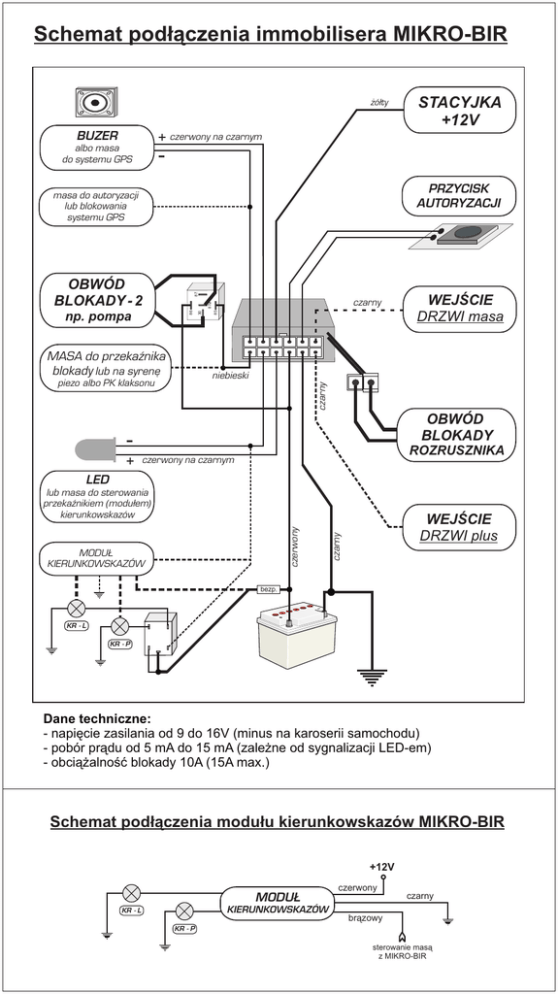 Schemat pod³¹czenia immobilisera MIKRO-BIR ¿ó³ty BUZER + czerwony na czarnym albo masa do systemu GPS PRZYCISK AUTORYZACJI masa do autoryzacji lub blokowania systemu GPS czarny 85 87a 86 MASA do przekaŸnika blokady lub na syrenê 30 np. pompa 87 OBWÓD BLOKADY - 2 WEJŒCIE DRZWI masa niebieski czarny piezo albo PK klaksonu OBWÓD BLOKADY + STACYJKA +12V ROZRUSZNIKA czerwony na czarnym LED MODU£ KIERUNKOWSKAZÓW WEJŒCIE DRZWI plus czarny czerwony lub masa do sterowania przekaŸnikiem (modu³em) kierunkowskazów bezp. KR - L KR - P Dane techniczne: - napiêcie zasilania od 9 do 16V (minus na karoserii samochodu) - pobór pr¹du od 5 mA do 15 mA (zale¿ne od sygnalizacji LED-em) - obci¹¿alnoœæ blokady 10A (15A max.) Schemat pod³¹czenia modu³u kierunkowskazów MIKRO-BIR +12V MODU£ czerwony czarny KIERUNKOWSKAZÓW KR - L br¹zowy KR - P sterowanie mas¹ z MIKRO-BIR