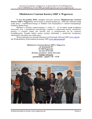 Starostwo Powiatowe w Wągrowcu, ul. Kościuszki 15, 62‐100 Wągrowiec tel. 67 2680500, fax 67 2627888, [email protected], www.wagrowiec.pl Młodzieżowe Centrum Kariery OHP w Wągrowcu W dniu 03 grudnia 2010r. nastąpiło uroczyste otwarcie Młodzieżowego Centrum Kariery OHP w Wągrowcu, utworzonego w ramach projektu pn. „OHP jako realizator usług rynku pracy”, współfinansowanego ze środków Unii Europejskiej w ramach Europejskiego Funduszu Społecznego. Młodzież z powiatu wągrowieckiego w wieku 15 – 25 lat będzie mogła bezpłatnie skorzystać m.in. z poradnictwa zawodowego, wsparcia w planowaniu kariery zawodowej, pomocy w wyborze szkoły lub zawodu oraz w przygotowaniu się do rozmowy kwalifikacyjnej. Ponadto będzie można uzyskać informacje o możliwości kształcenia, szkoleniach, zawodach oraz rynku pracy. Więcej informacji na stronach internetowych Komendy Głównej OHP (www.ohp.pl) lub Wielkopolskiej Wojewódzkiej Komendy OHP (www.ohp.poznan.pl). Młodzieżowe Centrum Kariery OHP w Wągrowcu ul. Kościuszki 49 62-100 Wągrowiec tel. (67) 25 53 250 Doradca zawodowy: Aneta Narowska Godziny otwarcia: poniedziałek – piątek 7.45 – 15.45 Artykuł pochodzi ze strony: www.wagrowiec.pl Strona 1 Starostwo Powiatowe w Wągrowcu, ul. Kościuszki 15, 62‐100 Wągrowiec tel. 67 2680500, fax 67 2627888, [email protected], www.wagrowiec.pl Artykuł pochodzi ze strony: www.wagrowiec.pl Strona 2 Starostwo Powiatowe w Wągrowcu, ul. Kościuszki 15, 62‐100 Wągrowiec tel. 67 2680500, fax 67 2627888, [email protected], www.wagrowiec.pl Artykuł pochodzi ze strony: www.wagrowiec.pl Strona 3