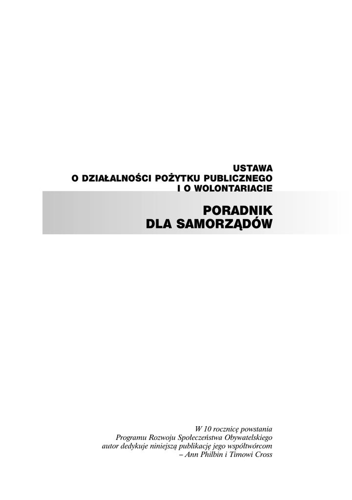 USTAWA O DZIA¸ALNOÂCI PO˚YTKU PUBLICZNEGO I O WOLONTARIACIE PORADNIK DLA SAMORZÑDÓW W 10 rocznic´ powstania Programu Rozwoju Spo∏eczeƒstwa Obywatelskiego autor dedykuje niniejszà publikacj´ jego wspó∏twórcom – Ann Philbin i Timowi Cross Niniejsza publikacja zosta∏a wydana w ramach programu TRZECI SEKTOR, finansowanego przez Trust for Civil Society in Central & Eastern Europe i Fundacj´ im. Stefana Batorego. Micha∏ Guç USTAWA O DZIA¸ALNOÂCI PO˚YTKU PUBLICZNEGO I O WOLONTARIACIE PORADNIK DLA SAMORZÑDÓW FUNDACJA ROZWOJU DEMOKRACJI LOKALNEJ WARSZAWA 2004 Micha∏ Guç USTAWA O DZIA¸ALNOÂCI PO˚YTKU PUBLICZNEGO I O WOLONTARIACIE PORADNIK DLA SAMORZÑDÓW FUNDACJA ROZWOJU DEMOKRACJI LOKALNEJ WARSZAWA 2004 ISBN 83-913486-7-9 Fundacja Rozwoju Demokracji Lokalnej Biuro Zarzàdu ul. Hauke-Bosaka 11 01-540 Warszawa tel.: (022) 869 92 00 do 07, fax: (022) 839 22 85 e-mail: [email protected] www.frdl.org.pl Spis treÊci Rozdzia∏ 1 Nowe otwarcie . . . . . . . . . . . . . . . . . . . . . . . . . . . . . . . . .7 Rozdzia∏ 2 Organizacje pozarzàdowe Rozdzia∏ 3 Wspó∏praca . . . . . . . . . . . . . . . . . . . . . . . . . . . . . . . . . . Rozdzia∏ 4 Formy wspó∏pracy Rozdzia∏ 5 Zlecanie zadaƒ Rozdzia∏ 6 Konkurencja Rozdzia∏ 7 Konkurs . . 25 . . . . . . . . . . . . . . . . . . . . . . . . . . . . . 33 . . . . . . . . . . . . . . . . . . . . . . . . . . . . . . . 43 . . . . . . . . . . . . . . . . . . . . . . . . . . . . . . . . . 55 . . . . . . . . . . . . . . . . . . . . . . . . . . . . . . . . . . . 65 Rozdzia∏ 8 Realizacja zadania Rozdzia∏ 9 Wy∏àczenia . . . . . . . . . . . . . . . . . . . . . . . . 11 . . . . . . . . . . . . . . . . . . . . . . . . . . . . . 75 . . . . . . . . . . . . . . . . . . . . . . . . . . . . . . . . . . . 83 USTAWA O DZIA¸ALNOÂCI PO˚YTKU PUBLICZNEGO I O WOLONTARIACIE 5 Rozdzia∏ 10 NieruchomoÊci . . . . . . . . . . . . . . . . . . . . . . . . . . . . . . . . . . . . . . . . . . . . . . . . . . . . . . . . . . . . . . . . 117 Rozdzia∏ 11 Program wspó∏pracy . . . . . . . . . . . . . . . . . . . . . . . . . . . . . . . . . . . . . . . . . . . . . . . . . . . . . . . 125 Rozdzia∏ 12 Podatki lokalne . . . . . . . . . . . . . . . . . . . . . . . . . . . . . . . . . . . . . . . . . . . . . . . . . . . . . . . . . . . . . . . 133 Rozdzia∏ 13 Wolontariat . . . . . . . . . . . . . . . . . . . . . . . . . . . . . . . . . . . . . . . . . . . . . . . . . . . . . . . . . . . . . . . . . . . . . 137 Rozdzia∏ 14 Zakoƒczenie . . . . . . . . . . . . . . . . . . . . . . . . . . . . . . . . . . . . . . . . . . . . . . . . . . . . . . . . . . . . . . . . . . . 143 Za∏àcznik 1 Program wspó∏pracy Gminy Miasta Gdyni z podmiotami prowadzàcymi dzia∏alnoÊç po˝ytku publicznego na rok 2004 (Uchwa∏a Rady Miasta). . . . . . . . . . . . . . . . . . . . . . . . . . . . . . . . . . . . . . . . . . . . . . . . . . 145 Za∏àcznik 2 Powo∏anie i regulamin Komisji Konsultacyjnej (Zarzàdzenie Prezydenta Miasta Gdyni) . . . . . . . . . . . . . . . . . . . . . . . 156 Za∏àcznik 3 Instrukcja w sprawie wolontariatu (Zarzàdzenie Prezydenta Miasta Gdyni) . . . . . . . . . . . . . . . . . . . . . . . 162 6 PORADNIK DLA SAMORZÑDÓW NOWE OTWARCIE rozdzia∏ 1 Nowe otwarcie Elementem przemian, które zasz∏y w Polsce w ciàgu ostatnich lat, jest zdecydowane przeniesienie ci´˝aru realizacji zadaƒ publicznych z w∏adz centralnych na jednostki samorzàdu terytorialnego. Nie by∏ to proces ∏atwy, stanowi∏ on wynik wieloletnich zabiegów Êrodowisk samorzàdowych o przekazywanie przez administracj´ rzàdowà kolejnych zadaƒ oraz Êrodków na ich realizacj´. Proces ten przyÊpieszy∏ gwa∏townie podczas reformy samorzàdowej w 1999 roku. Niestety, obecnie obserwujemy proces odbierania samorzàdom niektórych kompetencji i przekazywania ich z powrotem administracji centralnej. Nie ulega jednak wàtpliwoÊci, ˝e obowiàzujàcy dziÊ podzia∏ zadaƒ – choç jeszcze niepe∏ny i niedoskona∏y – zbli˝a nas do prawid∏owych rozwiàzaƒ, wprowadzajàcych w ˝ycie konstytucyjnà zasad´ pomocniczoÊci (subsydiarnoÊci) w odniesieniu do podzia∏u zadaƒ mi´dzy poszczególne szczeble w∏adzy publicznej. Równolegle do zmian w ustroju administracji publicznej, zachodzàcych od poczàtku lat dziewi´çdziesiàtych, dokonujà si´ równie˝ fundamentalne przeistoczenia w sektorze obywatelskim, zwanym inaczej pozarzàdowym lub trzecim sektorem. RoÊnie liczba organizacji pozarzàdowych – g∏ównie stowarzyszeƒ, fundacji, organizacji koÊcielnych, poszerza si´ równie˝ zakres ich dzia∏ania, skala realizowanych zadaƒ oraz liczba wolontariuszy i pracowników. USTAWA O DZIA¸ALNOÂCI PO˚YTKU PUBLICZNEGO I O WOLONTARIACIE 7 ROZDZIA¸ 1 Dzi´ki aktywnoÊci podejmowanej na forum lokalnym organizacje pozarzàdowe sta∏y si´ cennym partnerem dla jednostek samorzàdu terytorialnego. Znalaz∏o to odzwierciedlenie w regulacjach prawnych. 1 stycznia 1999 roku wesz∏a w ˝ycie reforma, wprowadzajàca trójszczeblowy system samorzàdów. W ustawie o samorzàdzie powiatowym i ustawie o samorzàdzie wojewódzkim znalaz∏y si´ zapisy dotyczàce wspó∏pracy z organizacjami pozarzàdowymi jako zadania w∏asnego powiatu i województwa. 30 maja 2001 roku analogiczne zapisy wprowadzono do ustawy o samorzàdzie gminnym – zakres zadaƒ w∏asnych gminy poszerzono o wspó∏prac´ z organizacjami pozarzàdowymi. Ustawa o dzia∏alnoÊci po˝ytku publicznego i o wolontariacie, uchwalona 24 kwietnia 2003 roku, otwiera nowy etap relacji – i miejmy nadziej´ – wspó∏dzia∏ania pomi´dzy samorzàdami i sektorem pozarzàdowym. Dzia∏alnoÊç po˝ytku publicznego zdefiniowano w ustawie jako dzia∏alnoÊç spo∏ecznie u˝ytecznà, prowadzonà przez organizacje pozarzàdowe w sferze zadaƒ publicznych okreÊlonych w ustawie. W sposób jednoznaczny wskazano w ten sposób, i˝ realizacja tych zadaƒ nie jest zastrze˝ona dla podm
