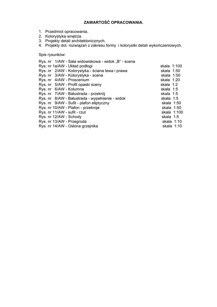 ZAWARTOŚĆ OPRACOWANIA. 1. 2. 3. 4. Przedmiot opracowania. Kolorystyka wnętrza. Projekty detali architektonicznych. Projekty dot. rozwiązań z zakresu formy i kolorystki detali wykończeniowych. Spis rysunków: Rys. nr 1/AW - Sala widowiskowa - widok „B” - scena Rys. nr 1a/AW - Układ podłogi Rys. nr 2/AW - Kolorystyka - ściana lewa i prawa Rys. nr 3/AW - Kolorystyka - scena Rys. nr 4/AW - Proscenium Rys. nr 5/AW - Profil opaski sceny Rys. nr 6/AW - Kolumna Rys. nr 7/AW - Balustrada - przekrój Rys. nr 8/AW - Balustrada - wypełnienie - widok Rys. nr 9/AW - Sufit - plafon eliptyczny Rys. nr 10/AW - Plafon - przekroje Rys. nr 11/AW - sufit - rzut Rys. nr 12/AW - Schody Rys. nr 13/AW - Przegroda Rys. nr 14/AW - Osłona grzejnika skala 1:100 skala 1:50 skala 1:50 skala 1:20 skala 1:2 skala 1:5 skala 1:5 skala 1:5 skala 1:50 skala 1:50 skala 1:100 skala 1:5 skala 1:10 skala 1:10 1. PRZEDMIOT OPRACOWANIA Przedmiotem niniejszego opracowania jest projekt wystroju wnętrza sali widowiskowej w Wiejskim Domu Kultury w Pisarzowicach 72. 2. KOLORYSTYKA WNĘTRZA Dla sali widowiskowej przyjęto pastelową kolorystykę w ciepłej tonacji. Podstawowa kolorystyka została wybrana w oparciu o paletę firmy "Flügger"; • sufit - płaszczyzna podstawowa - farba emulsyjna akrylowa nr 2361, • plafon eliptyczny - płaszczyzna podstawowa - farba emulsyjna akrylowa biała, narożniki i wnęka - farba emulsyjna akrylowa nr 2372, obrzeża - farba emulsyjna akrylowa nr 2372 • sufit pod balkonem - farba emulsyjna akrylowa kolor nr 2372 (wg palety "Flügger"), • proponowany kolor dla ścian - farba emulsyjna akrylowa nr 2381 (wg palety "Flügger") - powyżej lamperii (od h 140 cm), • opaski wokół okien i szpalety - farba emulsyjna akrylowa kolor nr 2384 (wg palety "Flügger"), • tynk kwarcowy - mozaikowy z firmy "Kreisel" nr KS 182 - do h 140 cm, • listwa oddzielająca tynk do farby - profil styropianowy M2 z firmy NMC - farba emulsyjna akrylowa kolor 2361(wg palety "Flügger"), • opaska profilowana sceny -styropian utwardzony powierzchniowo (siatka + klej), malować farbą emulsyjną akrylową - kolor nr 2361 (wg palety "Flügger") • kolumny - odlewy gipsowe utwardzone powierzchniowo - baza tynk mozaikowy nr 182, trzon tynk mozaikowy nr 130, głowica - farba emulsyjna akrylowa nr 2381, • drzwi wejściowe pcw - kolor zbliżony do aluminium - RAL 9006, • drzwi laminowane pcw na zaplecze sceny malować w kolorze ściany - 2381, • schody na balkon; obudowa konstrukcji 2x płyta GK - malować farbą emulsyjna akrylową RAL 8015, metalowe obrzeża stopnic - farba ftalowa nawierzchniowa RAL 9006, • balustrada - malować farbą proszkową - kolor srebrny RAL 9006, • wypełnienie stopnic - płytki gres 30x30 "Oregon" z firmy Paradyż", • wykładzina pcw na balkonie - kolekcja Rekord 42 - "Diament" 1228 5740 00 z firmy "Gamrat", • panele podłogowe - środek "Dąb naturalny", obrzeża "Czereśnia naturalna", • płyciny; wypełnienia i cokół balustrady na balkonie, osłony na grzejniki i przegrdy między boxami - płyta melaminowana "Orzech Caravaggio" D 9164 z firmy "Kronopol", • policzki poręczy na balkonie - pł. melaminowana "Metalik" D 881. 3. DETALE ARCHITEKTONICZNE. 4.1. Podłoga - rys. 1a/AW: • powierzchnię finalną ułożyć z paneli pcw gr 7-8 mm w klasie minimum AC 5 odpowiadającej wymogom stawianym obiektom publicznym o bardzo dużym natężeniu ruchu. • połączenie powierzchni środkowej i obrzeża za pomocą aluminiowej listwy dylatacyjnej. • zastosować podkład - izolację akustyczno - termiczną z płyt gr 6 mm (np. "Ekopor"). 4.2. Ściany - rys. 2/AW, 3/AW; • powierzchnię do h - 140 cm wykonać z kwarcowego tynku mozaikowego np. firmy "Kreisel" nr 182, • listwa boazeryjna - profil styropianowy twardy z kolekcji Noma Style "M2" z firmy NMC pomalować farbą akrylową nr 2361 (wg palety "Flügger"), • ściany od h - 140 cm do sufitu pomalować farbą akrylową nr 2381 (wg palety "Flügger"). 4.3. Sufit - rys. 9/AW, 10/AW 11/AW; • do podstawowego sufitu podwieszony będzie eliptyczny plafon z narożnikami i okrągłym otworem, 4.4. Proscenium - rys. 4/AW,5 /AW; • kształt proscenium pokazany został na rys. 4/AW, • okładzina pozioma wykonana z paneli pcw "Czereśnia Naturalna", • obrzeże frontowe wykonać z listwy - płaskownika Al s- 7 cm, • front pokryty tynkiem mozaikowym nr 182. • Opaska zewnętrzna otworu sceny wykonać ze styropianu utwardzonego powierzchniowo siatką i klejem, malować farbą akrylową w kolorze nr 2361 (wg palety "Flügger"). 4.5. Kolumny - rys. 5/AW; • wykonać dwie symetryczne połówki, można oddzielnie wykonać bazę, trzon oraz głowicę, • po sklejeniu utwardzić powierzchniowo siatką i zaprawą klejową a następnie pokryć; bazę - tynkiem mozaikowym nr 182, trzon - tynkiem mozaikowym nr 130 oraz pomalować głowicę farbą akrylową nr 2381. 4.6. Balustrada balkonowa - rys. 7/AW, 8/AW; • konstrukcja balustrady - wykorzystać istniejące słupki, pomalować je farbą ftalową w kolorze zbliżonym do srebrnego RAL 9006, • cokół i nakrywę poręczy wykonać z płyt melaminowanych "Orzech Caravaggio" D 9164, • policzki poręczy wykonać z pł. melaminowanej szarej D 881, • wypełnienie przęseł wykonać z płyty melaminowanej "Orzech Caravaggio" D 9164 zamkniętej po obrzeżach ceownikiem Al. 20x20x20 mm lub kątownikiem Al. 20x20 mm, • dekoracyjne pasy poziome wykonać z teownika lub płaskownika AL. s- 20 mm. • Płyciny wypełniające balustradę montować na uchwytach do słupków. 4.7. Schody - rys. 12/AW; • obudowę stalowej konstrukcji schodów malować farbą ftalową w kolorze brązowym RAL 8015, • obrzeża stopnic malować farbą ftalową w kolorze srebrnym zbliżonym do RAL 9006 • wypełnienie stopnic- płytki gres 30x30 "Oregn" z firmy "Paradyż", • balustrada stalowa - rozwiązanie systemowe, malować farbą proszkową w kolorze zbliżonym do srebrnego RAL 9006. 4