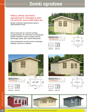 Osłony Domki ogrodowe Pełna oferta domków ogrodowych dostępna jest na stronie www.palmako.ee Istnieje możliwość zastosowania systemu odprowadzenia wody. 276 Domek Lotta Czas oczekiwania na domki spoza niniejszego katalogu wynosi ok. 6 tygodni. 7.3 m2 276 nr kat. FRB28-2929-4 330 Domki wykonane są z drewna suchego, przygotowanego do malowania lub impregnacji. Istnieje możliwość wyboru rodzaju pokrycia dachowego (papa, gont, blacha trapezowa). 340 276 4.7 m2 nr kat. FRF28-3832-2 350 230 nr kat. FRC28-2920 28 mm 245 cm Domki ogrodowe 234 cm 28 10.4 m2 424 335 28 mm 360 Domek Klara 2 180 Domek Klara 234 cm Domki wykonane są z drewna suchego, przygotowanego do malowania lub impregnacji. 300 28 mm nr kat. FRB28-4925 309 6.0 m2 250 309 nr kat. FRB28-2524 294 28 mm 221 cm 264 Domek Lara 2 250 5.9 m2 6.0 m2 250 250 Domek Lara 536 28 mm 221 cm Istnieje możliwość wyboru rodzaju pokrycia dachowego (papa, gont, blacha trapezowa). 29 Osłony Domki ogrodowe 240 300 nr kat. FRB28-2632 Domki ogrodowe 28 mm 30 214 cm 6.9 m2 264 Domek Stella nr kat. FRC28-2518 340 Domek Ella 28 mm 251 cm Domek Ragnar 1 Domek Ragnar 2 nr kat. ELQ16-2209-1 nr kat. ELQ16-2209-A 16 mm 207 cm 16 mm 177 cm Domki wykonane są z drewna suchego, przygotowanego do malowania lub impregnacji.
