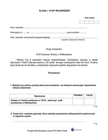 KLASA I - ETAP WOJEWÓDZKI Kod ucznia Imię i nazwisko .................................................................................................................... Gimnazjum nr ....... w ..................................................................... suma punktów ............. Imię i nazwisko nauczyciela przygotowującego ....................................................................................... (wypełnić drukowanymi literami) Drogi Uczestniku XVIII Konkursu Wiedzy o Wielkopolsce Witamy Cię w zawodach stopnia wojewódzkiego. Gratulujemy sukcesu w etapie rejonowym. Przed Tobą test złożony z 20 zadań. Na jego rozwiązanie masz 45 minut. Prosimy abyś starał się nie skreślać, a odpowiedzi wpisywał czytelnie długopisem lub piórem. Powodzenia! 1. Wyjaśnij czy podane poniżej zdanie jest prawdziwe, czy fałszywe zaznaczając odpowiednią rubrykę odpowiedzi. Wydarzenie PRAWDA FAŁSZ Rozejm w Trewirze podpisany w 1918r., zakończył walki powstańcze w Wielkopolsce /1 p. 2. Podaj imię i nazwisko generała, który oddziały powstańców wielkopolskich przeformował w regularne wojsko. …………………………………………………………………………………………………. /1 p. Projekt dofinansowany przez PKO Bank Polski 3. W jednej z sal poznańskiego ratusza znajduje się jedyny w Polsce posag króla Stanisława Augusta Poniatowskiego, przedstawiający władcę w zbroi z konstytucją majową w prawej ręce. Podaj nazwę tej sali. ..................................................................................................................................... /1 p. 4. Jaki był główny cel działania Poznańskiego Towarzystwa Przyjaciół Nauk? ………………………………………………………………………………………….………… /1 p. 5. Jakie wydarzenie z okresu II wojny światowej upamiętnia niezwykły pomnik w kształcie kapliczki, odsłonięty w 40 lecie pamiętnych okupacyjnych wydarzeń w Janowie k/Kostrzyna w powiecie średzkim? ………………………………………………………………………………………….………… /1 p. 6. Władysław Niegolewski był inicjatorem upamiętnienia 200 rocznicy wielkiego zwycięstwa polskiego oręża. W tym celu wielu wielkopolskich kościołach pojawiły się żeliwne tablice upamiętniające to wydarzenie. Podaj nazwę wydarzenia upamiętnionego w ten sposób. …………………………………………………………………..………………………………… /1 p. 7. Rocznica jakich wydarzeń, opisanych poniżej, jest obchodzona co roku w Poznaniu. „W ciągu dnia kwiaty składane pod tablicami upamiętniającymi śmierć Romka Strzałkowskiego i Petera Mansfelda oraz na ulicy Kochanowskiego, gdzie zginęło najwięcej poznaniaków.” ……………………………………………………………………………………………………. /1 p. 8. Łuk Napoleona lub Brama Triumfalna Napoleona to nazwa budowli upamiętniającej pobyt cesarza Napoleona w Wielkopolsce. Podaj nazwę miejscowości, w której ta budowla się znajduje. ……………………………………………………………………………………………..……… /1 p. 9. Wymień jeden z czynników sprzyjający szybkiej polonizacji Bambrów. ……………………………………………………………………………….……………………. /1 p. 10. Do podanej charakterystyki dopisz imię i nazwisko prezentowanej postaci: Uczestnik wojen napoleońskich, podczas których dosłużył się stopnia rotmistrza, od 1830 r. mieszkaniec Wągrowca, w swym testamencie znaczne sumy przeznaczył na cele charytatywne. Był pomysłodawcą własnego, niezwykłego grobowca w kształcie 6-metrowej kamiennej piramidy wzniesionej na pagórku niedaleko Wągrowca, przy szosie prowadzącej w stronę Gniezna. ……………………………………………………………..……………………………………. /1 p. 11. Wydarzenia jakiego powstania upamiętnione zostały w opisany poniżej sposób: „Głównym miejscem pamięci o tym powstaniu jest pomnik obok kościoła w Miłosławiu, przed którym stoją urny z ziemią z sześciu innych miejsc walk powstańczych„ ……………………………………………………………………………………………………… /1 p. 12. Podaj imię i nazwisko postaci scharakteryzowanej poniżej: „Był biskupem poznańskim, znanym humanistą, absolwentem uniwersytetów w Rzymie i Bolonii. W Poznaniu zasłynął m.in. jako twórca uczelni o nazwie Academia Lubransciana.” …………………………………………………………………………….………………………… /1 p. 13. Podane poniżej zdanie zapisz w języku gwarowym. Wyrzuć to przygotowane wiadro z rupieciami. ………………………………………………………………………………………..…………….. /1 p. 14. Ułóż 1 logiczne zdanie w gwarze poznańskiej wykorzystując wszystkie podane niżej wyrażenia gwarowe, użyte w odpowiednim przypadku: rojber, frechowny, trzewiki, lajsnąć ……………………………………………………………………………………………………… ……………………………………………………………………………………………………… /1 p. 15. Jaką nazwę nosiło wysokie nakrycie głowy zdobione kwiatami i wstążkami, noszone przez Bamberki do stroju świątecznego? …………………………………………………………………………………………………….… /1 p. 16. Którego z książąt piastowskich, uczestnika zjazdu w Gąsawie, upamiętnia pomnik znajdujący się w Marcinkowie Górnym? ………………………………………………………………………………………………………. /1 p. 17. Ku czci, którego 