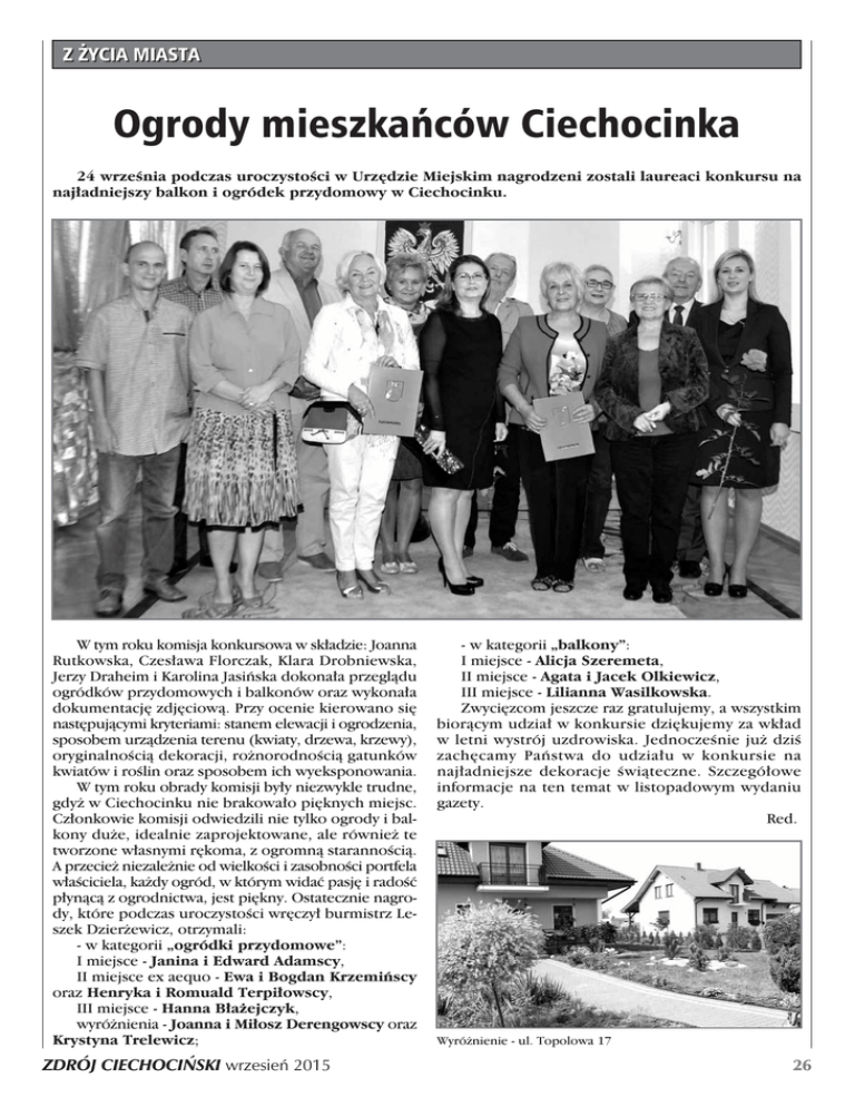Z ˚YCIA MIASTA Ogrody mieszkaƒców Ciechocinka 24 wrzeÊnia podczas uroczystoÊci w Urz´dzie Miejskim nagrodzeni zostali laureaci konkursu na naj∏adniejszy balkon i ogródek przydomowy w Ciechocinku. W tym roku komisja konkursowa w sk∏adzie: Joanna Rutkowska, Czes∏awa Florczak, Klara Drobniewska, Jerzy Draheim i Karolina Jasiƒska dokona∏a przeglàdu ogródków przydomowych i balkonów oraz wykona∏a dokumentacj´ zdj´ciowà. Przy ocenie kierowano si´ nast´pujàcymi kryteriami: stanem elewacji i ogrodzenia, sposobem urzàdzenia terenu (kwiaty, drzewa, krzewy), oryginalnoÊcià dekoracji, ro˝norodnoÊcià gatunków kwiatów i roÊlin oraz sposobem ich wyeksponowania. W tym roku obrady komisji by∏y niezwykle trudne, gdy˝ w Ciechocinku nie brakowa∏o pi´knych miejsc. Cz∏onkowie komisji odwiedzili nie tylko ogrody i balkony du˝e, idealnie zaprojektowane, ale równie˝ te tworzone w∏asnymi r´koma, z ogromnà starannoÊcià. A przecie˝ niezale˝nie od wielkoÊci i zasobnoÊci portfela w∏aÊciciela, ka˝dy ogród, w którym widaç pasj´ i radoÊç p∏ynàcà z ogrodnictwa, jest pi´kny. Ostatecznie nagrody, które podczas uroczystoÊci wr´czy∏ burmistrz Leszek Dzier˝ewicz, otrzymali: - w kategorii „ogródki przydomowe”: I miejsce - Janina i Edward Adamscy, II miejsce ex aequo - Ewa i Bogdan Krzemiƒscy oraz Henryka i Romuald Terpi∏owscy, III miejsce - Hanna B∏a˝ejczyk, wyró˝nienia - Joanna i Mi∏osz Derengowscy oraz Krystyna Trelewicz; ZDRÓJ CIECHOCI¡SKI wrzesieƒ 2015 - w kategorii „balkony”: I miejsce - Alicja Szeremeta, II miejsce - Agata i Jacek Olkiewicz, III miejsce - Lilianna Wasilkowska. Zwyci´zcom jeszcze raz gratulujemy, a wszystkim bioràcym udzia∏ w konkursie dzi´kujemy za wk∏ad w letni wystrój uzdrowiska. JednoczeÊnie ju˝ dziÊ zach´camy Paƒstwa do udzia∏u w konkursie na naj∏adniejsze dekoracje Êwiàteczne. Szczegó∏owe informacje na ten temat w listopadowym wydaniu gazety. Red. Wyró˝nienie - ul. Topolowa 17 26 I miejsce - ul. Kopernika 37 I miejsce - ul. Lipowa 3/23 II miejsce - ul. Graniczna 16 II miejsce - ul. Ogrodowa 16/1 II miejsce - ul. Wiejska 1b III miejsce - ul. Osiedlowa 7/57 III miejsce - ul. Piaskowa 37a Wyró˝nienie - ul. Topolowa 3