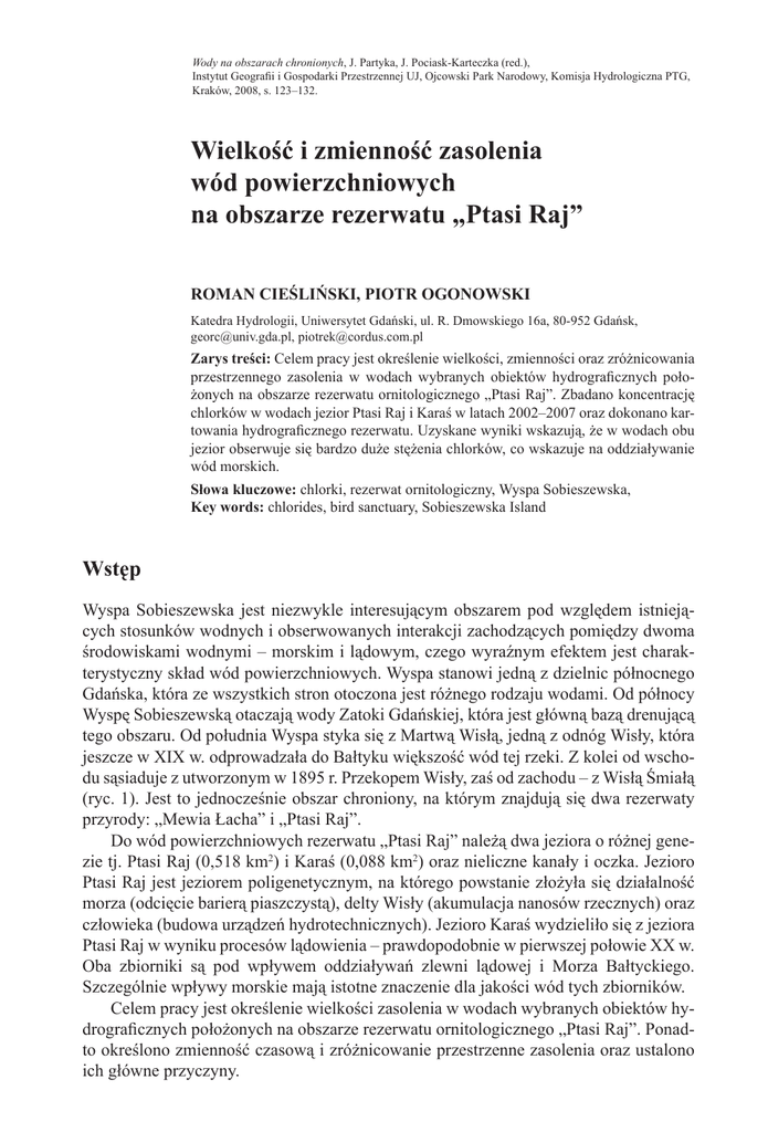 Wody na obszarach chronionych, J. Partyka, J. Pociask-Karteczka (red.), Instytut Geografii i Gospodarki Przestrzennej UJ, Ojcowski Park Narodowy, Komisja Hydrologiczna PTG, Kraków, 2008, s. 123–132. Wielkość i zmienność zasolenia wód powierzchniowych na obszarze rezerwatu „Ptasi Raj” ROMAN CIEŚLIŃSKI, PIOTR OGONOWSKI Katedra Hydrologii, Uniwersytet Gdański, ul. R. Dmowskiego 16a, 80-952 Gdańsk, [email protected], [email protected] Zarys treści: Celem pracy jest określenie wielkości, zmienności oraz zróżnicowania przestrzennego zasolenia w wodach wybranych obiektów hydrograficznych położonych na obszarze rezerwatu ornitologicznego „Ptasi Raj”. Zbadano koncentrację chlorków w wodach jezior Ptasi Raj i Karaś w latach 2002–2007 oraz dokonano kartowania hydrograficznego rezerwatu. Uzyskane wyniki wskazują, że w wodach obu jezior obserwuje się bardzo duże stężenia chlorków, co wskazuje na oddziaływanie wód morskich. Słowa kluczowe: chlorki, rezerwat ornitologiczny, Wyspa Sobieszewska, Key words: chlorides, bird sanctuary, Sobieszewska Island Wstęp Wyspa Sobieszewska jest niezwykle interesującym obszarem pod względem istniejących stosunków wodnych i obserwowanych interakcji zachodzących pomiędzy dwoma środowiskami wodnymi – morskim i lądowym, czego wyraźnym efektem jest charakterystyczny skład wód powierzchniowych. Wyspa stanowi jedną z dzielnic północnego Gdańska, która ze wszystkich stron otoczona jest różnego rodzaju wodami. Od północy Wyspę Sobieszewską otaczają wody Zatoki Gdańskiej, która jest główną bazą drenującą tego obszaru. Od południa Wyspa styka się z Martwą Wisłą, jedną z odnóg Wisły, która jeszcze w XIX w. odprowadzała do Bałtyku większość wód tej rzeki. Z kolei od wschodu sąsiaduje z utworzonym w 1895 r. Przekopem Wisły, zaś od zachodu – z Wisłą Śmiałą (ryc. 1). Jest to jednocześnie obszar chroniony, na którym znajdują się dwa rezerwaty przyrody: „Mewia Łacha” i „Ptasi Raj”. Do wód powierzchniowych rezerwatu „Ptasi Raj” należą dwa jeziora o różnej genezie tj. Ptasi Raj (0,518 km2) i Karaś (0,088 km2) oraz nieliczne kanały i oczka. Jezioro Ptasi Raj jest jeziorem poligenetycznym, na którego powstanie złożyła się działalność morza (odcięcie barierą piaszczystą), delty Wisły (akumulacja nanosów rzecznych) oraz człowieka (budowa urządzeń hydrotechnicznych). Jezioro Karaś wydzieliło się z jeziora Ptasi Raj w wyniku procesów lądowienia – prawdopodobnie w pierwszej połowie XX w. Oba zbiorniki są pod wpływem oddziaływań zlewni lądowej i Morza Bałtyckiego. Szczególnie wpływy morskie mają istotne znaczenie dla jakości wód tych zbiorników. Celem pracy jest określenie wielkości zasolenia w wodach wybranych obiektów hydrograficznych położonych na obszarze rezerwatu ornitologicznego „Ptasi Raj”. Ponadto określono zmienność czasową i zróżnicowanie przestrzenne zasolenia oraz ustalono ich główne przyczyny. 124 Roman Cieśliński, Piotr Ogonowski Ryc. 1. Położenie obszaru badań Fig. 1. Area of investigation Metody badań Główne prace polegały na poborze próbek wody jezior Karaś i Ptasi Raj w latach 2002–2007 w celu oznaczenia stężenia chlorków. Badania laboratoryjne wykonano w Katedrze Hydrologii Uniwersytetu Gdańskiego. Na jeziorze Ptasi Raj wyznaczono cztery punkty pomiarowe, zaś na jeziorze Karaś – dwa (ryc. 2). Dodatkowo jeden punkt wyznaczono na Wiśle Śmiałej i jeden – w Zatoce Gdańskiej. Poboru próbek z jezior dokonywano z trzech warstw – powierzchniowej, przydennej oraz z osadów dennych (wody interstycjalne). W trakcie badań terenowych dokonano kartowania sieci hydrograficznej. Określono wskaźnik trwałości basenu jeziornego BPI według formuły (Kerekes 1977): BPI = gdzie: V – objętość jeziora (tys. m3), L – długość linii brzegowej (km). V L Wielkość i zmienność zasolenia wód powierzchniowych na obszarze rezerwatu „Ptasi Raj” 125 Ryc. 2. Lokalizacja punktów pomiarowych na jeziorze Ptasi Raj i Karaś Fig. 2. Location of measurement sites on Ptasi Raj and Karaś lakes Charakterystyka obszaru badań Rezerwat przyrody „Ptasi Raj” został utworzony w 1959 r. i posiada powierzchnię 18,8 km2. Głównym celem istnienia rezerwatu jest zachowanie kompleksu przybrzeżnych jezior, bagien i wydm, jako miejsca odpoczynku ptaków przelotnych (ryc. 3). Jezioro Ptasi Raj oddziela od morza 300-metrowej szerokości Mierzeja Messyńska, a od Wisły Śmiałej – XIX-wieczna kamienna grobla o szerokości 1,5 m. Na grobli umiejscowione są dwa przepusty umożliwiające okresową wymianę wód rzecznych (Wisła Śmiała) i jeziornych. Dodatkowo, podczas wysokich stanów wód na Wiśle Śmiałej, wywołanych intruzjami wód morskich, w ujściowym odcinku tej rzeki, następują przelewy przez groblę. Powierzchnia zlewni jeziora wynosi 1,4 km2, jego głębokość średnia i maksymalna odpowiednio: 1,3 i 2,6 m, pojemność jeziora – 655 tys. m3, zaś wskaźnik trwałości basenu jeziornego BPI – 144 lata. Powierzchnia zlewni jeziora Karaś wynosi około 1 km2, jego głębokość średnia osiąga 0,7 m, a głębokość maksymalna – 2,5 m. Pojemność jeziora jest równa 60,5 tys. m3, zaś wskaźnik trwałości basenu jeziornego BPI wynosi około 29 lat. W jeziorze Karaś można wyodrębnić dwa akweny: północno-zachodni (ok. 70% całkowitej powierzchni) charakteryzujący się niewielkimi głębokościami, nieprzekraczającymi 1,1 m, oraz drugi – południowo-wschodni, o wyraźnie podłużnym kształcie (ryc. 3). Nieliczne oczka wodne zajmują powierzchnię około 0,005 km2. Zmienność zasolenia i jego przestrzenne zróżnicowanie Stężenie chlorków w wodach jezior Ptasi Raj i Karaś wynosi od 70 do 80% wartości zasolenia wód Zatoki Gdańskiej i jest bardzo zróżnicowane przestrzennie i czasowo. Na 126 Roman Cieśliński, Piotr Ogonowski Ryc. 3. Sieć hydrograficzna o