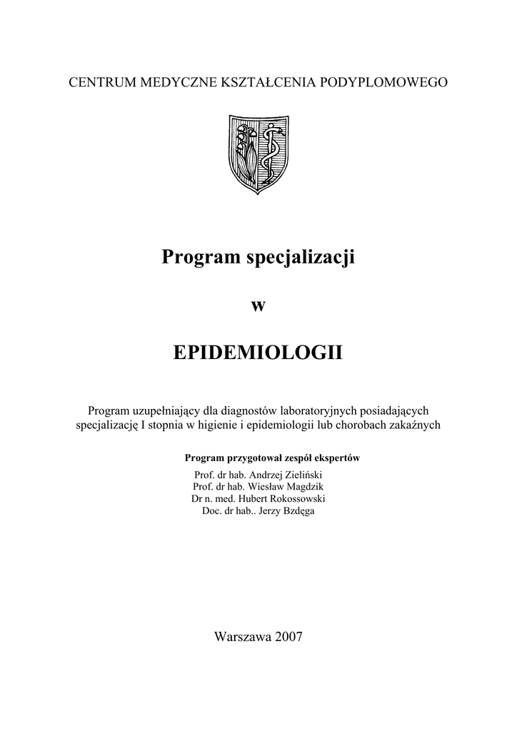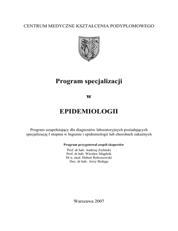 CENTRUM MEDYCZNE KSZTAŁCENIA PODYPLOMOWEGO Program specjalizacji w EPIDEMIOLOGII Program uzupełniający dla diagnostów laboratoryjnych posiadających specjalizację I stopnia w higienie i epidemiologii lub chorobach zakaźnych Program przygotował zespół ekspertów Prof. dr hab. Andrzej Zieliński Prof. dr hab. Wiesław Magdzik Dr n. med. Hubert Rokossowski Doc. dr hab.. Jerzy Bzdęga Warszawa 2007 Epidemiologia - program specjalizacji uzupełniający dla diagnostów laboratoryjnych posiadających specjalizację I stopnia w higienie i epidemiologii lub chorobach zakaźnych I. ZAŁOŻENIA ORGANIZACYJNO-PROGRAMOWE A) - Cele kształcenia specjalizacyjnego Cele edukacyjne Celem kształcenia specjalizacyjnego jest wykształcenie specjalisty epidemiologa jako wykwalifikowanego pracownika posiadającego ogólną wiedzę na temat podstawowych uwarunkowań i mechanizmów występowania zaburzeń stanu zdrowia, najważniejszych chorób i ich następstw, roli i zadań instytucji funkcjonujących w ochronie zdrowia, oraz aktualną wiedzę i umiejętności w zakresie metod epidemiologicznych i biostatystycznych, wiedzę w zakresie szczegółowych działów epidemiologii i umiejętność funkcjonowania w interdyscyplinarnych zespołach. W dążeniu do tego celu zakłada się uzyskanie przez specjalizującego się diagnostę laboratoryjnego pełnego zakresu wymaganej wiedzy oraz wymaganych umiejętności praktycznych, nakreślonych przez niniejszy program. Ponadto założeniem kształcenia specjalizacyjnego jest rozwijanie pożądanych cech osobowości specjalizującego się diagnosty laboratoryjnego, kształtowanie postaw etycznych, wypracowanie obowiązku ciągłego samokształcenia, poszerzania i pogłębiania wiedzy i umiejętności praktycznych, oraz wprowadzania nowych osiągnięć do praktyki zawodowej. Uzyskane kompetencje Diagnosta laboratoryjny po ukończeniu specjalizacji w epidemiologii uzyska szczególne kwalifikacje umożliwiające: • • • • • • • • • • • • dokonywanie ocen stanu zdrowia i potrzeb zdrowotnych populacji w oparciu o dostępne informacje oraz podejmowane badania terenowe i formułowanie na tej podstawie wniosków praktycznych, ważnych dla zdrowia ludności i prawidłowego funkcjonowania opieki zdrowotnej; określenie znaczenia poszczególnych czynników środowiskowych i społecznych w kształtowaniu sytuacji zdrowotnej, w tym także umiejętność identyfikacji i eliminacji czynników szkodliwych dla zdrowia; ocenę zespołu czynników warunkujących zdrowie jednostki i społeczeństwa oraz wykorzystanie tej wiedzy do realizowania polityki prozdrowotnej na każdym szczeblu decyzyjnym; planowanie i prowadzenie działań zmierzających do poprawy stanu zdrowia populacji; planowanie i organizowanie akcji profilaktycznej oraz akcji zwalczania zagrożeń czynnikami fizycznymi, chemicznymi i biologicznymi populacji i ich nadzorowanie; planowanie i sporządzanie projektów badań epidemiologicznych; przeprowadzanie badań epidemiologicznych i wyciąganie praktycznych wniosków z uzyskanych wyników; ocenę prac naukowych, w których stosowane są badania epidemiologiczne pod kątem uzasadnienia wyciąganych z nich wniosków; kierowanie siłami i środkami opieki zdrowotnej w sytuacjach kryzysowych; udział w kształtowaniu polityki zdrowotnej w oparciu o współczesną wiedzę z dziedziny medycyny, nauk społecznych i zarządzania, na terenie którym pracuje. zastosowanie technik biologii molekularnej w epidemiologii chorób zakaźnych (wirusowych, bakteryjnych i pasożytniczych), nadzór epidemiologiczny nad zakażeniami szpitalnymi. © CMKP 2007 2 Epidemiologia - program specjalizacji uzupełniający dla diagnostów laboratoryjnych posiadających specjalizację I stopnia w higienie i epidemiologii lub chorobach zakaźnych Ponadto diagnosta laboratoryjny specjalista w epidemiologii uzyska szczególne kwalifikacje umożliwiające: • zajmowanie kierowniczych stanowisk w strukturach ochrony zdrowia różnych szczebli (w zarządzaniu ochroną zdrowia) w szczególności w służbie sanitarnoepidemiologicznej i pokrewnych służbach, zatrudnienia na stanowisku lekarzaepidemiologa w szpitalach i innych zakładach służby zdrowia w administracji służby zdrowia różnych szczebli; • zajmowania stanowisk przede wszystkim w następujących instytucjach i strukturach systemu ochrony zdrowia w Polsce: - Ministerstwo Zdrowia, - urzędy administracji państwowej na różnych poziomach organizacyjnych państwa, - instytuty naukowo-badawcze w obszarze ochrony zdrowia, - wojewódzkie ośrodki zdrowia publicznego, - Instytucje Państwowej Inspekcji Sanitarnej na różnych poziomach administracyjnych, - wyższe uczelnie medyczne, - wieloprofilowe szpitale, - instytucje funkcjonujące o obszarze opieki społecznej, ubezpieczeń, itp. B) Czas trwania specjalizacji Czas trwania specjalizacji podstawowej w epidemiologii dla diagnostów laboratoryjnych posiadających, co najmniej roczny staż pracy wynosi 2 lata (24 miesiące). C) Wymagana wiedza Oczekuje się, że po ukończeniu kształcenia specjalizacyjnego w dziedzinie epidemiologii diagnosta laboratoryjny wykaże się przedstawioną poniżej wiedzą: I. Demografia • • • • • • • • • Źródła danych demograficznych – spis ludności jako podstawowe źródło danych o charakterystyce demograficzno-społecznej ludności, rejestracja ruchu naturalnego – dostępne informacje o urodzeniach i zgonach. Struktura demograficzna ludności Polski i jej przewidywane zmiany. Mierniki poziomu urodzeń (współczynniki urodzeń, płodności, dzietności, reprodukcji brutto i netto) i aktualne trendy urodzeń w Polsce. Mierniki umieralności (rzeczywiste i standaryzowane metodą bezpośrednią i pośrednią współczynniki zgonów, współczynnik utraconych potencjalnych lat życia, tablice trwania życia) i najważniejsze aspekty umieralności mieszkańców Polski. Określenie zakresu dostępnych danych demogr