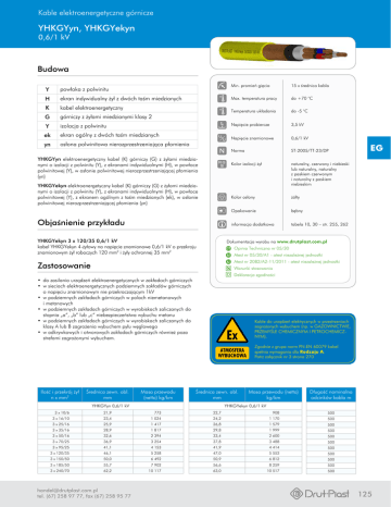 Kable elektroenergetyczne górnicze YHKGYyn, YHKGYekyn 0,6/1 kV Budowa Y powłoka z polwinitu H ekran indywidualny żył z dwóch taśm miedzianych K kabel elektroenergetyczny G górniczy z żyłami miedzianymi klasy 2 Y izolacja z polwinitu ek ekran ogólny z dwóch taśm miedzianych yn osłona polwinitowa nierozprzestrzeniająca płomienia YHKGYyn elektroenergetyczny kabel (K) górniczy (G) z żyłami miedzianymi o izolacji z polwinitu (Y), z ekranami indywidualnymi (H), w powłoce polwinitowej (Y), w osłonie polwinitowej nierozprzestrzeniającej płomienia (yn) YHKGYekyn elektroenergetyczny kabel (K) górniczy (G) z żyłami miedzianymi o izolacji z polwinitu (Y), z ekranami indywidualnymi (H), w powłoce polwinitowej (Y), z ekranem ogólnym z taśm miedzianych (ek), w osłonie polwinitowej nierozprzestrzeniającej płomienia (yn) Objaśnienie przykładu YHKGYekyn 3 x 120/35 0,6/1 kV kabel YHKGYekyn 4-żyłowy na napięcie znamionowe 0,6/1 kV o przekroju znamionowym żył roboczych 120 mm2 i żyły ochronnej 35 mm2 Min. promień gięcia 15 x średnica kabla Max. temperatura pracy do +70 °C Temperatura układania do -5 °C Napięcie probiercze 3,5 kV Napięcie znamionowe 0,6/1 kV Norma ST-2005/TT-23/DP Kolor izolacji żył naturalny, czerwony i niebieski lub naturalny, naturalny z paskiem czerwonym i naturalny z paskiem niebieskim Kolor osłony żółty Opakowanie bębny informacja dodatkowa tabela 10, 30 – str. 255, 262 Dokumentacja wyrobu na www.drutplast.com.pl Opinia Techniczna nr 05/30 Atest nr 05/30/A1 - atest niezależnej jednostki Atest nr 2082/A2-11/2011 - atest niezależnej jednostki Zastosowanie Warunki stosowania Deklaracja zgodności • do zasilania urządzeń elektroenergetycznych w zakładach górniczych • w sieciach elektroenergetycznych podziemnych zakładów górniczych o napięciu znamionowym nie przekraczającym 1kV • w podziemnych zakładach górniczych w polach niemetanowych i metanowych • w podziemnych zakładach górniczych w wyrobiskach zaliczanych do stopnia „a”, „b” lub „c” niebezpieczeństwa wybuchu metanu • w podziemnych zakładach górniczych w wyrobiskach zaliczanych do klasy A lub B zagrożenia wybuchem pyłu węglowego • w odkrywkowych i otworowych zakładach górniczych również poza strefami zagrożonymi wybuchem. Ex ATMOSFERA WYBUCHOWA Ilość i przekrój żył n x mm2 EG Średnica zewn. obl. mm Masa przewodu (netto) kg/km Średnica zewn. obl. mm YHKGYyn 0,6/1 kV Kable do urządzeń elektrycznych w przestrzeniach zagrożonych wybuchem (np. w GAZOWNICTWIE, PRZEMYŚLE CHEMICZNYM I PETROCHEMICZNYM). Zgodnie z grupa norm PN-EN 60079 kabel spełnia wymagania dla Rodzaju A. Patrz załącznik nr 3 strona 270 Masa przewodu (netto) kg/km Długość nominalna odcinków kabla m YHKGYekyn 0,6/1 kV 3 x 10/6 21,9 773 22,7 908 500 3 x 16/10 23,4 1 024 24,2 1 170 500 3 x 25/16 25,9 1 417 26,8 1 579 500 3 x 35/16 28,9 1 817 29,8 1 999 500 3 x 50/16 32,6 2 394 33,4 2 600 500 3 x 70/25 36,9 3 254 37,8 3 488 500 3 x 95/25 41,1 4 153 41,9 4 414 500 3 x 120/35 46,1 5 258 47,0 5 553 500 3 x 150/50 50,0 6 492 50,9 6 812 500 3 x 185/50 55,7 7 902 56,6 8 259 500 3 x 240/70 62,2 10 117 63,0 10 517 500 [email protected] tel. (67) 258 97 77, fax (67) 258 95 77 125