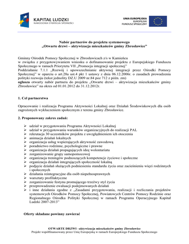 Nabór partnerów do projektu systemowego „Otwarte drzwi – aktywizacja mieszkańców gminy Zbrosławice” Gminny Ośrodek Pomocy Społecznej w Zbrosławicach z/s w Kamieńcu w związku z przygotowywaniem wniosku o dofinansowanie projektu z Europejskiego Funduszu Społecznego w ramach Priorytetu VII „Promocja integracji społecznej” Poddziałanie 7.1.1 „Rozwój i upowszechnianie aktywnej integracji przez Ośrodki Pomocy Społecznej” w oparciu o art.28a ust.4 pkt 1 ustawy z dnia 06.12.2006r. o zasadach prowadzenia polityki rozwoju (tekst jednolity DZ.U 2009 nr.84 poz 712 z późn. zm) ogłasza otwarty nabór partnera do projektu „Otwarte drzwi – aktywizacja mieszkańców gminy Zbrosławice” na okres od 01.01.2012 do 31.12.2012r. 1. Cel partnerstwa Opracowanie i realizacja Programu Aktywności Lokalnej oraz Działań Środowiskowych dla osób zagrożonych wykluczeniem społecznym z terenu gminy Zbrosławice. 2. Proponowany zakres zadań: udział w przygotowaniu Programu Aktywności Lokalnej udział w przygotowaniu warunków organizacyjnych do realizacji PAL rekrutacja 30 uczestników projektu z uwzględnieniem ich otoczenia animacja działań lokalnych organizacja usług wspierających aktywność zawodową poradnictwo rodzinne, psychologiczne i prawne organizacja działań propagujących ideę wolontariatu zorganizowanie grupy samopomocowej organizacja treningów podnoszących kompetencje życiowe i społeczne organizacja działań integrujących społeczność lokalną podjęcie działań służących podniesieniu standardu życia oraz zacieśnieniu więzi rodzinnych i społecznych działania reintegracyjne dla osób niepełnosprawnych warsztaty profilaktyczne zorganizowanie festynu promującego trzeźwy styl życia przeprowadzenie ewaluacji podejmowanych działań i inne działania zgodne z „Zasadami przygotowania, realizacji i rozliczania projektów systemowych Ośrodków Pomocy Społecznej, Powiatowych Centrów Pomocy Rodzinie oraz Regionalnego Ośrodka Polityki Społecznej w ramach Programu Operacyjnego Kapitał Ludzki 2007-2013” Oferty składane powinny zawierać OTWARTE DRZWI –aktywizacja mieszkańców gminy Zbrosławice Projekt współfinansowany przez Unię Europejską w ramach Europejskiego Funduszu Społecznego − charakterystykę działalności z podaniem obszaru działania − opis posiadanego doświadczenia w realizacji podejmowanych działań o podobnym charakterze, którego dotyczy projekt − opis zasobów organizacyjno - technicznych (ze szczególnym uwzględnieniem kwalifikacji kadrowych) − szacunkowy koszt realizacji zadań − planowane narzędzia ewaluacji projektu Do ofert należy dołączyć: − aktualny odpis z rejestru lub odpowiedniego wyciągu z ewidencji lub inne dokumenty stwierdzające status prawny i umocowanie osób reprezentujących oferenta − oświadczenie o nie zaleganiu z płatnościami na rzecz podmiotów publiczno prawnych i wobec innych podmiotów − sprawozdanie merytoryczne i finansowe ( zgodnie z art.45 ust.2 i art.82 ust.1 ustawy z dnia 29.09.1994r. o rachunkowości) za ostatni rok budżetowy − aktualny statut − dane osób odpowiedzialnych za realizację projektu wraz z zobowiązaniem do zatrudnienia przy realizacji projektu osób z odpowiednimi kwalifikacjami i doświadczeniem GOPS zastrzega sobie prawo wnioskowania o uzupełnienie oferty o dokumenty niezbędne do kompleksowej i rzeczowej oceny. Przy wyborze Partnerów w szczególności uwzględnia się: zgodność zakresu działalności z działaniami w projekcie, oferowany wkład w realizację projektu, wykwalifikowaną kadrę, doświadczenie w realizacji podobnych działań Termin składania ofert: do dnia 19.03.2012 roku do godz. 1500 Ogłoszenie wyników zostanie opublikowane w Biuletynie Informacji Publicznej Urzędu Gminy Zbrosławice oraz na stronie internetowej Urzędu Gminy Zbrosławice. Oferty należy składać lub przesyłać w kopercie z dopiskiem „Otwarty nabór partnera do projektu systemowego „Otwarte drzwi – aktywizacja mieszkańców gminy Zbrosławice” na adres: Gminny Ośrodek Pomocy Społecznej w Zbrosławicach z/s w Kamieńcu ul. Tarnogórska 34 42-674 Kamieniec Tel. 32 2330847 W przypadku wysyłania oferty pocztą liczy się data wpływu oferty do siedziby ośrodka GOPS zastrzega sobie prawo do: − wyboru partnera − zmiany zakresu działań w zależności od wyniku rozpatrzenia wniosku przez IP − negocjowania warunków i kosztów realizacji działań przez partnerów − unieważnienia naboru bez podania przyczyny Kierownik GOPS OTWARTE DRZWI –aktywizacja mieszkańców gminy Zbrosławice Projekt współfinansowany przez Unię Europejską w ramach Europejskiego Funduszu Społecznego