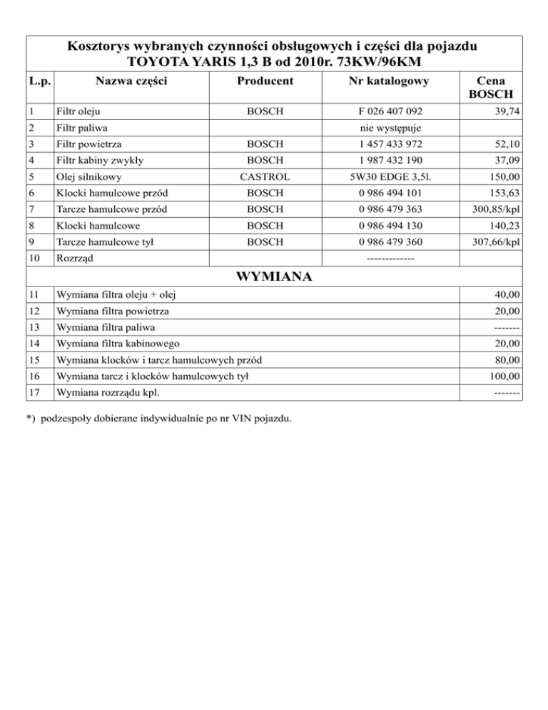 Kosztorys wybranych czynności obsługowych i części dla pojazdu TOYOTA YARIS 1,3 B od 2010r. 73KW/96KM L.p. Nazwa części Producent Nr katalogowy BOSCH F 026 407 092 Cena BOSCH 1 Filtr oleju 39,74 2 Filtr paliwa 3 Filtr powietrza BOSCH 1 457 433 972 52,10 4 Filtr kabiny zwykły BOSCH 1 987 432 190 37,09 5 Olej silnikowy CASTROL 5W30 EDGE 3,5l. 150,00 6 Klocki hamulcowe przód BOSCH 0 986 494 101 153,63 7 Tarcze hamulcowe przód BOSCH 0 986 479 363 300,85/kpl 8 Klocki hamulcowe BOSCH 0 986 494 130 140,23 9 Tarcze hamulcowe tył BOSCH 0 986 479 360 307,66/kpl 10 Rozrząd nie występuje ------------- WYMIANA 11 Wymiana filtra oleju + olej 40,00 12 Wymiana filtra powietrza 20,00 13 Wymiana filtra paliwa ------- 14 Wymiana filtra kabinowego 20,00 15 Wymiana klocków i tarcz hamulcowych przód 80,00 16 Wymiana tarcz i klocków hamulcowych tył 17 Wymiana rozrządu kpl. *) podzespoły dobierane indywidualnie po nr VIN pojazdu. 100,00 -------