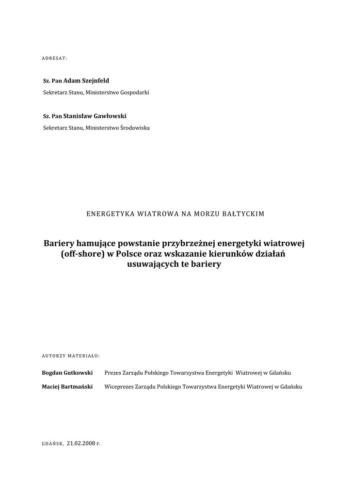ADRESAT: Sz. Pan Adam Szejnfeld Sekretarz Stanu, Ministerstwo Gospodarki Sz. Pan Stanisław Gawłowski Sekretarz Stanu, Ministerstwo Środowiska ENERGETYKA WIATROWA NA MORZU BAŁTYCKIM Bariery hamujące powstanie przybrzeżnej energetyki wiatrowej (off-shore) w Polsce oraz wskazanie kierunków działań usuwających te bariery AUTORZY MATERIAŁU: Bogdan Gutkowski Prezes Zarządu Polskiego Towarzystwa Energetyki Wiatrowej w Gdańsku Maciej Bartmański Wiceprezes Zarządu Polskiego Towarzystwa Energetyki Wiatrowej w Gdańsku GDAŃSK, 21.02.2008 r. 1. Uwarunkowania UE oraz inne wymuszające intensywny rozwój odnawialnych źródeł energii (OZE) a. Będący w fazie opiniowania we wszystkich krajach UE pakiet dotyczący energii i zmian klimatycznych, w skład którego wchodzą między innymi: - projekt dyrektywy ramowej dotyczącej promocji wykorzystania OZE (wskaźnik od osiągnięcia do 2020 roku – udział OZE w całkowitym zużyciu energii 20 % dla całej UE a dla Polski proponuje się ten wskaźnik na razie na poziomie 15%, - dyrektywa dotycząca handlu emisjami (dyskutowane obecnie są zmiany do niej). b. Protokół z Kyoto dotyczący ograniczenia emisji CO2 . Wsparciem dla rozwoju energetyki morskiej jest Uchwała Parlamentu Europejskiego. W dniu 12 lipca 2007 r. odbyło się posiedzenie Parlamentu Europejskiego, który przyjął, pod swoistą nazwą Europejskiej Wizji Oceanów i Mórz, uchwałę w sprawie przyszłej Unijnej Polityki Morskiej. Za przyjęciem niniejszego dokumentu w głównej mierze przesądził fakt dostrzeżenia przez Parlament Europejski stojącej przed państwami UE szansy na zrównoważony rozwój polityki morskiej. Polityki zorientowanej na przyszłość, polegającej na rozsądnym połączeniu ochrony środowiska morskiego z innowacyjnym i racjonalnym korzystaniem z mórz i oceanów. Sprawozdanie Parlamentu w głównej mierze koncentruje się na zmianach klimatycznych, które są priorytetowym wyzwaniem dla polityki morskiej. Ponadto podkreśla, jak ważną rolę mogą odegrać zasoby morskie w kwestii zapobieżenia problemom zmian klimatycznych i globalnego ocieplenia oraz zminimalizowania negatywnych konsekwencji tych zjawisk. Mając na uwadze fakt, iż morskim i przybrzeżnym elektrowniom wiatrowym przypisywany jest istotny potencjał rozwoju oraz znaczący wkład w ochronę klimatu, dokument wzywa Komisję Europejską m. in. do opracowania na dużą skalę strategii działania w sprawie energii wiatrowej off-shore. Niniejsza strategia przyspieszyłaby rozbudowę sieci elektroenergetycznej i jednocześnie przedstawiłaby perspektywy dotyczące sposobu uzyskania przynajmniej 50 GW mocy do roku 2020, a w rezultacie do osiągnięcia zakładanych 20% udziału OZE. Należy podkreślić, że energetyka wiatrowa off-shore może przynieść Europie szereg konkretnych korzyści nie tylko w kluczowej kwestii ochrony klimatu czy wyzwań w dziedzinie energetyki, lecz również w zakresie rozwoju przemysłu, technologii czy tworzenia nowych miejsc pracy. 2. Przewidywane zużycie energii elektrycznej w Polsce do 2020 roku a. przy założeniu 5% rocznego wzrostu gospodarczego w 2020 roku zapotrzebowanie na energię elektryczną w 2020 roku wzrośnie do wielkości około 170 TWh/rocznie. b. przy założeniu spełnienia warunku 15% energii ze źródeł OZE w 2020 roku, zapotrzebowanie na energię elektryczna pochodzącą z OZE wzrośnie do wielkości około 25 TWh/rocznie tyle trzeba będzie wyprodukować w Polsce lub zakupić na wolnym rynku OZE. 3. Zalety przybrzeżnej energetyki wiatrowej i przybliżony potencjał energii wiatru do wykorzystania na obszarach morskich RP Na morzu zlokalizowany jest ogromny potencjał energetyczny możliwy do zagospodarowania, zarówno pod względem obszaru, jak ze względu uzyskania znacznie wyższej produktywności i instalowania turbin wiatrowych o większych mocach, niż w przypadku farm wiatrowych na lądzie. Na morzu prędkość wiatru i jego stabilność są znaczne większe, niż na lądzie. Porównanie możliwości pozyskana energii z lądowych i morskich elektrowni wiatrowych: Dla uzyskania 1 TWh energii elektrycznej rocznie LĄDOWE ELEKTROWNIE WIATROWE MORSKIE ELEKTROWNIE WIATROWE potrzebny teren — około 100 km2 potrzebny teren — około 60 km2 instalacja około 400 MW w siłowniach instalacja około 250 MW w siłowniach Zarówno dla lądowych, jak i morskich elektrowni wiatrowych uzyskanie 1 TWh energii oznacza redukcję emisji 1 mln ton CO2 do atmosfery. Wg wstępnych szacunków realne wydaje się zajęcie na morzu do 2.000 km 2, to jest instalacja elektrowni wiatrowych o łącznej mocy około 8 GW. Dałoby roczne uzyskanie energii elektrycznej około do 32 TWh (to jest więcej niż całe polskie potrzeby energii elektrycznej dla OZE do roku 2020). 4. Przybliżone koszty wprowadzenia przybrzeżnej energetyki wiatrowej i korzyści dla regionów przybrzeżnych Instalując elektrownie wiatrowe na morzu mamy do czynienia z dużymi problemami technicznymi: posadowienie turbin, prowadzenie kabli podwodnych. Pokonanie problemów geologicznych i ekologicznych, wiążące się z koniecznością przeprowadzenia niezbędnych badań. Powoduje to w efekcie znacznie wyższe koszty tych inwestycji – szacuje się, że koszt budowy 1 MW elektrowni wiatrowej off-shore wynosi obecnie około 3 mln EUR – czyli dla 8 000 MW do 2020 r łączny koszt tych inwestycji wyniósłby 24 miliardy EUR (w cenach dzisiejszych), które poniesione zostaną przez inwestorów. a. Jeśli nie wprowadzi się zachęt do inwestycji w sektorze przybrzeżnej energetyki wiatrowej w Polsce, to można przyjąć, że co najmniej 10% tej kwoty zostanie wydane na usługi i produkcję w Polsce (usługi niskokwalifikowane – np. budowa wież i część prac przy fundamentach), co dałoby wpływy rzędu 800 mln PLN rocznie w regionach portowych/stoczniowych – minimum 1500 miejsc pracy do roku 2020. b. Jeśli wprowadzi się zachęty do inwestycji w sektorze przybrzeżnej