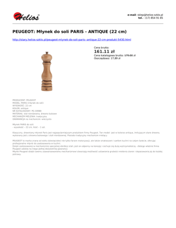 e-mail: [email protected] tel. : (17) 854 91 85 PEUGEOT: Młynek do soli PARIS - ANTIQUE (22 cm) http://stary.helios-szklo.pl/peugeot-mlynek-do-soli-paris--antique-22-cm-produkt-5430.html Cena brutto: 161.11 zł Cena katalogowa brutto: 179.00 zł Oszczędzasz: 17,89 zł PRODUCENT: PEUGEOT MODEL: PARIS (młynek do soli) WYSOKOŚĆ: 22 cm KOLOR: antique NR KATALOGOWY: PG-30988 MATERIAŁ: stal nierdzewna, drewno bukowe MECHANIZM MIELENIA: tradycyjny GWARANCJA na mechanizm: wieczysta Młynek PARIS do soli: - wysokość – 22 cm, ilość – 1 szt. Klasyczny, drewniany młynek Paris jest najpopularniejszym produktem firmy Peugeot. Ten model jest w kolorze antique, imitującym stare drewno, wykonany jest z drewna bukowego i stali nierdzewnej. Posiada tradycyjny mechanizm mielący. PEUGEOT to marka znana od wielu dziesięcioleci nie tylko fanom motoryzacji, ale także smakoszom i szefom kuchni na całym świecie, oferując profesjonalne młynki do zastosowania w kuchni. Dzięki zastosowanej w mechanizmie specjalnej obróbce stali, jest on odporny na korozję i cechuje się dużą wytrzymałością - dlatego właśnie firma Peugeot udziela na niego pełnej dożywotniej gwarancji. Młynki Peugeot dzięki swemu zaawansowanemu mechanizmowi stwarzają możliwość ustawienia grubości mielenia ziaren i dopasowania jej do każdej potrawy.