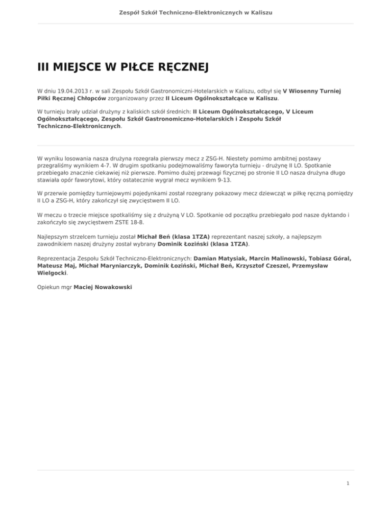 Zespół Szkół Techniczno-Elektronicznych w Kaliszu III MIEJSCE W PIŁCE RĘCZNEJ W dniu 19.04.2013 r. w sali Zespołu Szkół Gastronomiczni-Hotelarskich w Kaliszu, odbył się V Wiosenny Turniej Piłki Ręcznej Chłopców zorganizowany przez II Liceum Ogólnokształcące w Kaliszu. W turnieju brały udział drużyny z kaliskich szkół średnich: II Liceum Ogólnokształcącego, V Liceum Ogólnokształcącego, Zespołu Szkół Gastronomiczno-Hotelarskich i Zespołu Szkół Techniczno-Elektronicznych. W wyniku losowania nasza drużyna rozegrała pierwszy mecz z ZSG-H. Niestety pomimo ambitnej postawy przegraliśmy wynikiem 4-7. W drugim spotkaniu podejmowaliśmy faworyta turnieju - drużynę II LO. Spotkanie przebiegało znacznie ciekawiej niż pierwsze. Pomimo dużej przewagi fizycznej po stronie II LO nasza drużyna długo stawiała opór faworytowi, który ostatecznie wygrał mecz wynikiem 9-13. W przerwie pomiędzy turniejowymi pojedynkami został rozegrany pokazowy mecz dziewcząt w piłkę ręczną pomiędzy II LO a ZSG-H, który zakończył się zwycięstwem II LO. W meczu o trzecie miejsce spotkaliśmy się z drużyną V LO. Spotkanie od początku przebiegało pod nasze dyktando i zakończyło się zwycięstwem ZSTE 18-8. Najlepszym strzelcem turnieju został Michał Beń (klasa 1TZA) reprezentant naszej szkoły, a najlepszym zawodnikiem naszej drużyny został wybrany Dominik Łoziński (klasa 1TZA). Reprezentacja Zespołu Szkół Techniczno-Elektronicznych: Damian Matysiak, Marcin Malinowski, Tobiasz Góral, Mateusz Maj, Michał Maryniarczyk, Dominik Łoziński, Michał Beń, Krzysztof Czeszel, Przemysław Wielgocki. Opiekun mgr Maciej Nowakowski 1