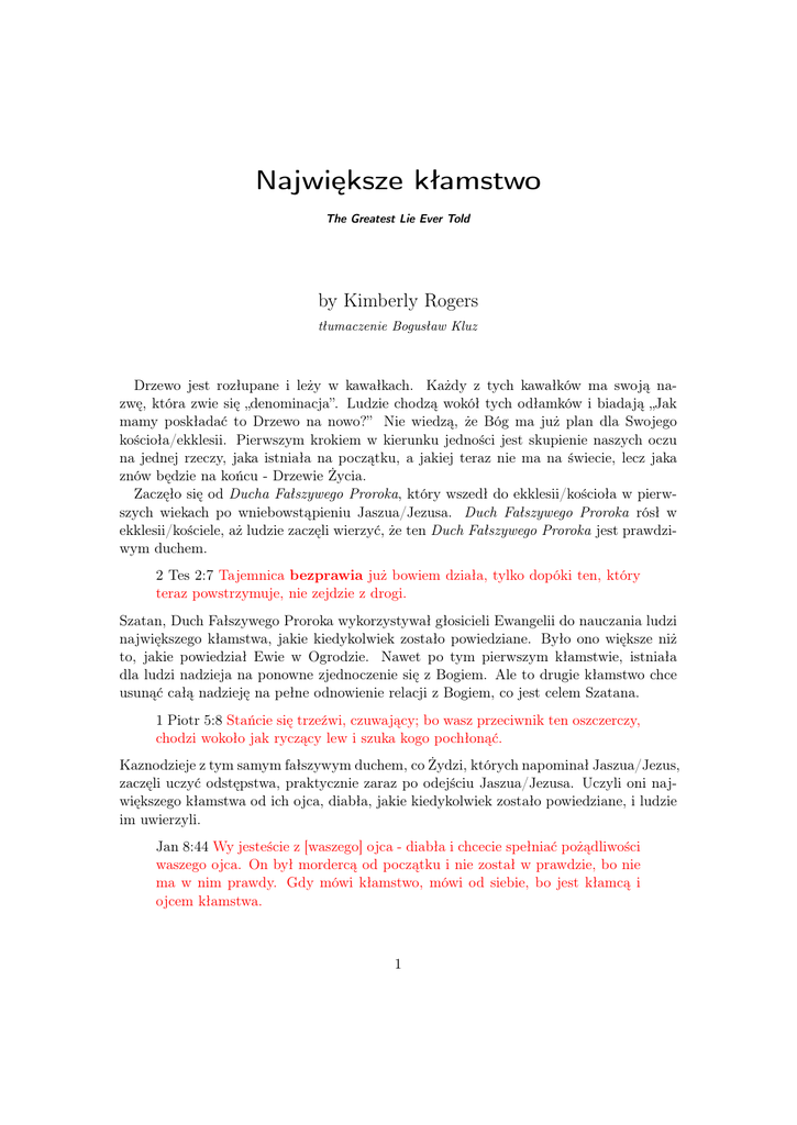 Największe kłamstwo The Greatest Lie Ever Told by Kimberly Rogers tłumaczenie Bogusław Kluz Drzewo jest rozłupane i leży w kawałkach. Każdy z tych kawałków ma swoją nazwę, która zwie się „denominacja”. Ludzie chodzą wokół tych odłamków i biadają „Jak mamy poskładać to Drzewo na nowo?” Nie wiedzą, że Bóg ma już plan dla Swojego kościoła/ekklesii. Pierwszym krokiem w kierunku jedności jest skupienie naszych oczu na jednej rzeczy, jaka istniała na początku, a jakiej teraz nie ma na świecie, lecz jaka znów będzie na końcu - Drzewie Życia. Zaczęło się od Ducha Fałszywego Proroka, który wszedł do ekklesii/kościoła w pierwszych wiekach po wniebowstąpieniu Jaszua/Jezusa. Duch Fałszywego Proroka rósł w ekklesii/kościele, aż ludzie zaczęli wierzyć, że ten Duch Fałszywego Proroka jest prawdziwym duchem. 2 Tes 2:7 Tajemnica bezprawia już bowiem działa, tylko dopóki ten, który teraz powstrzymuje, nie zejdzie z drogi. Szatan, Duch Fałszywego Proroka wykorzystywał głosicieli Ewangelii do nauczania ludzi największego kłamstwa, jakie kiedykolwiek zostało powiedziane. Było ono większe niż to, jakie powiedział Ewie w Ogrodzie. Nawet po tym pierwszym kłamstwie, istniała dla ludzi nadzieja na ponowne zjednoczenie się z Bogiem. Ale to drugie kłamstwo chce usunąć całą nadzieję na pełne odnowienie relacji z Bogiem, co jest celem Szatana. 1 Piotr 5:8 Stańcie się trzeźwi, czuwający; bo wasz przeciwnik ten oszczerczy, chodzi wokoło jak ryczący lew i szuka kogo pochłonąć. Kaznodzieje z tym samym fałszywym duchem, co Żydzi, których napominał Jaszua/Jezus, zaczęli uczyć odstępstwa, praktycznie zaraz po odejściu Jaszua/Jezusa. Uczyli oni największego kłamstwa od ich ojca, diabła, jakie kiedykolwiek zostało powiedziane, i ludzie im uwierzyli. Jan 8:44 Wy jesteście z [waszego] ojca - diabła i chcecie spełniać pożądliwości waszego ojca. On był mordercą od początku i nie został w prawdzie, bo nie ma w nim prawdy. Gdy mówi kłamstwo, mówi od siebie, bo jest kłamcą i ojcem kłamstwa. 1 Dlaczego ludzie w to uwierzyli? I co było tym kłamstwem? – Ludzie uwierzyli kłamstwu, bo chcieli wierzyć „tajemnicy bezprawia, która już działała”. 2 Tes 2:10-11 ... i całego podstępu niesprawiedliwości tych, którzy giną, ponieważ nie przyjęli miłości prawdy, aby dostąpić zbawienia. I dlatego Bóg wystawia ich na działanie oszustwa, po to, by uwierzyli kłamstwu. Fałszywy Duch już działał, by odciągnąć Wierzących na bok. Bóg zezwolił na to, do czasu aż żniwo dojrzeje, kiedy to Fałszywy Duch nie będzie już tylko Duchem wewnątrz kościoła, ale przywdzieje fizyczną formę. 2 Tes 2:7 Tajemnica bezprawia już bowiem działa, tylko dopóki ten, który teraz powstrzymuje, nie zejdzie z drogi. Obj 14:15 A inny anioł wyszedł ze świątyni, wołając donośnym głosem do tego, który siedział na obłoku: Zapuść swój sierp i żnij, gdyż nadeszła dla ciebie pora, abyś żął, bo dojrzało żniwo ziemi. Kiedy czas dojrzeje, kłamliwy Fałszywy Duch stanie się prawdziwie fizycznym człowiekiem, zwanym Antychrystem. Przez 2000 lat historii, duch Antychrysta był po prostu tym - duchem, jaki działał w umysłach Wierzących, by utrzymać wiarę w największe kłamstwo, jakie zostało kiedykolwiek powiedziane. Lecz pewnego dnia, ten Fałszywy Duch pojawi się jako człowiek. 2 Tes 2:9 Jego [Fałszywego Ducha w fizycznej postaci] przyjście jest według działania szatana w całej mocy, pośród znaków, fałszywych cudów. Musimy zrozumieć naturę i ogrom Największego Kłamstwa. Ale co to jest to Największe Kłamstwo? To kłamstwo, które jest tak destrukcyjne, że jego skutki są nie do określenia. Tym kłamstwem jest to, że część Bożego Słowa jest martwa, nieżywa. Większość Wierzących zaprzeczy, że w coś takiego wierzy, jednakże odrzuca fundament, na jakim opiera się Biblia. Wierzący przyjmują i akceptują część Bożego Słowa, lecz odrzucają pozostałe części, ponieważ nauczono ich, że część Bożego Słowa „umarła” na krzyżu. Którą część Biblii Wierzący chrześcijanie odrzucali przez prawie 2000 lat? Torę lub jak się ją powszechnie zwie Prawo, Zakon, która została zaznaczona do umarcia. Tora to pierwsze pięć ksiąg Biblii. To jedyna część Biblii, jaką odrzucają Chrześcijanie. Pozostałe Pisma i Prorocy są akceptowane. Akceptowani przez chrześcijan są zwłaszcza Prorocy, ze względu na ich proroctwa końca czasów. Chrześcijanie nie wiedzą, że Tora jest bogatsza w proroctwa, niż jakakolwiek inna księga w Biblii. Zatem to Tora, pierwsze pięć ksiąg Biblii, jest postrzegana przez chrześcijan jako zakurzony, przestarzały i nieistotny zestaw ciężkich i uciążliwych praw, które zostały przybite do krzyża i unieważnione przez Jaszua/Jezusa. Ateiści wierzą, że Bóg jest martwy, lecz sami Boży ludzie wierzą, że część Jego Słowa jest martwa. Te dwa poglądy mają taki sam efekt – zabijają Boga. Bóg jest uśmiercany 2 wiarą, że Jego Słowo jest martwe, dlatego że Bóg JEST Swoim Słowem. Ci sami Wierzący nie zastanawiają się nad tajemnicą, która przed nimi leży, by zastanowić się głębiej nad tym, co miał na myśli Jan w pierwszych wersetach swojej ewangelii. Boże Słowo istniało już przed założeniem świata. A jakie Słowo istniało przed założeniem świata? Jaszua/Jezus. Jan 1:1-3 Na początku było Słowo; Słowo było u Boga i Bogiem było Słowo. Ono było na początku u Boga. Wszystko dzięki Niemu się stało i bez Niego nie stało się nic, co istnieje. Jaszua/Jezus jest tym Słowem, o którym mówił Jan, a tym Słowem jest Tora. W czasach, gdy pisał Jan, powszechnym określeniem stosowanym przez Żydów na Torę było „Słowo”. Jan, pisząc ten fragment, w szczególności odnosił się do Tory. Jaszua/Jezus jest tym samym Słowem/Torą, które stało w Ogrodzie. On JEST 